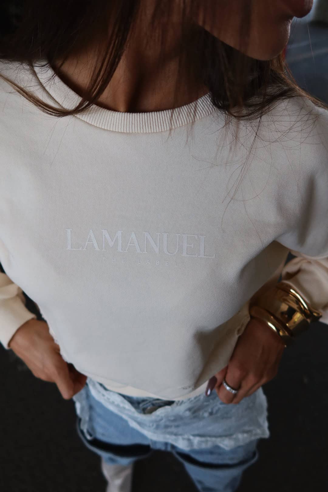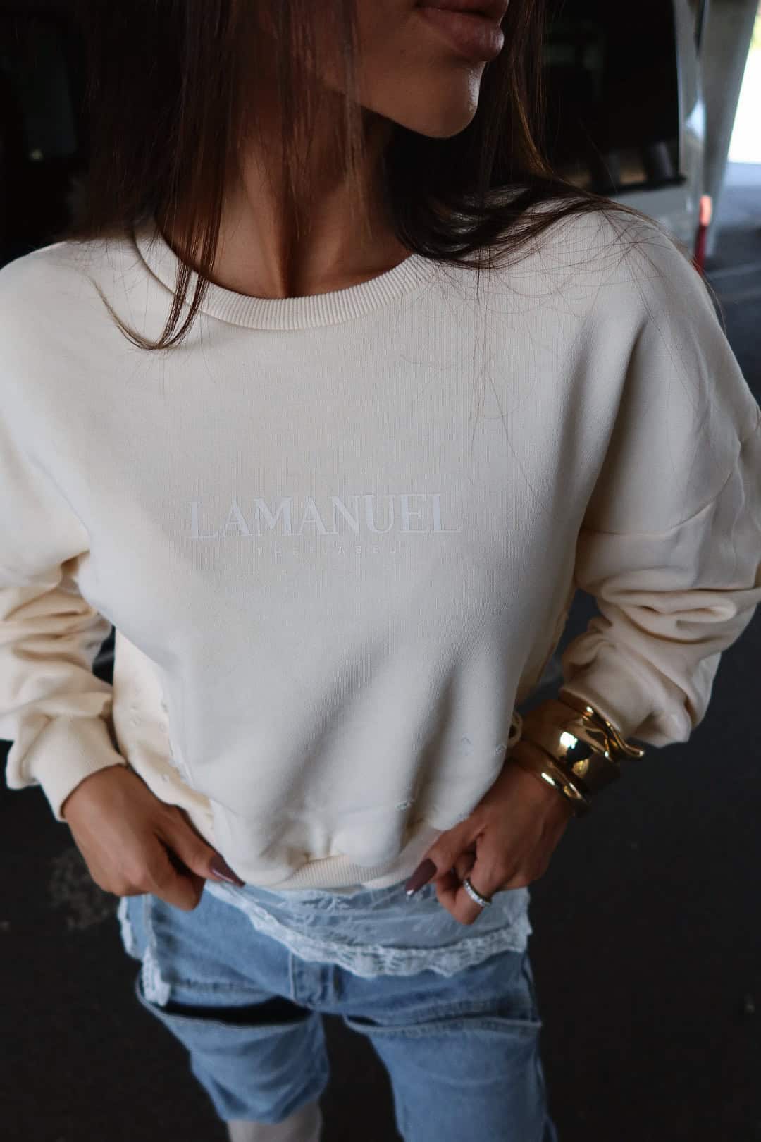 Bluza o swobodnym fasonie, ozdobiona ręcznie wykonanymi przetarciami, które nadają jej surowy, miejski charakter. Minimalistyczne logo i klasyczna forma równoważą styl vintage z nowoczesnym luzem. Idealna do jeansów, spodni cargo lub shortów.Skład: 90% bawełna 10% poliester
