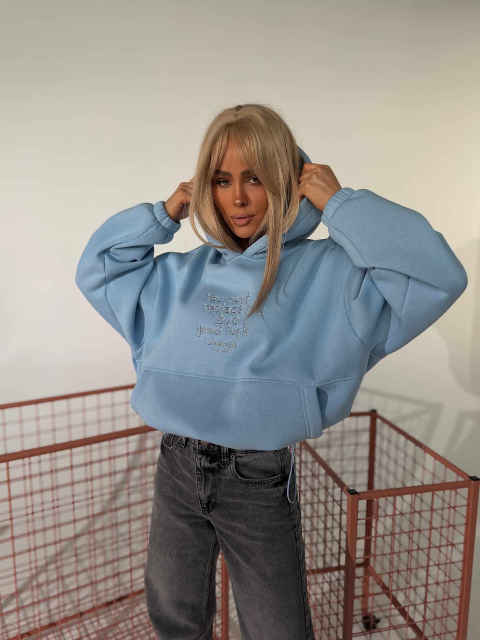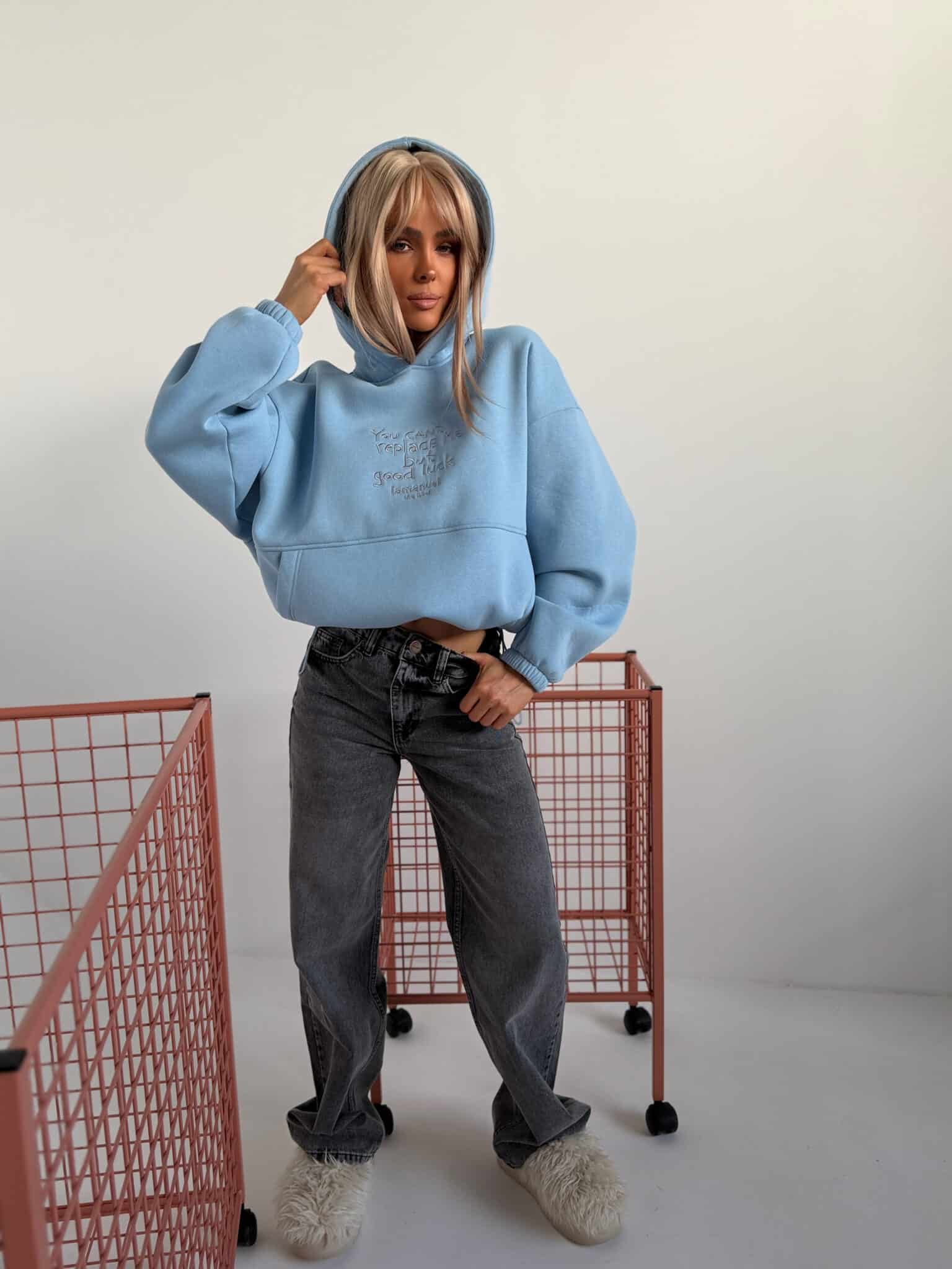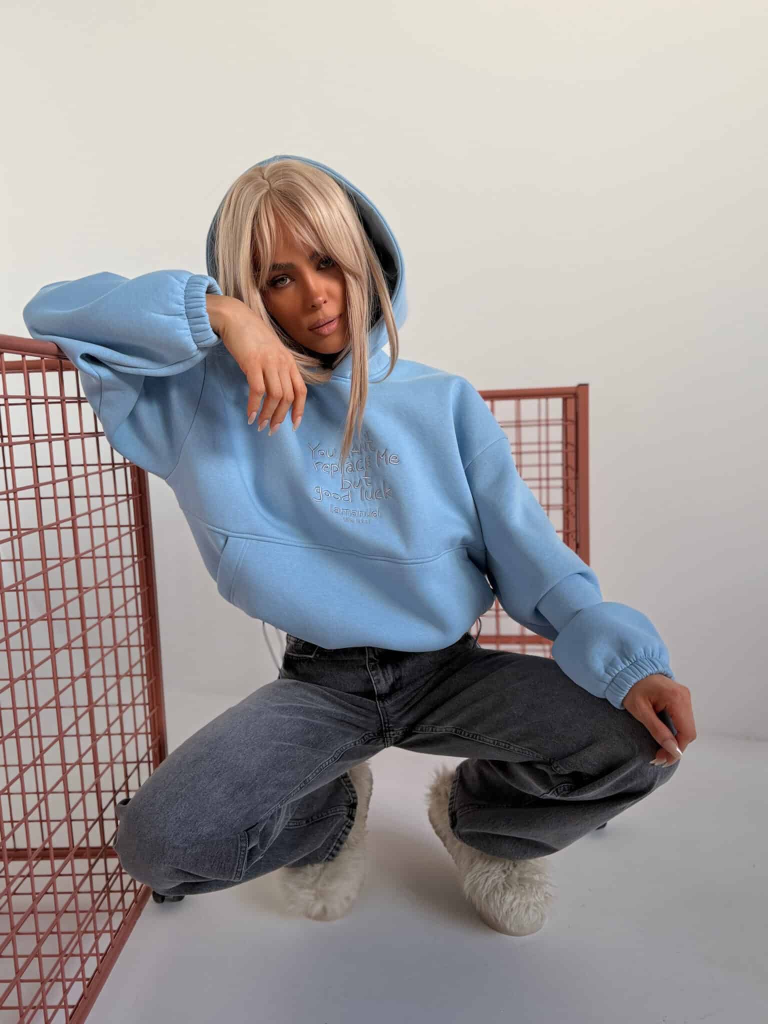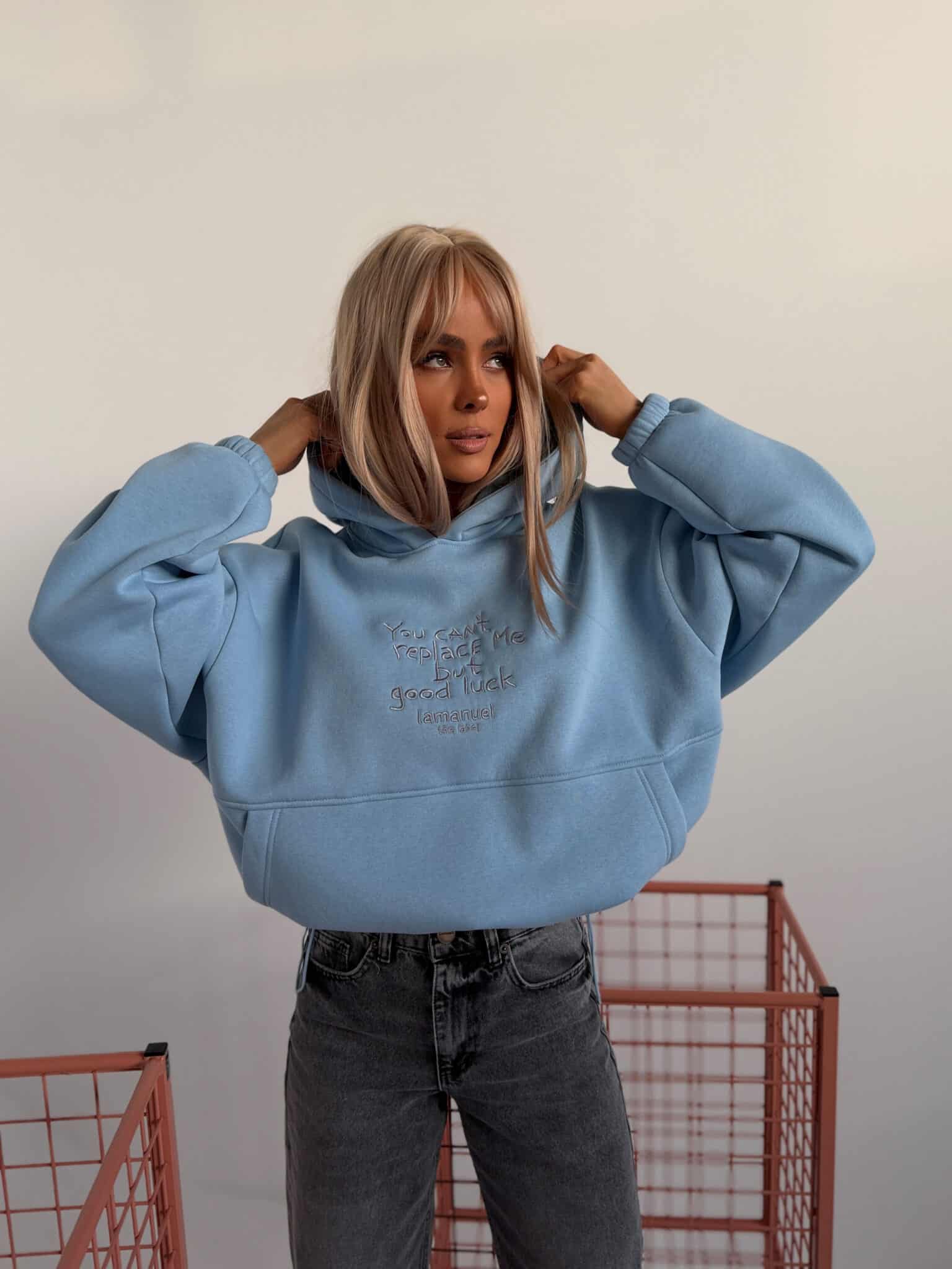 Bluza z haftem, regulacją i nietypową kieszeniąGrubsza dzianina drapana – miękka, puszysta od spodu, trzymająca formę. Krój oversize z szerokim rękawem i dużym kapturem. Haft z przodu z przekazem, który nie wymaga tłumaczenia. Kieszeń typu kangurka – wszyta niestandardowo, schowana, z czystą linią. Dół bluzy regulowany – możesz nosić ją krócej, z efektem bombki, albo opuścić niżej i puścić luzem. Jeden fason, dwa zupełnie różne efekty.Skład: 90% bawełna 10% poliester