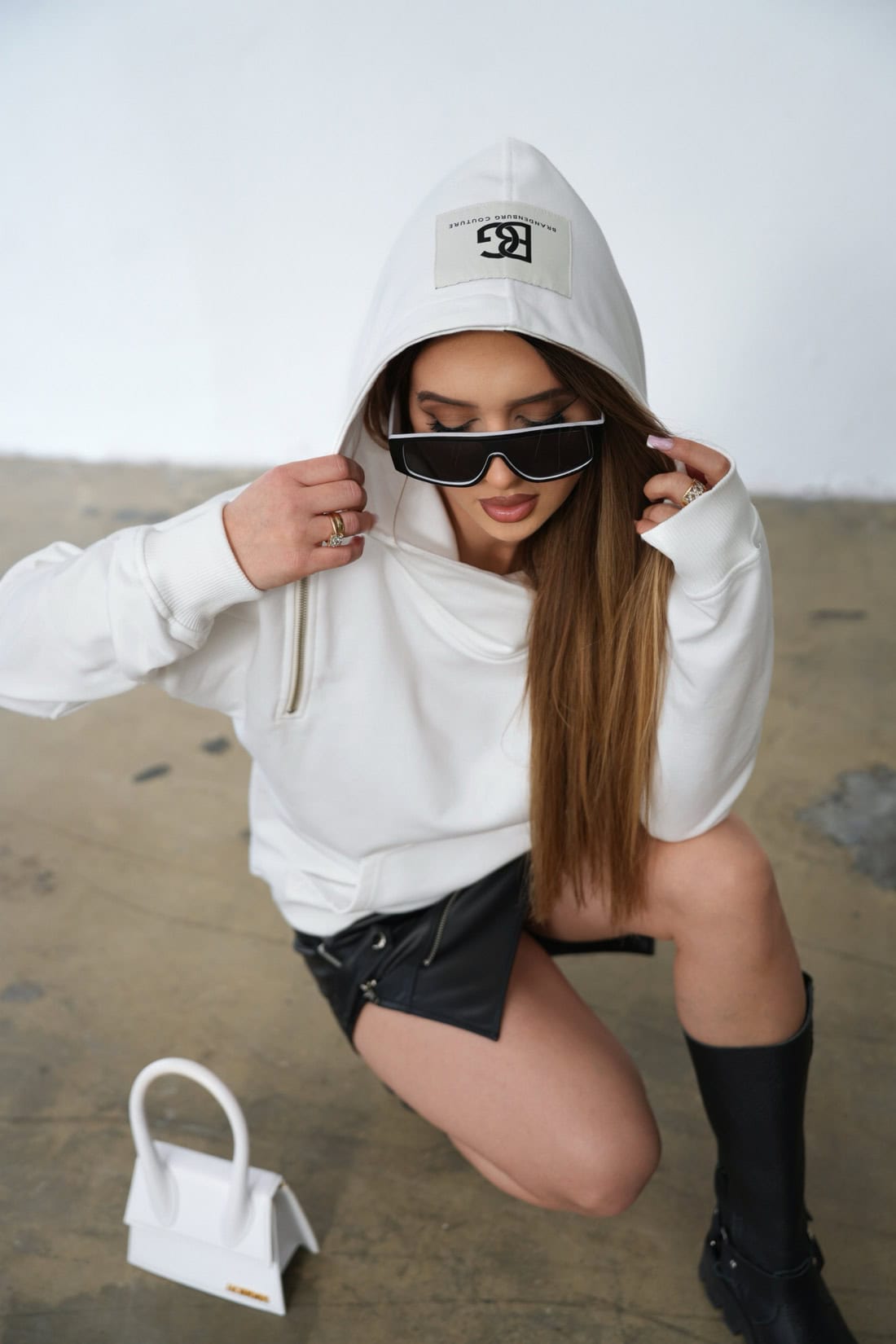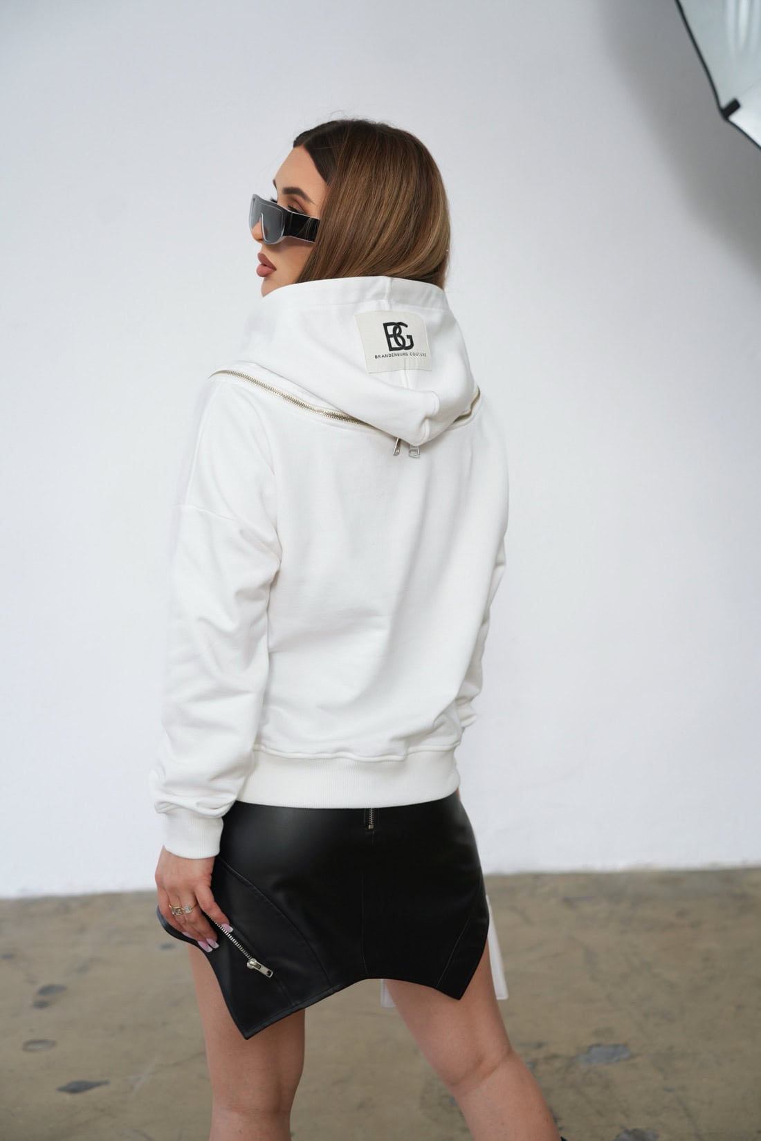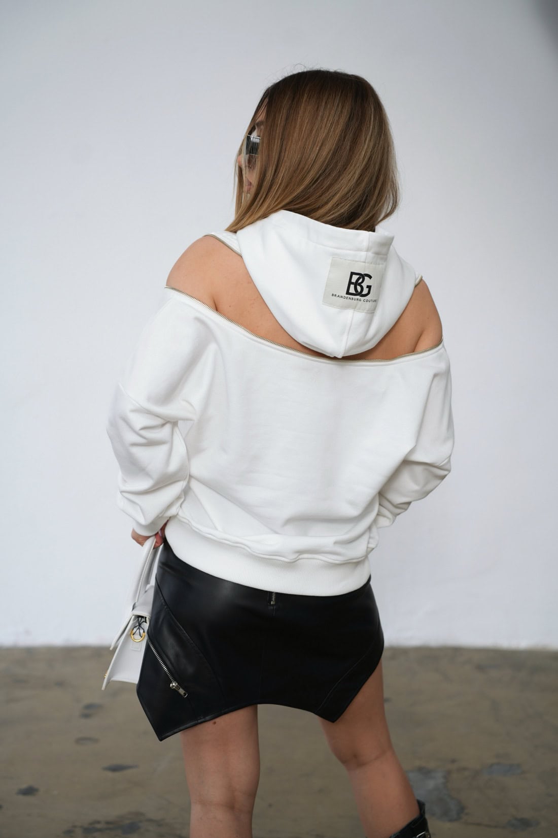 Opis produktu: Bluza damska BG BECKY z wysokiej jakości bawełny nieocieplanej. Bluza z kapturem z naszywką z logo marki BG Brandenburg Couture. Na plecach ozdobny suwak dwumaszynkowy z możliwością rozpięcia. Bluza wykończona ściągaczami.