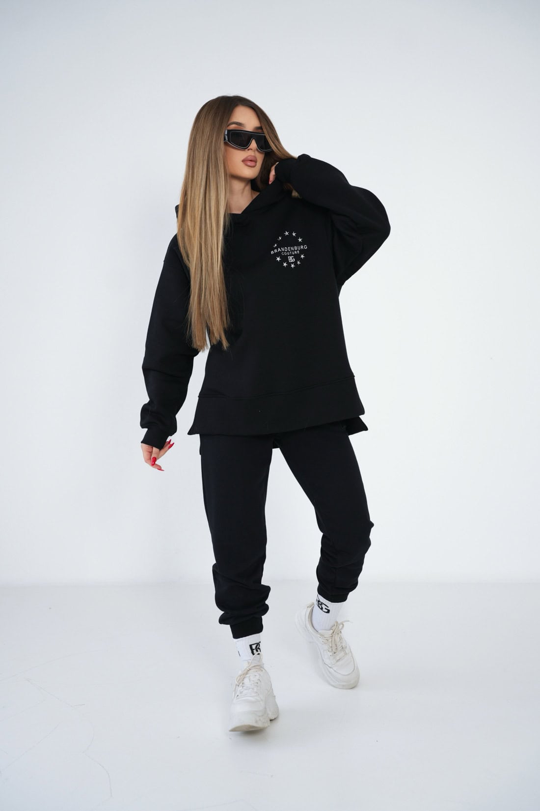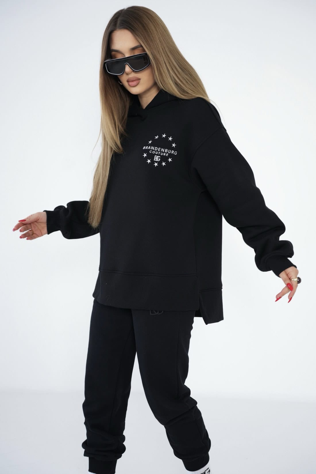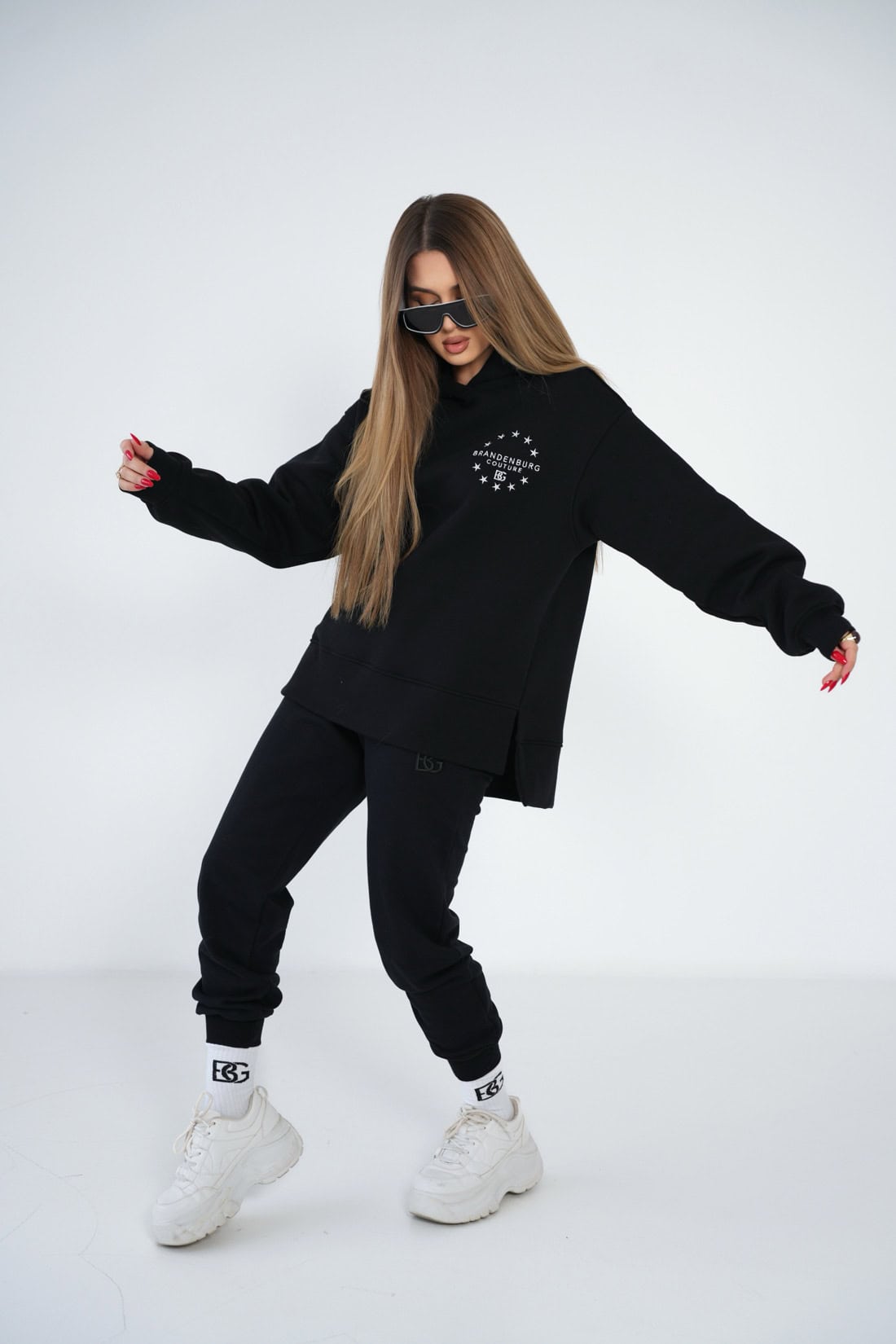 Opis produktu: Oversizowa bluza damska. Gruba, ocieplana od środka dzianina dresowa – mięciutka, ciepła, z delikatnym meszkiem wewnątrz. Bluza z kapturem. Rozcięcia po bokach. Na przodzie haftowane logo marki BG Brandenburg Couture w kontrastowym kolorze.
