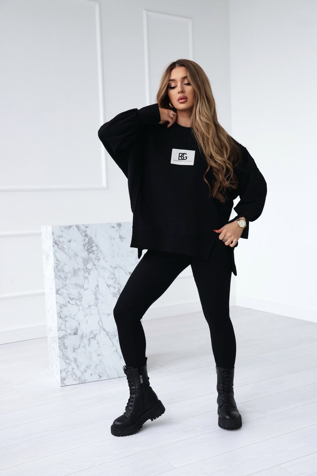 Opis produktu: Bluza damska BG KATE z wysokiej jakości bawełny nieocieplanej. Bluza nierozpinana z bawełnianą naszywką z logo marki BG Brandenburg Couture na środku klatki. Bluza wykończona ściągaczami z dodatkowymi pęknięciami. Dodatkowo na przodzie oraz tyle ozdobne przeszycia.