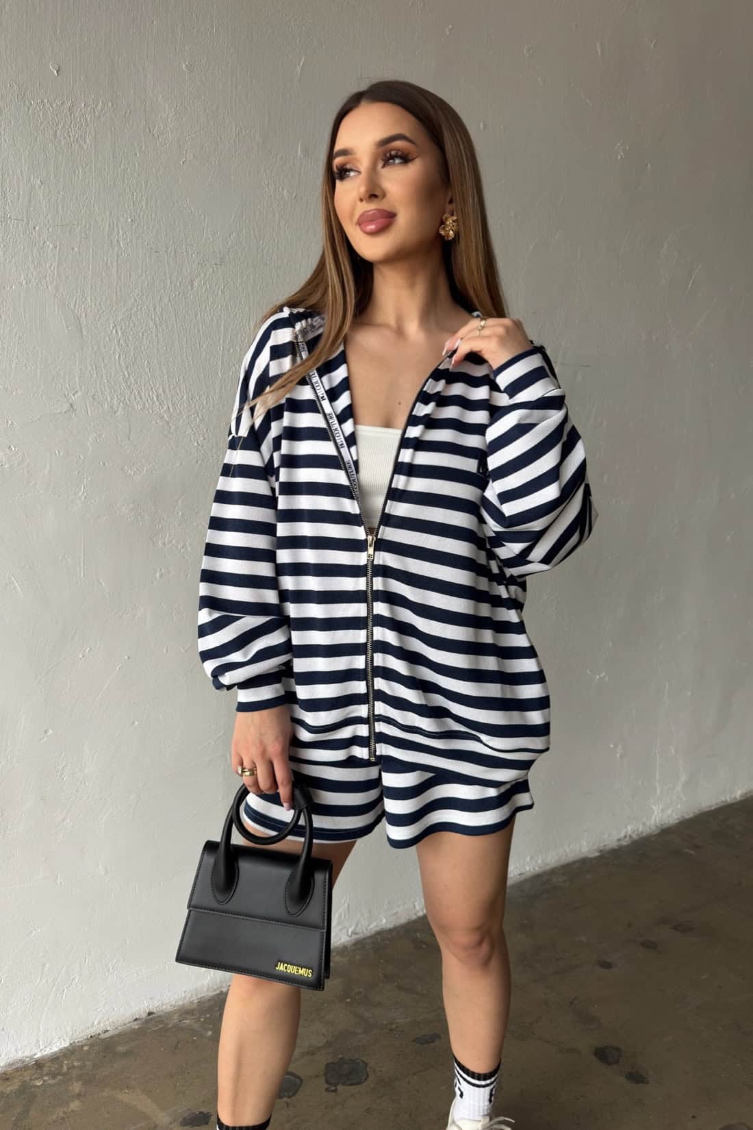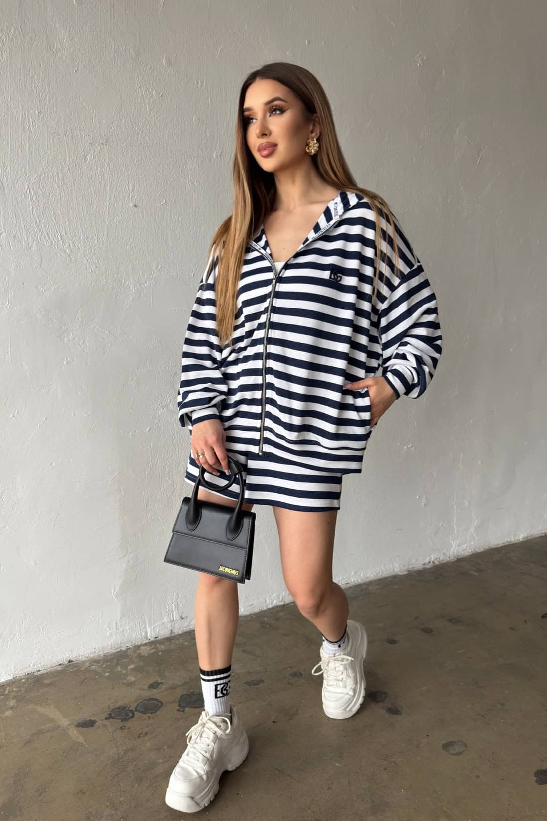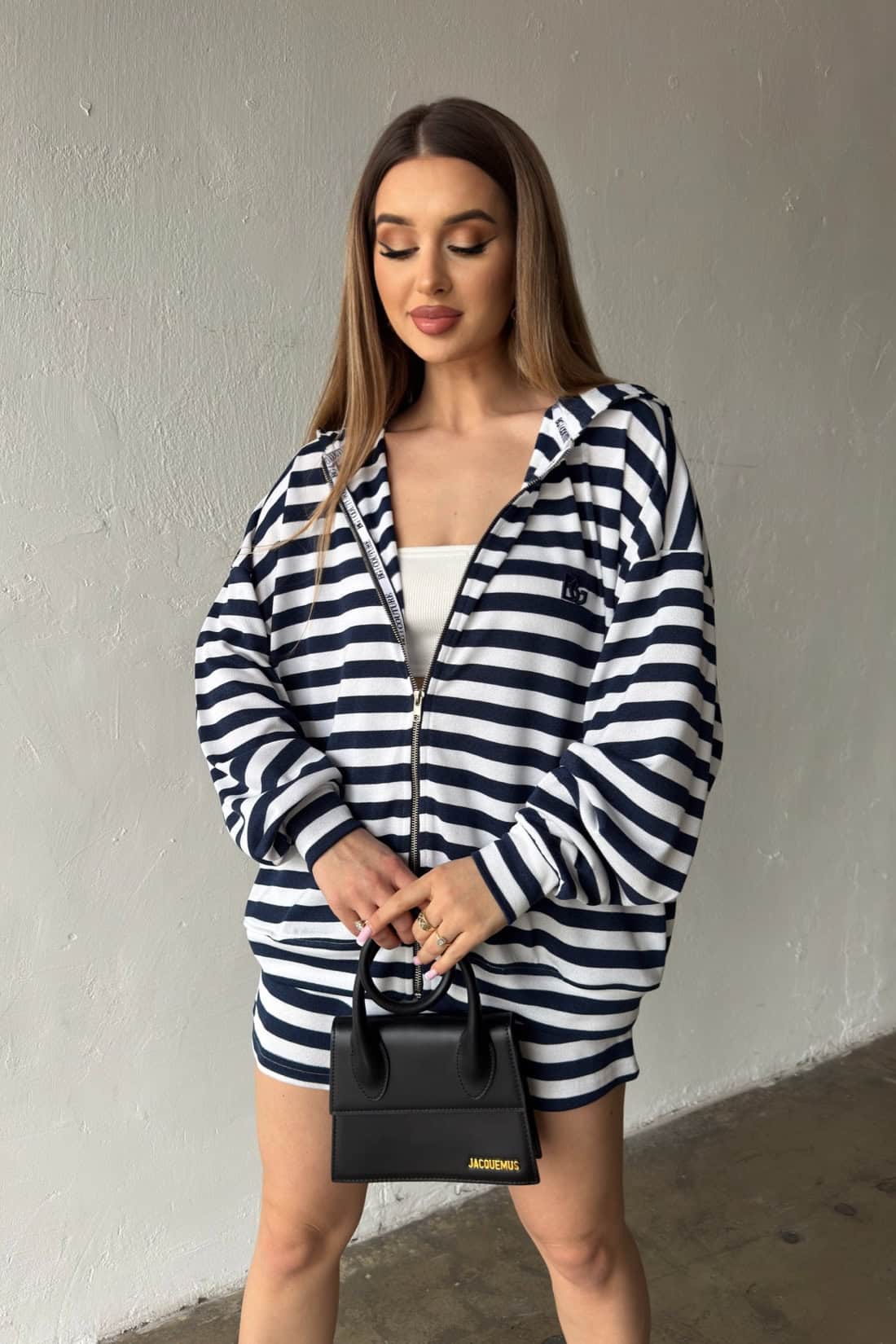 Opis produktu: Bluza damska BG MILKA z wysokiej jakości wiskozowej dzianiny sweterkowej. Bluza o luźnym kroju, rozpinana kangurka z kapturem. Na sercu logowanie monogramem BG w tonacji pasków. Model oversize.