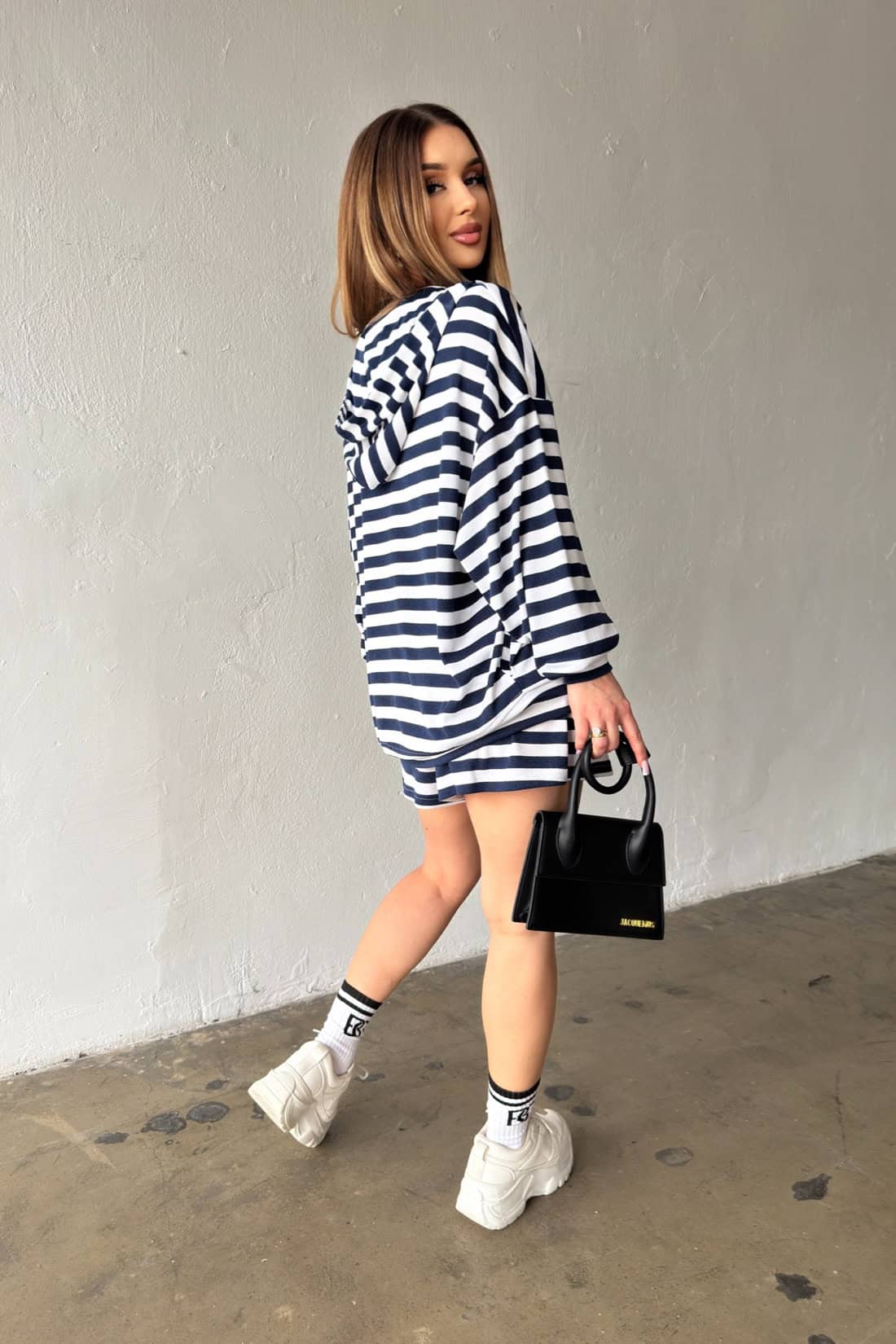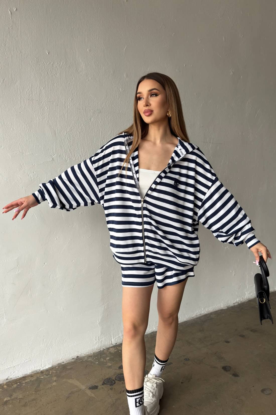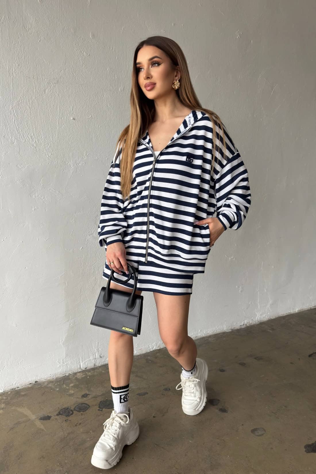 Opis produktu: Bluza damska BG MILKA z wysokiej jakości wiskozowej dzianiny sweterkowej. Bluza o luźnym kroju, rozpinana kangurka z kapturem. Na sercu logowanie monogramem BG w tonacji pasków. Model oversize.