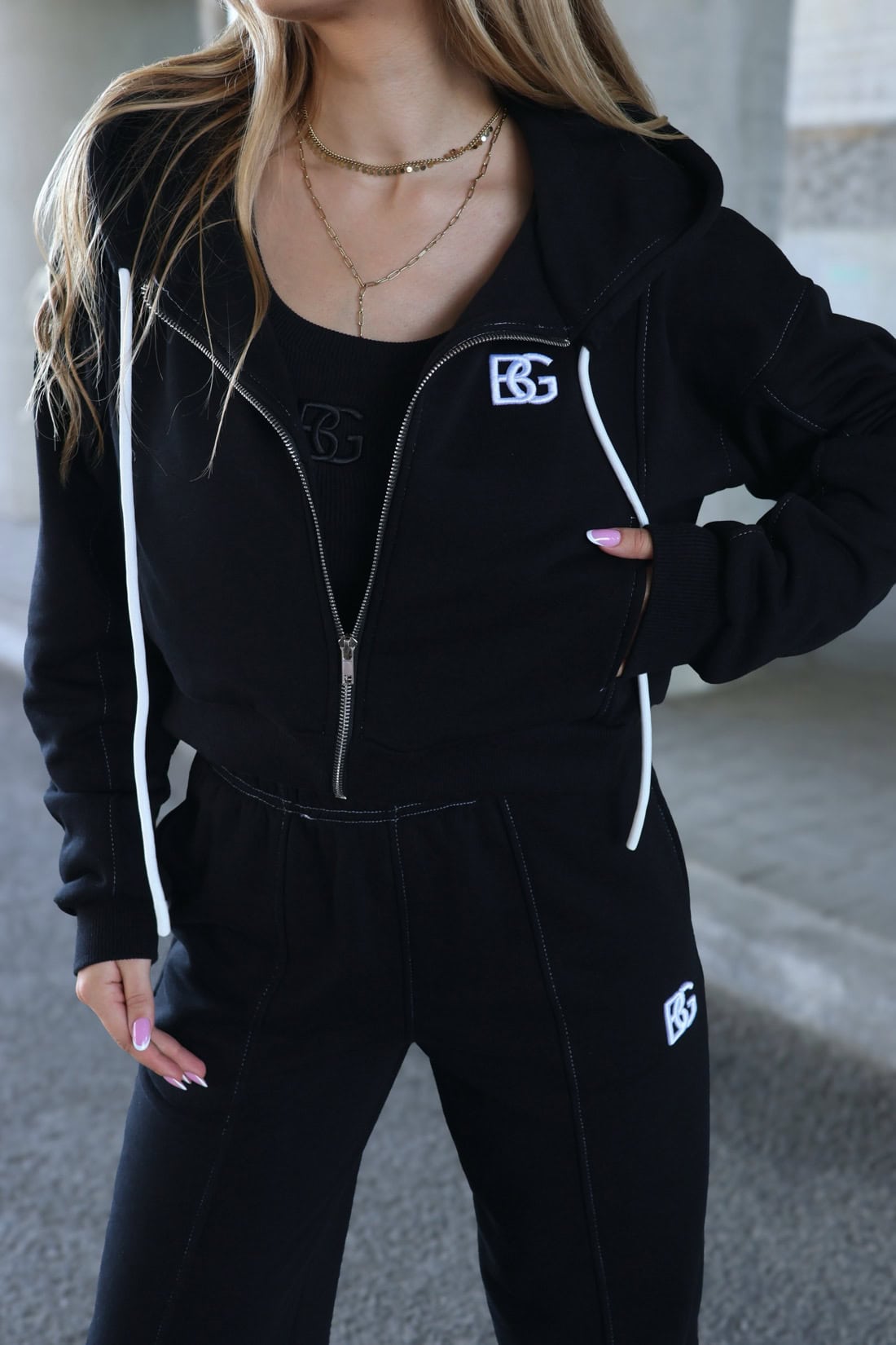 Opis produktu: Bluza damska BG WHITE z wysokiej jakości bawełny nieocieplanej. Bluza rozpinana z wyhaftowanym logo marki na piersi w kolorze białym. Bluza wykończona ściągaczami, zapinana na metalowy suwak. Posiada kieszenie oraz kaptur ze sznurkiem. Ozdobne białe przeszycia.