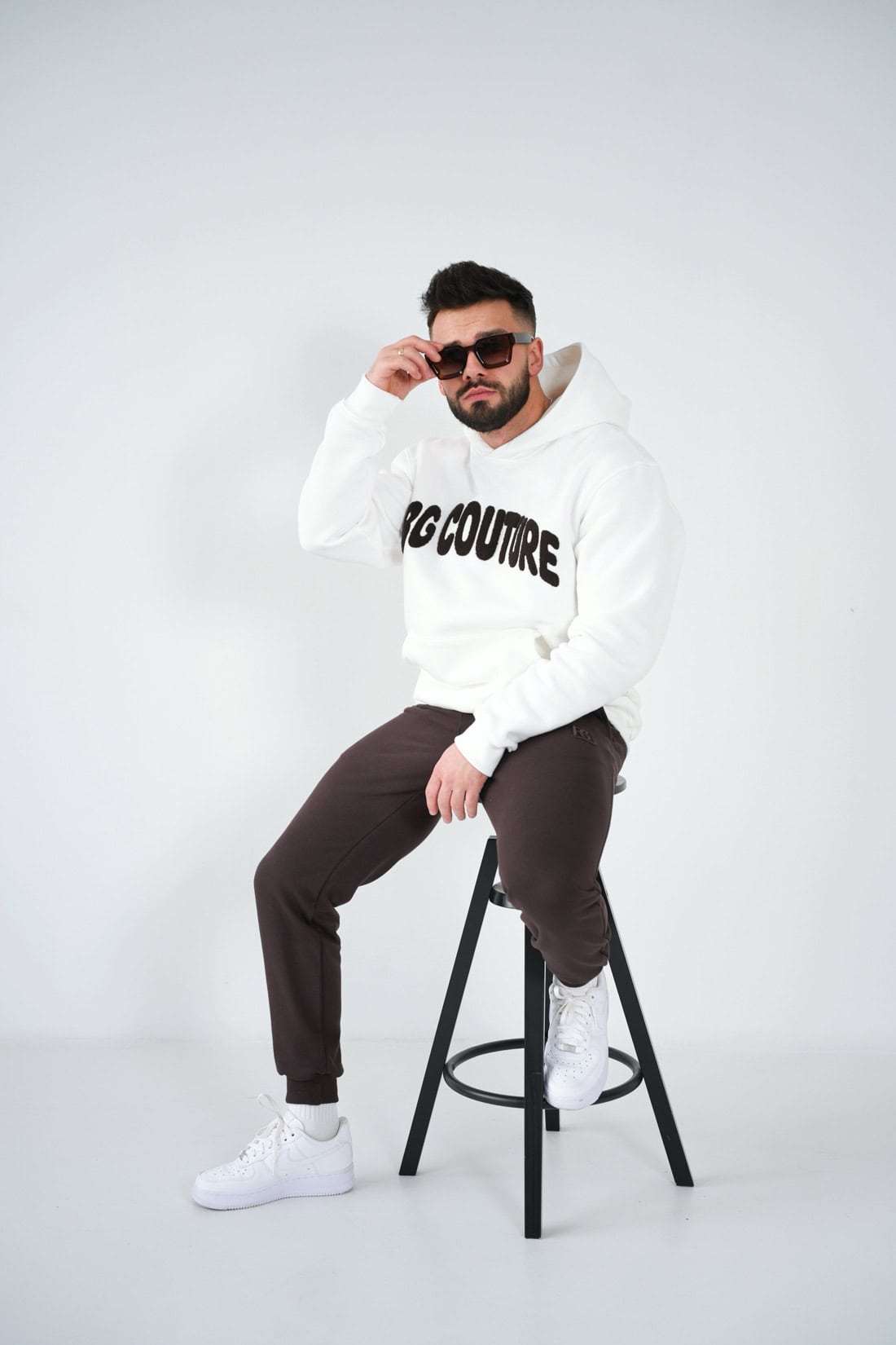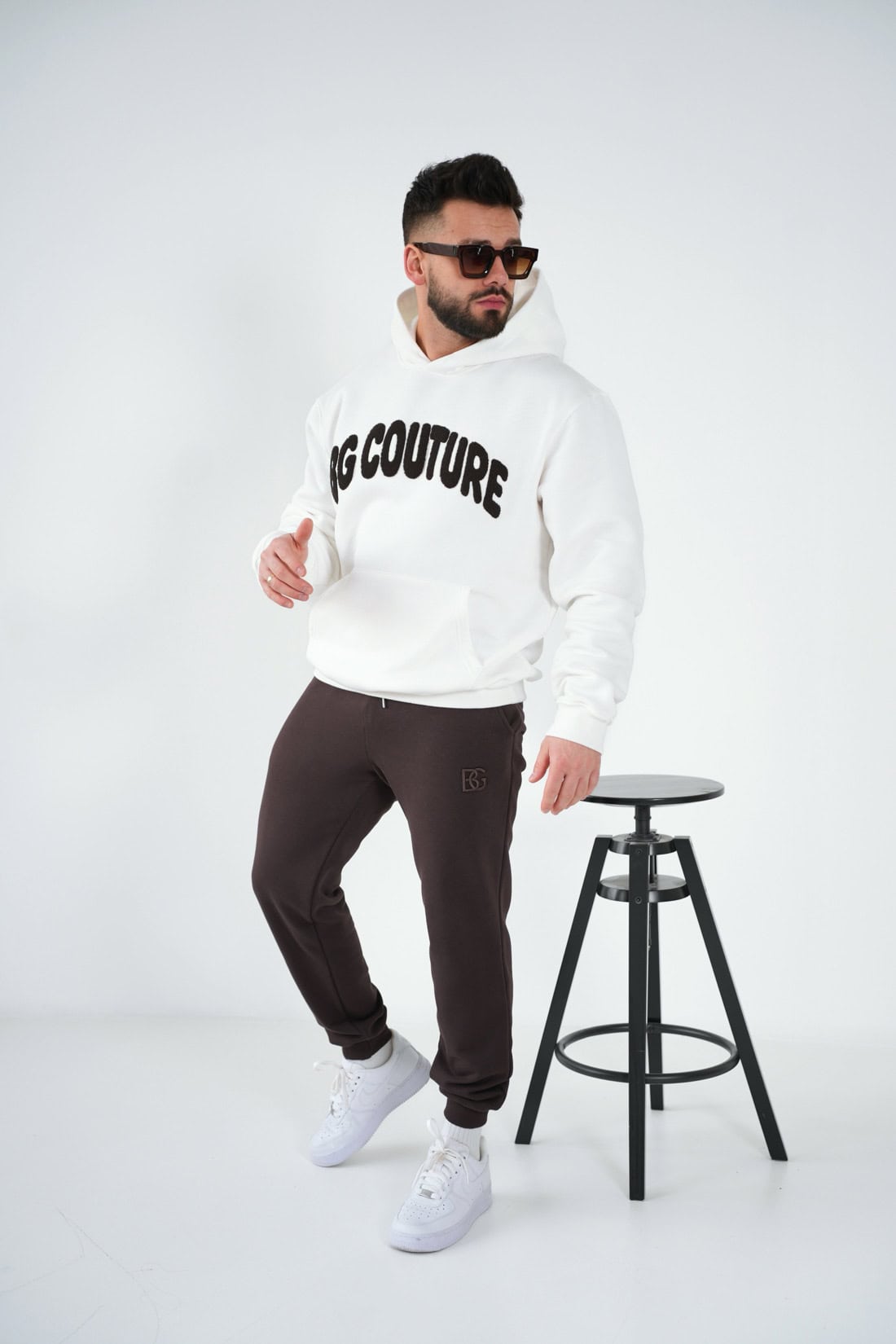 Opis produktu: Bluza z kapturem, lekki oversize. Gruba, ocieplana dzianina dresowa z mięciutkim meszkiem wewnątrz – ciepła, przyjemna w dotyku, ale nie ciężka. Krój lekko luźny – opadające ramiona, szerokie rękawy, idealna długość. Na piersi duży, puszysty haft marki BG Brandenburg Couture. Klasyczna kieszeń kangurka z przodu, kaptur, ściągacze przy rękawach i na dole.