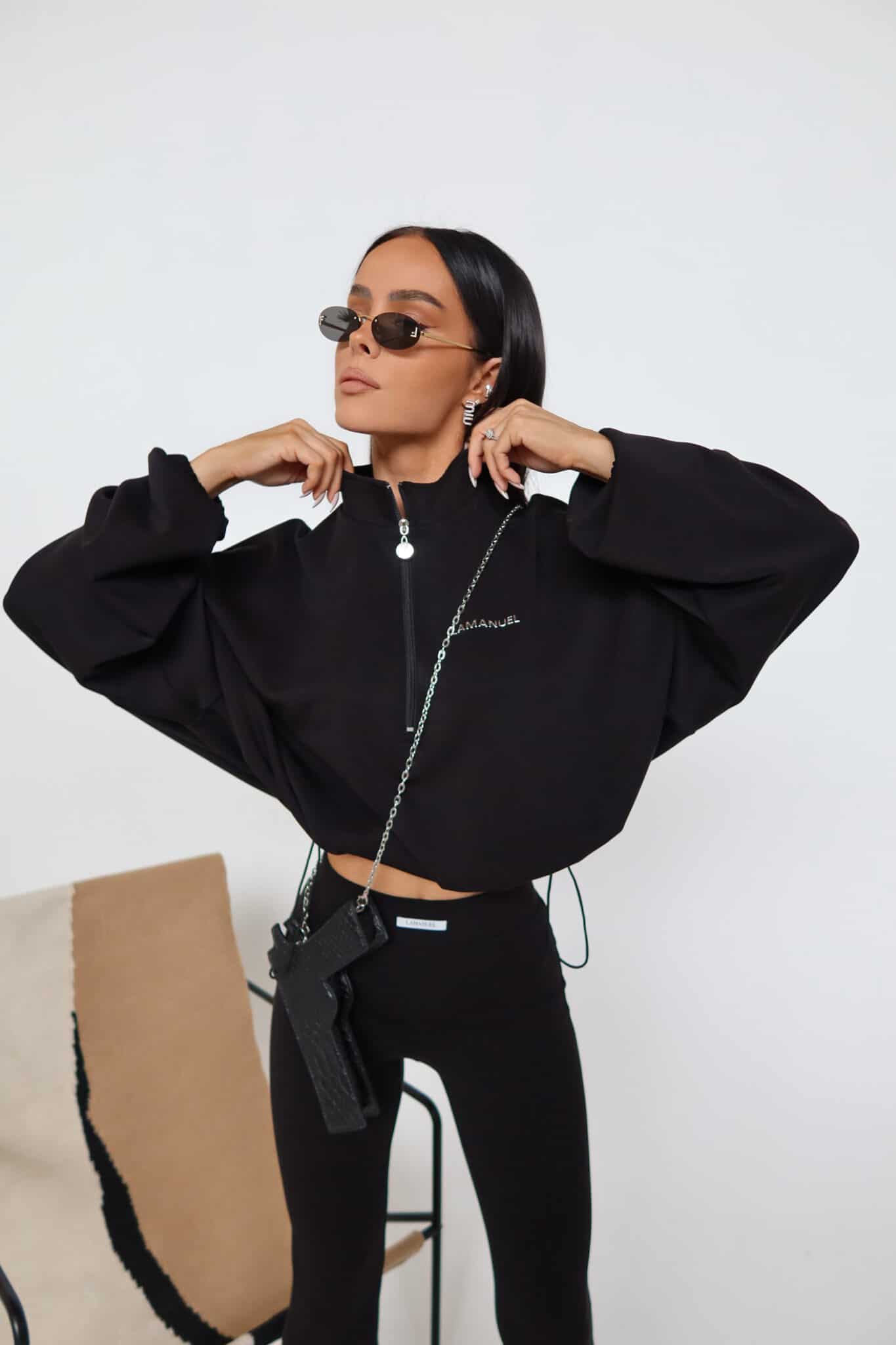 Krótsza bluza z lekko oversize’owymi rękawami i stójką zapinaną na suwak. Wykonana z wyjątkowo miękkiej dzianiny z meszkiem od spodu – otula ciało i daje uczucie ciepła oraz komfortu. Wykończona troczkami i elastycznymi ściągaczami przy rękawach. Z przodu subtelna aplikacja z logo w formie srebrnej wklejki. Must-have do codziennych i wygodnych stylizacji.Skład: 55% poliester 37% modal 8% spandex