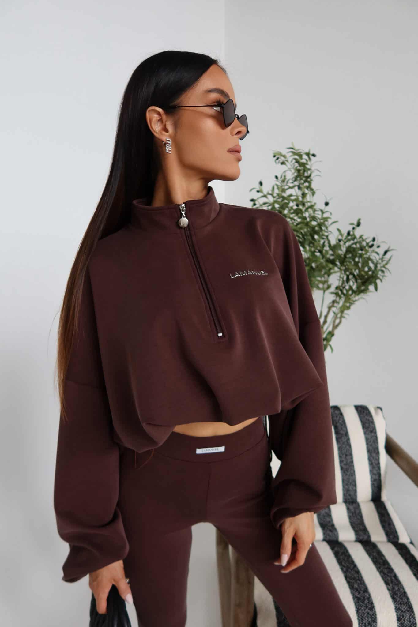 Krótsza bluza z lekko oversize’owymi rękawami i stójką zapinaną na suwak. Wykonana z wyjątkowo miękkiej dzianiny z meszkiem od spodu – otula ciało i daje uczucie ciepła oraz komfortu. Wykończona troczkami i elastycznymi ściągaczami przy rękawach. Z przodu subtelna aplikacja z logo w formie srebrnej wklejki. Must-have do codziennych i wygodnych stylizacji.Skład: 55% poliester 37% modal 8% spandex