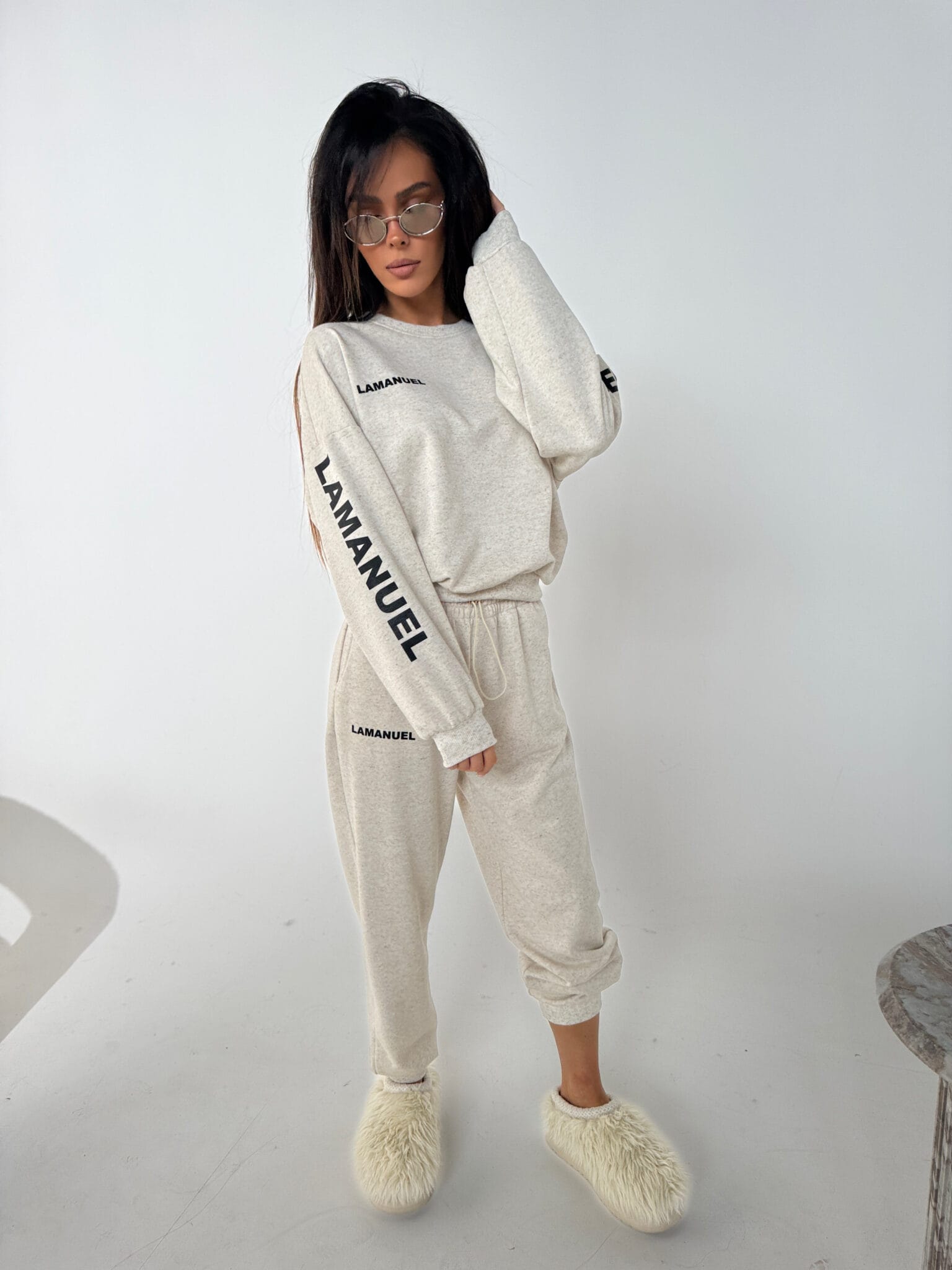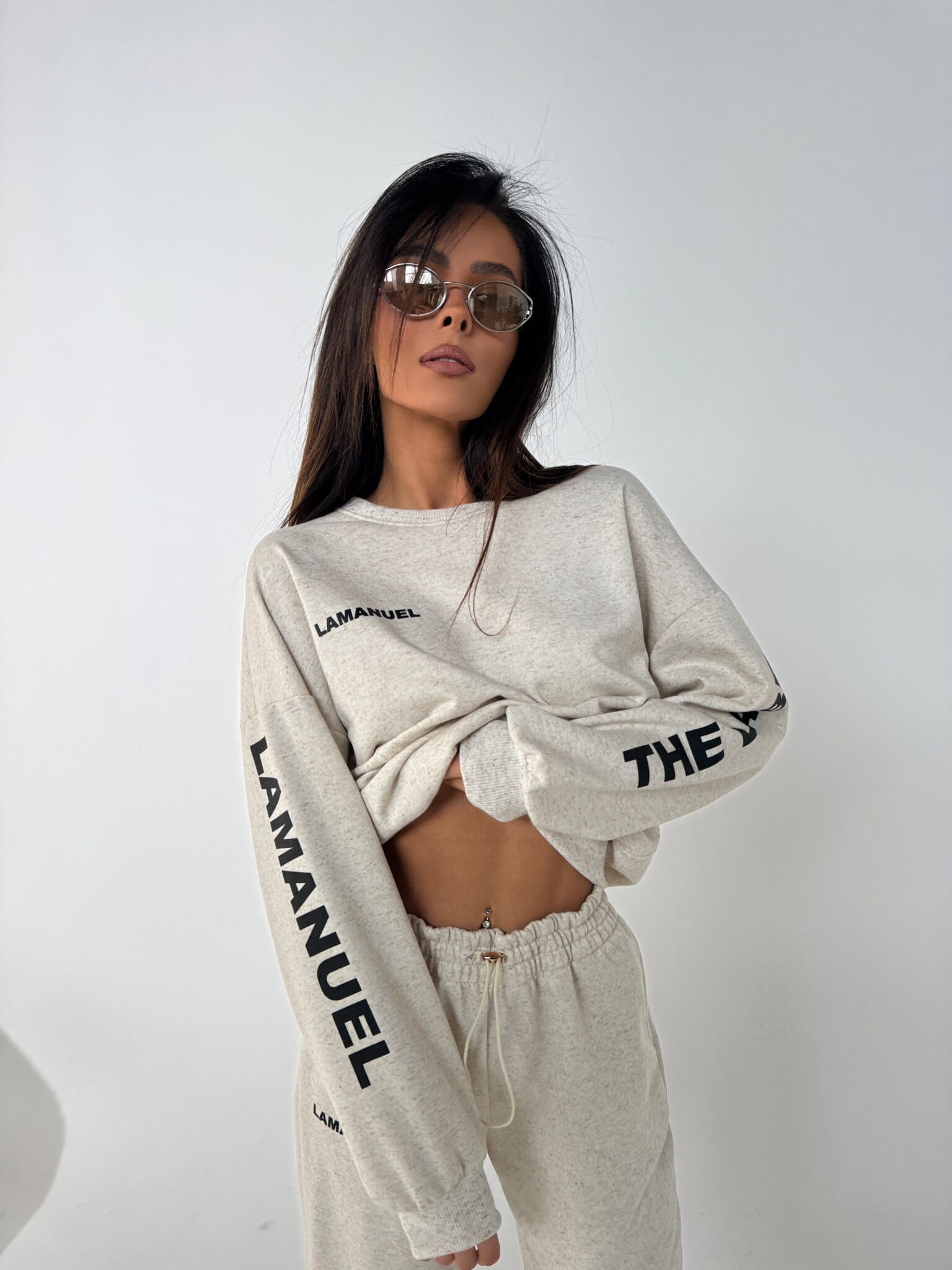 Bluza o luźnym, lekko oversize kroju z dzianiny pętelkowej o wysokiej gramaturze. Miękka i wygodna, ze ściągaczami przy rękawach i dole. Logo LAMANUEL na piersi oraz pionowe nadruki na rękawach „LAMANUEL / THE LABEL”. Świetnie wygląda solo i w komplecie.Skład: 90% bawełna 10% poliester
