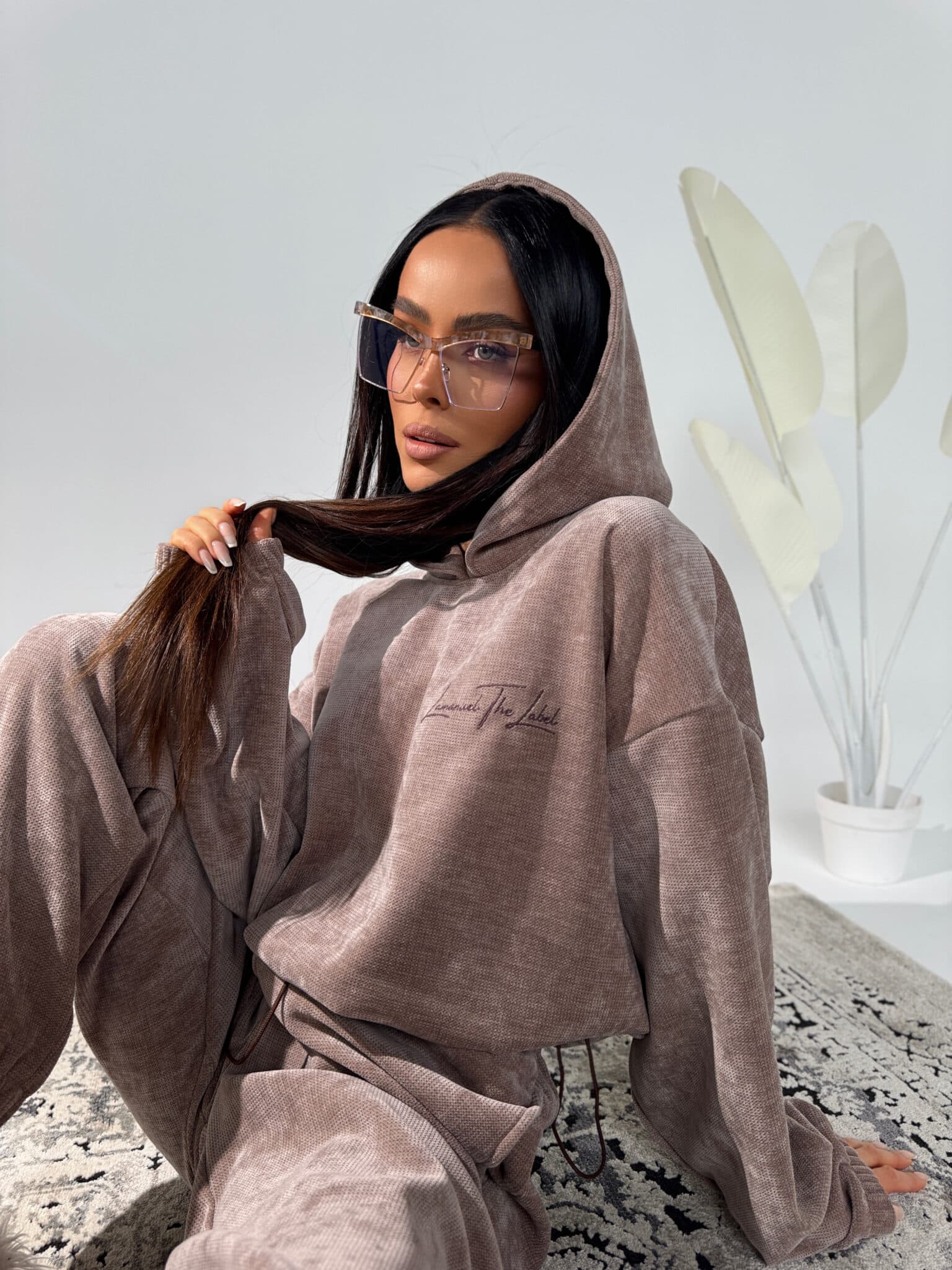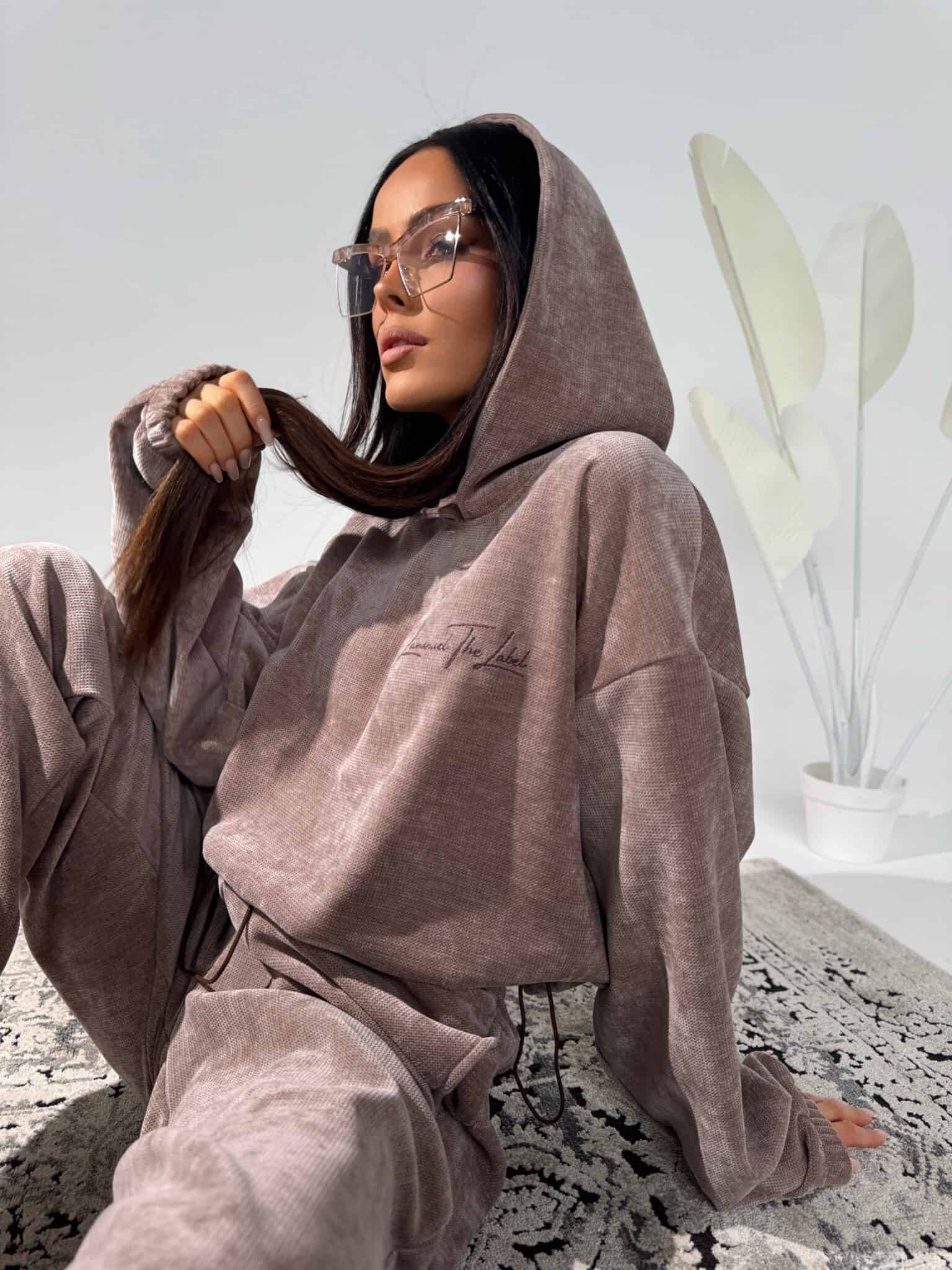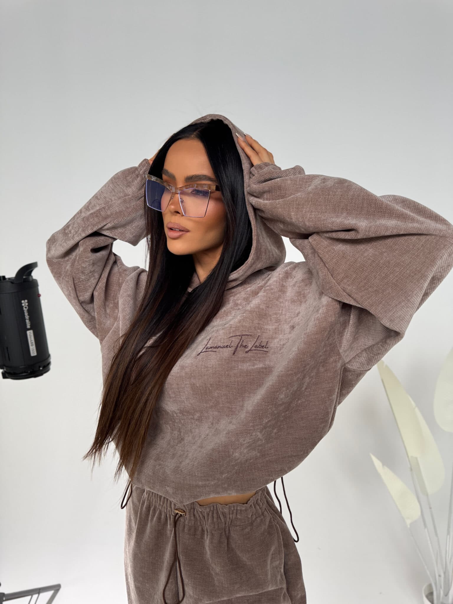 Miękka jak ulubiony koc i idealna na zimowe dni, kiedy za oknem śnieg, a Ty masz ochotę na spokój i ciepło. Dłuższy krój z możliwością ściągnięcia na dole – możesz nosić ją luźno albo skrócić i podkreślić sylwetkę. Welur delikatnie odbija światło, a oversize’owe rękawy i miękki kaptur dodają luzu. Założysz ją po całym dniu na stoku, na gorącą czekoladę z przyjaciółką albo na weekendowy wypad w góry. Komfort z klimatem.Skład: 95% poliester 5% spandex