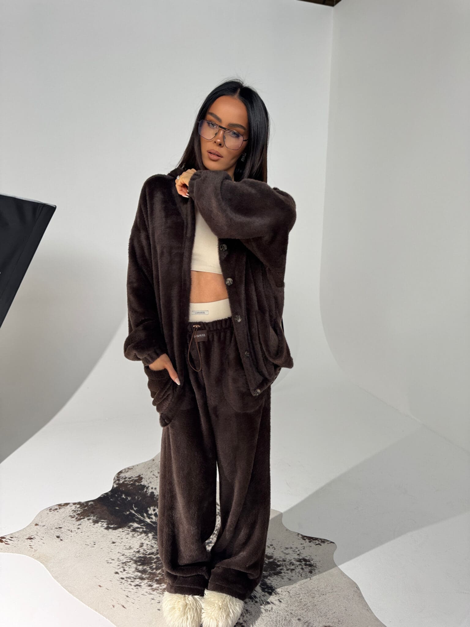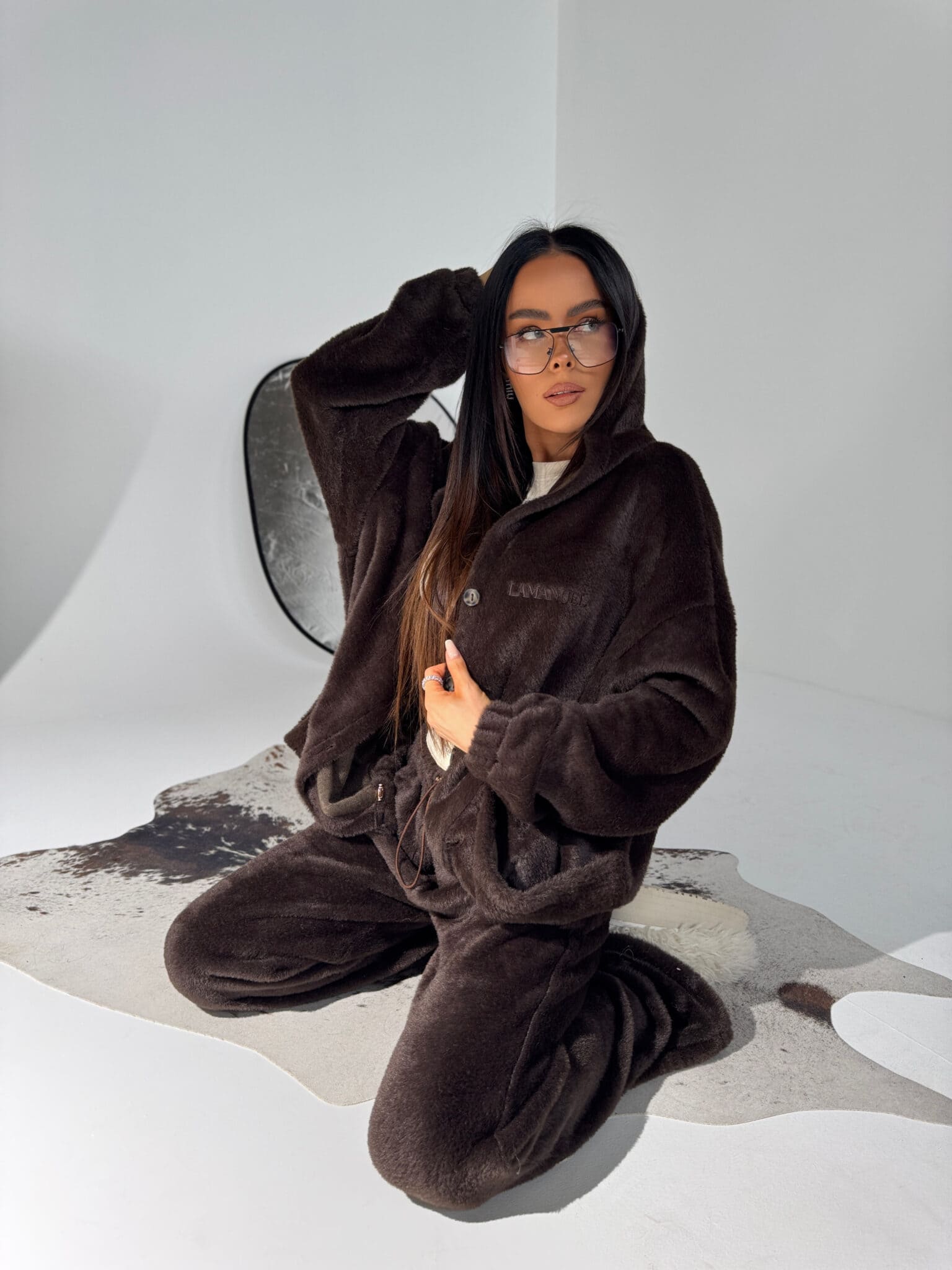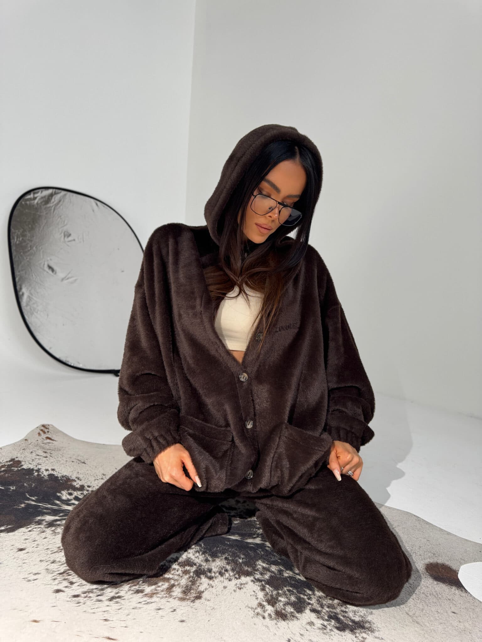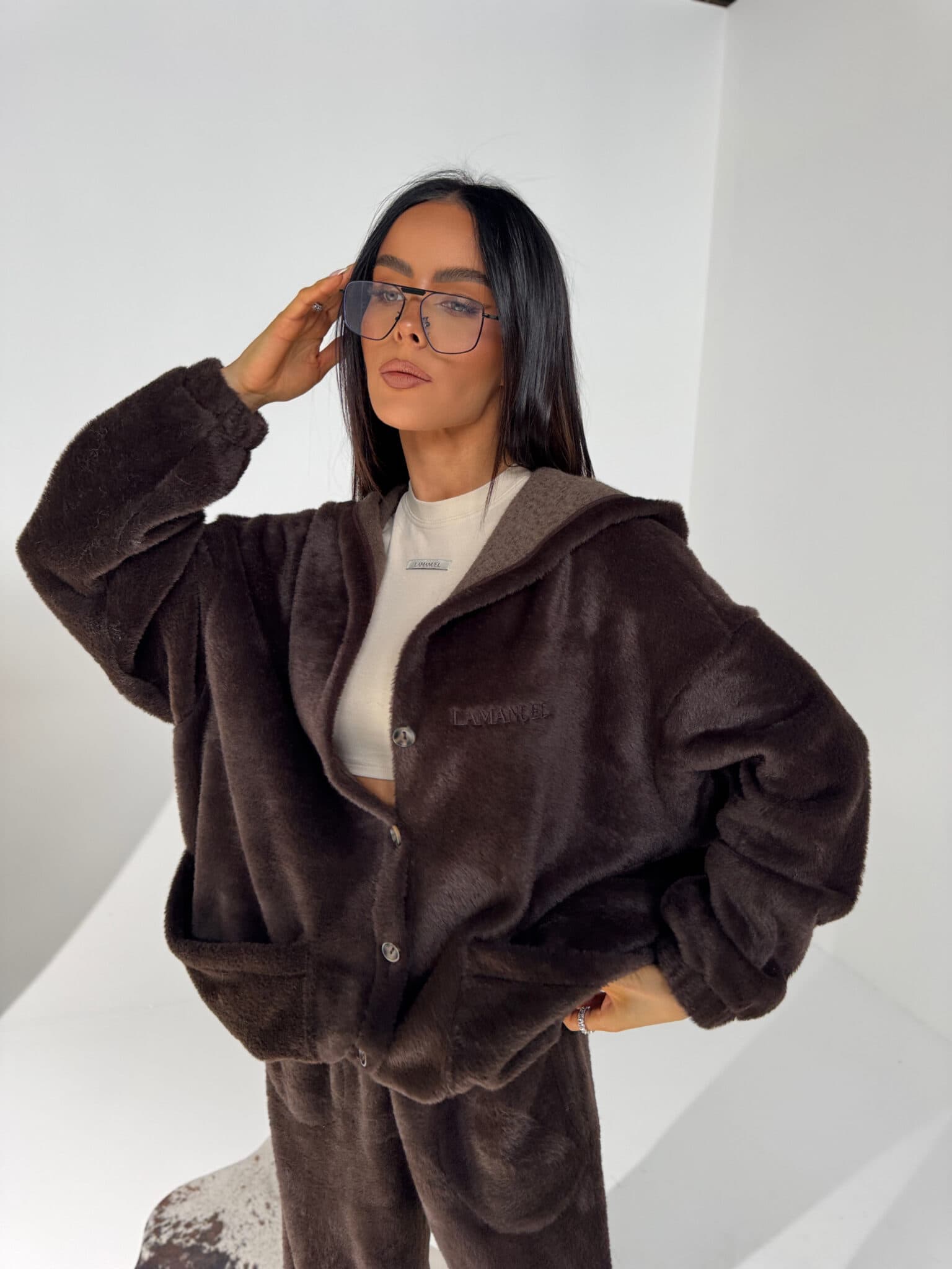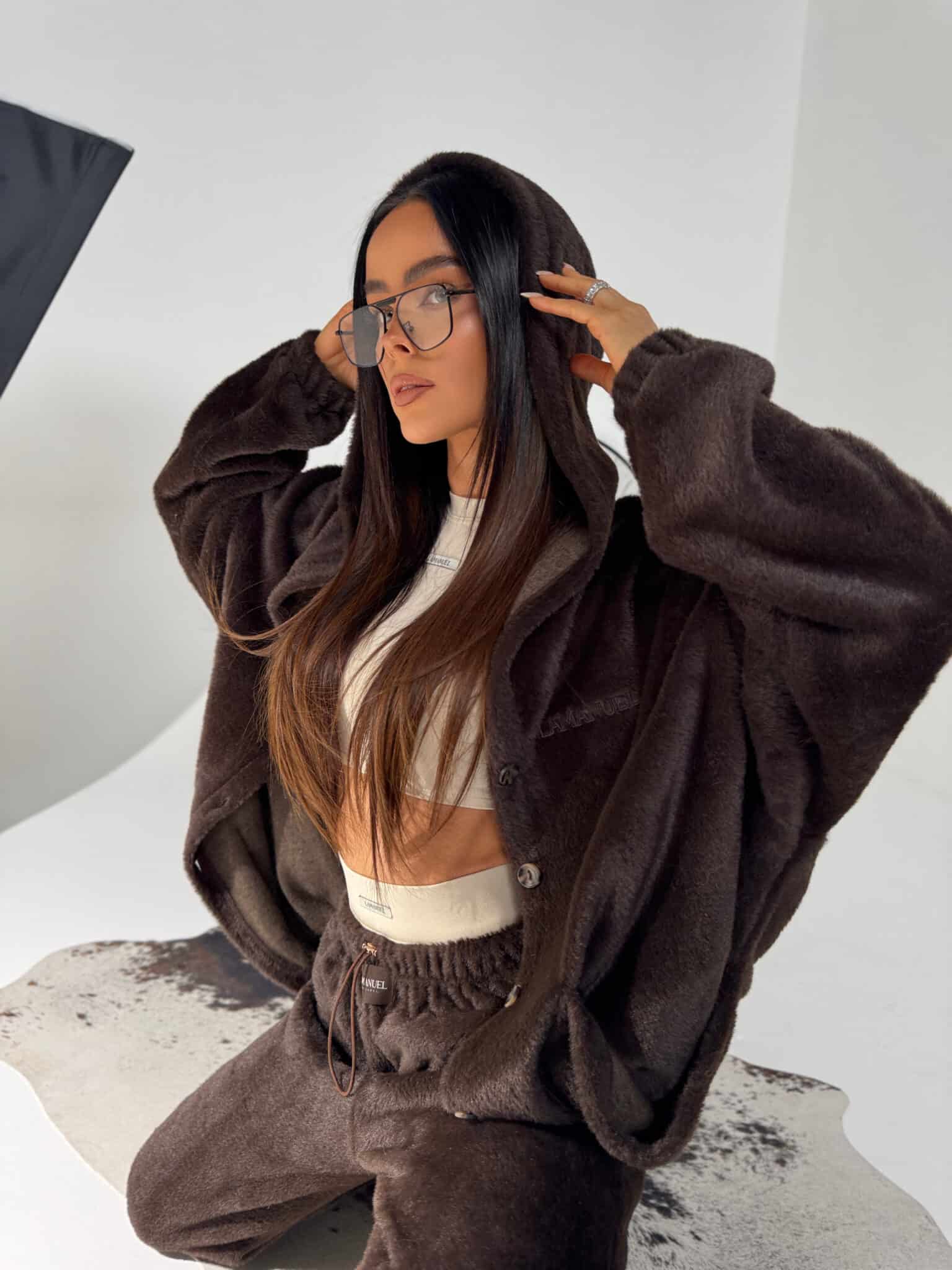 Bluza o oversize’owym kroju, wykonana z ultra miękkiego, puszystego materiału przypominającego misia. Otula jak koc i zapewnia maksymalne ciepło nawet w największy chłód. Luźny fason z obszernym kapturem i dużymi kieszeniami to połączenie stylu i wygody. Zapinana na guziki, wykończona haftowanym logo. Sprawdzi się idealnie podczas zimowych spacerów, wyjazdów w góry i leniwych dni w domu. Możesz ją zestawić z pasującymi spodniami – to komplet stworzony na śnieżne przygody i mroźne poranki.Skład: 71% nylon 29% poliester