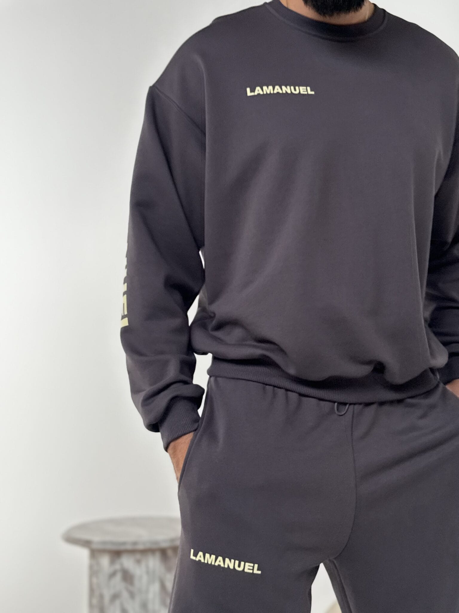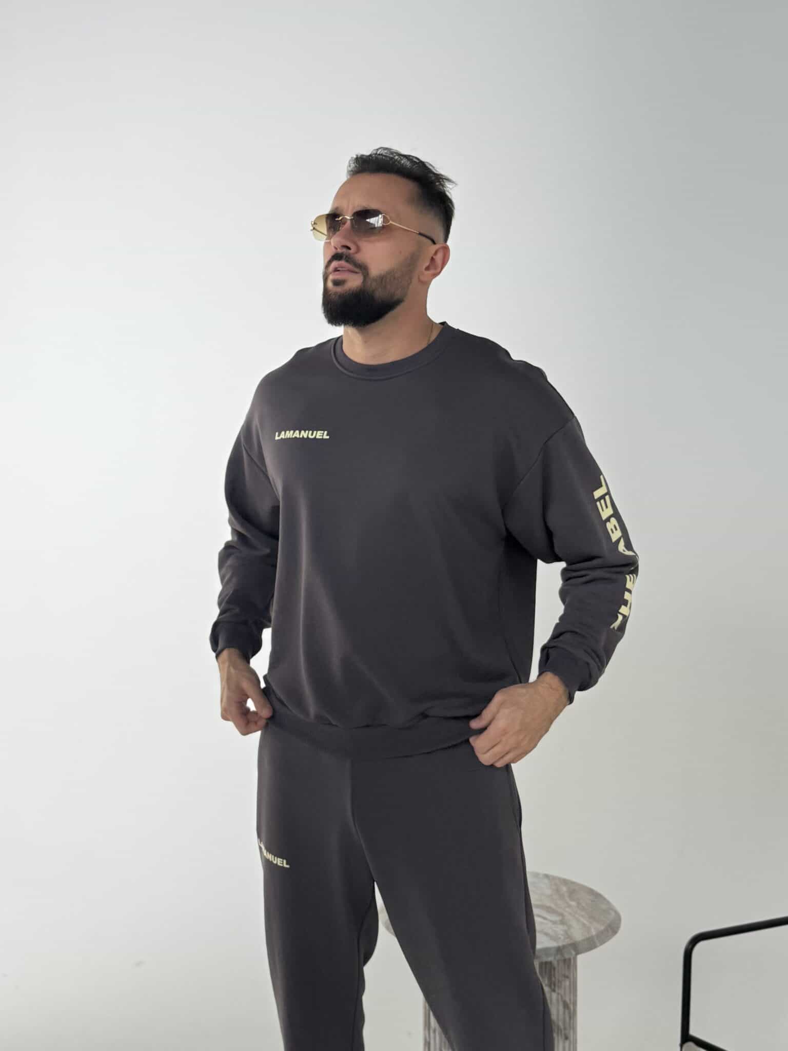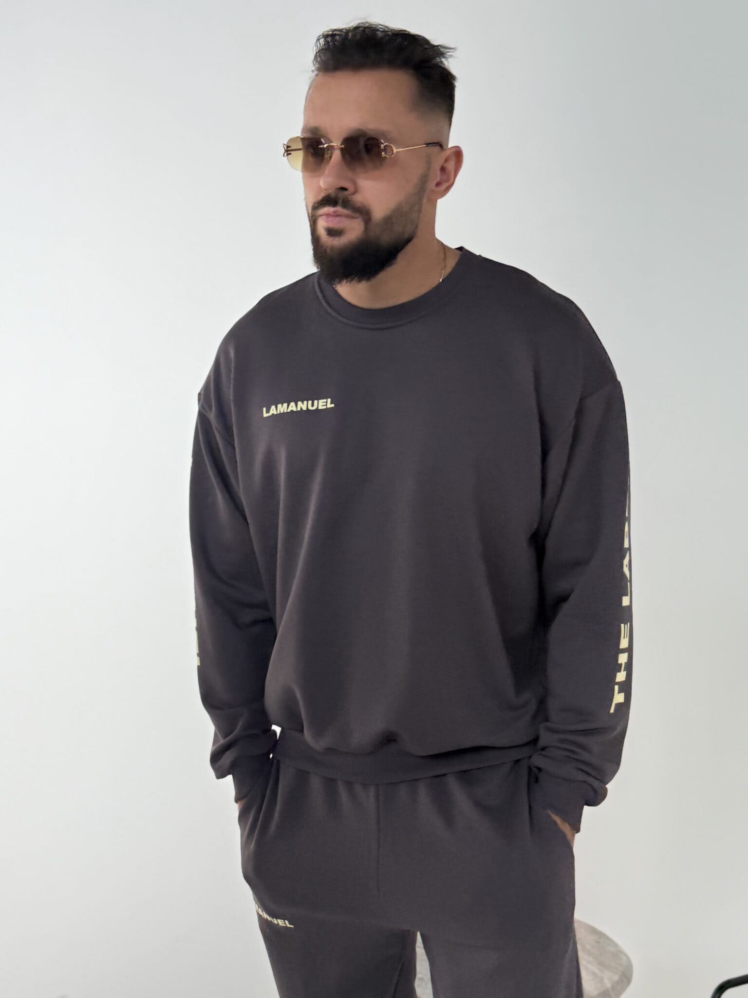 Męski zestaw dresowy w wersji premium – maksymalna wygoda i wyrazisty styl. Na rękawie kontrastowy napis „LAMANUEL”, na drugim „THE LABEL”. Oversize’owy krój i miękka tkanina zapewniają komfort w każdej sytuacji. Idealny do zestawu matchy z partnerką.Skład: 90% bawełna 10% poliester