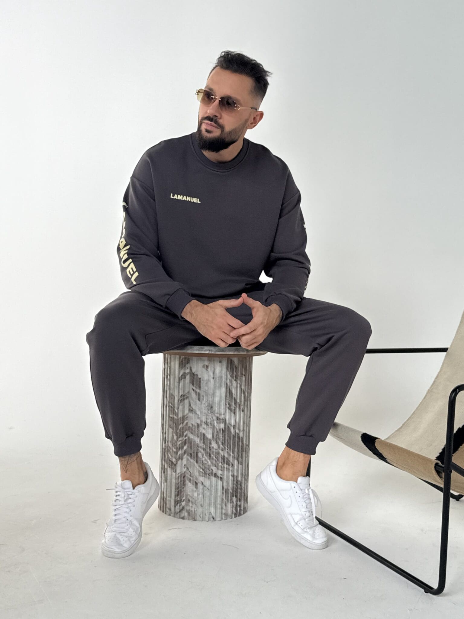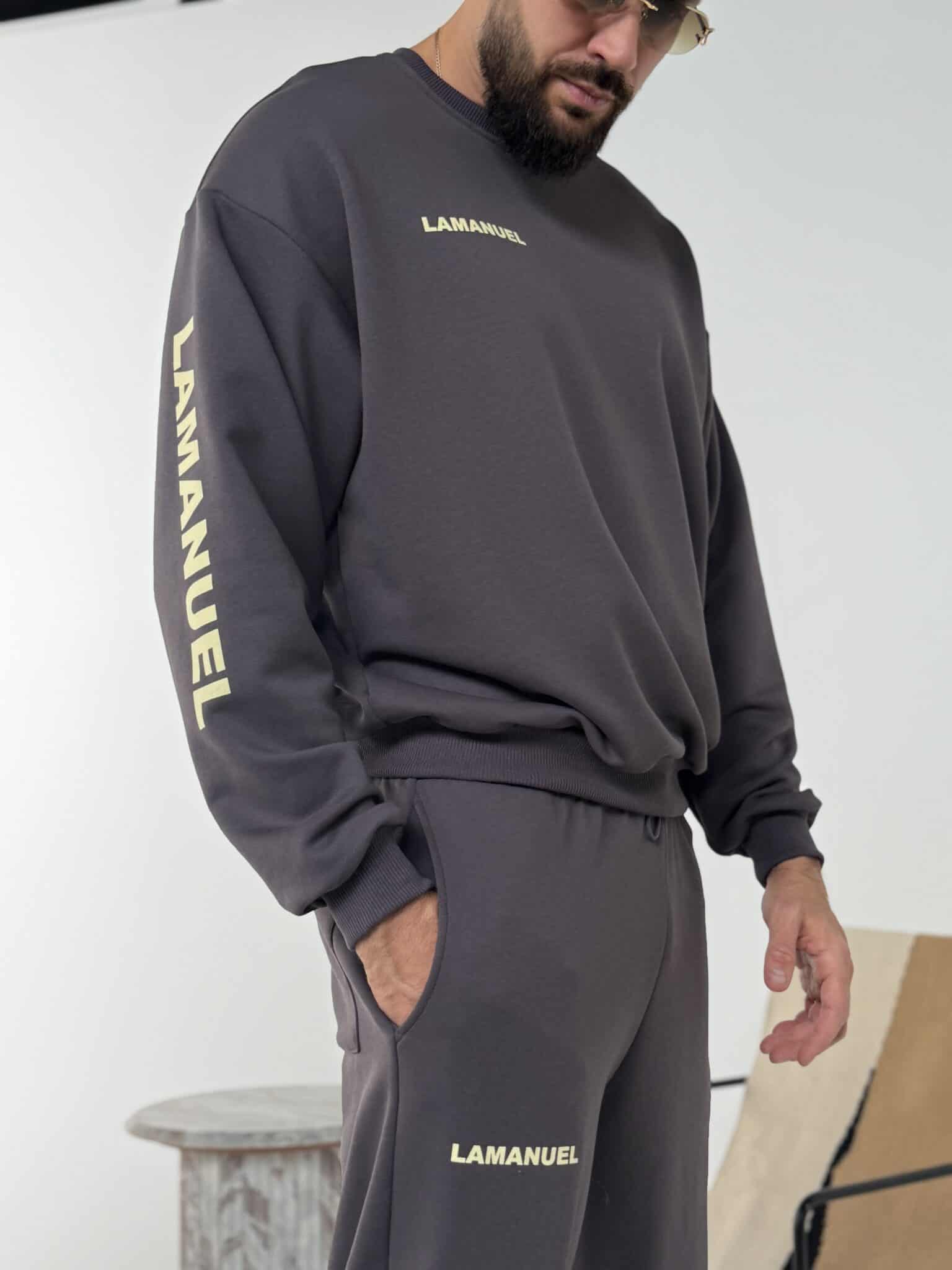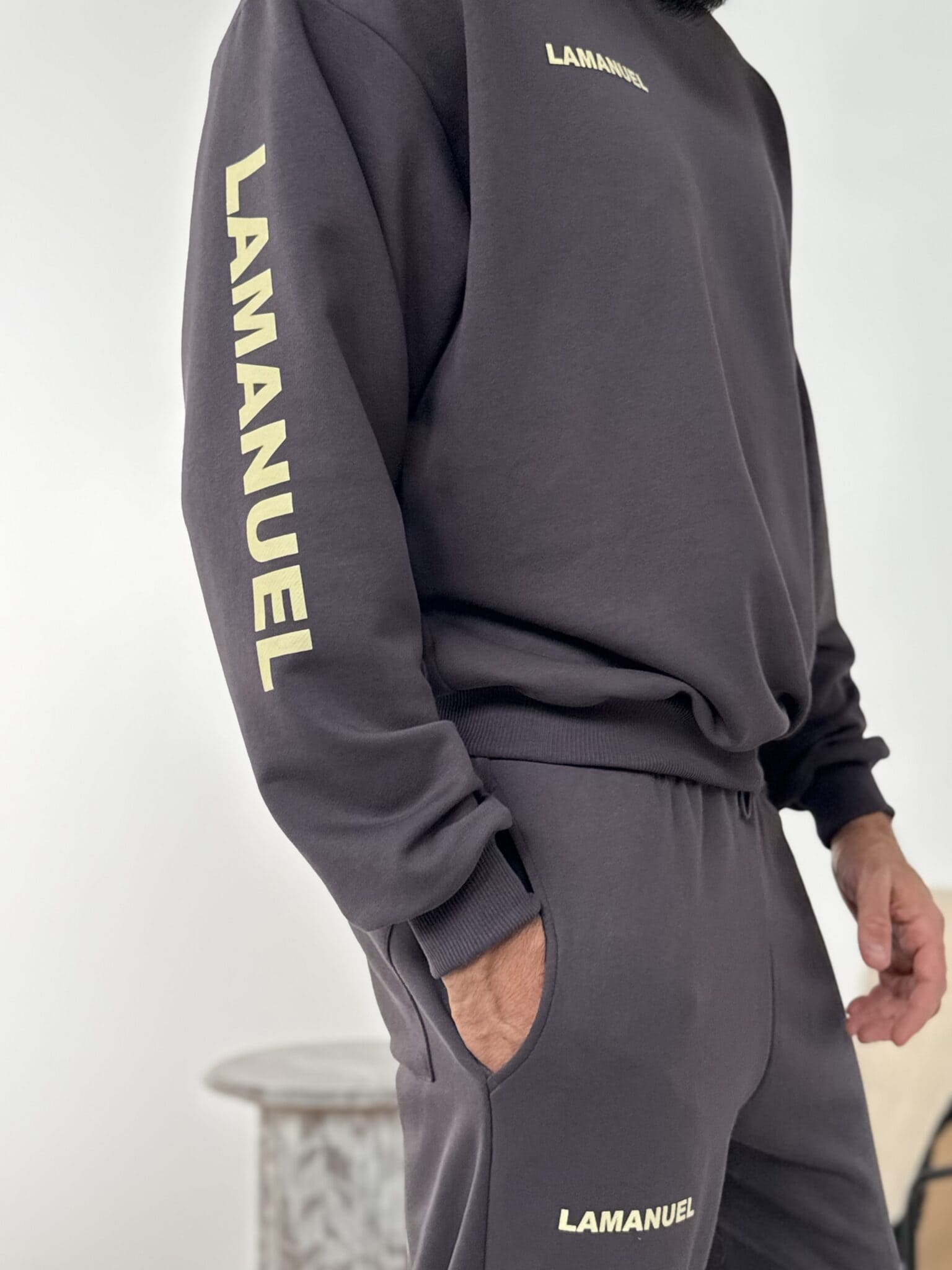 Męski zestaw dresowy w wersji premium – maksymalna wygoda i wyrazisty styl. Na rękawie kontrastowy napis „LAMANUEL”, na drugim „THE LABEL”. Oversize’owy krój i miękka tkanina zapewniają komfort w każdej sytuacji. Idealny do zestawu matchy z partnerką.Skład: 90% bawełna 10% poliester