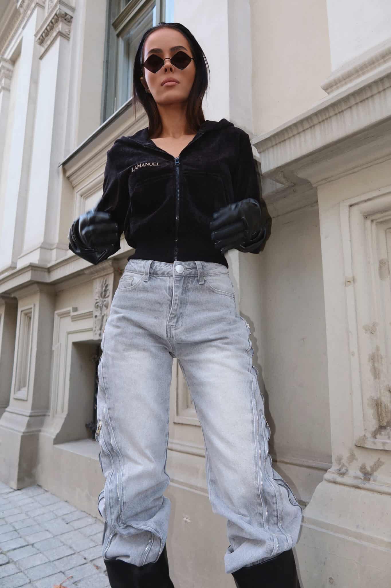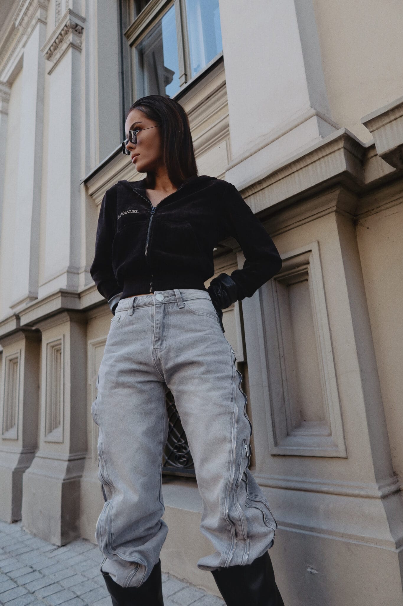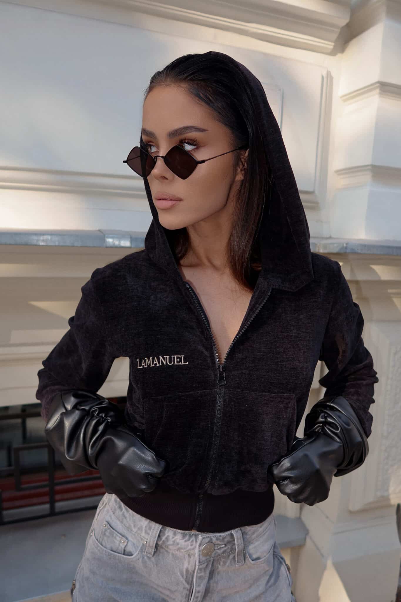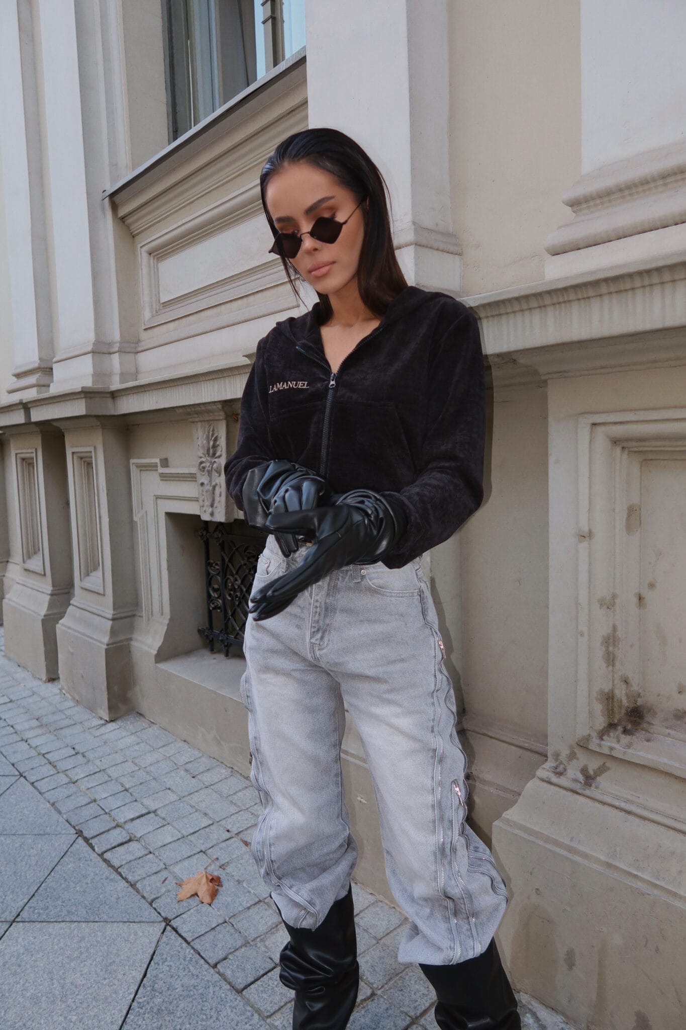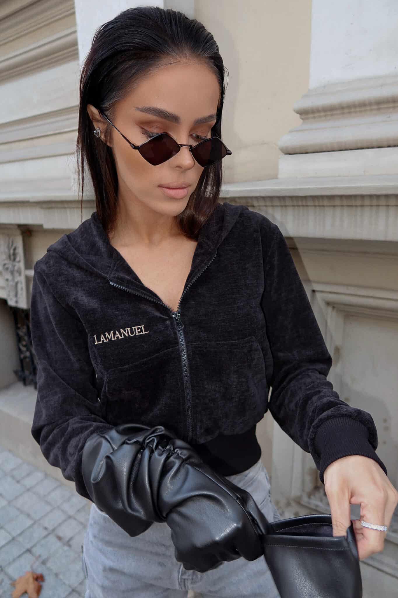 Krótka bluza, która przyciąga uwagę nie tylko krojem, ale i klimatem. Mięsista w dotyku, przyjemna dla skóry, z charakterystycznym haftem i dużym kapturem na chłodniejsze dni. Łączy wygodę z miejskim luzem, a przy tym trzyma fason. Noś ją do szerokich jeansów, spodni z wysokim stanem albo solo – jako element, który robi całą stylówkę.Skład: 95% poliester 5% elastan