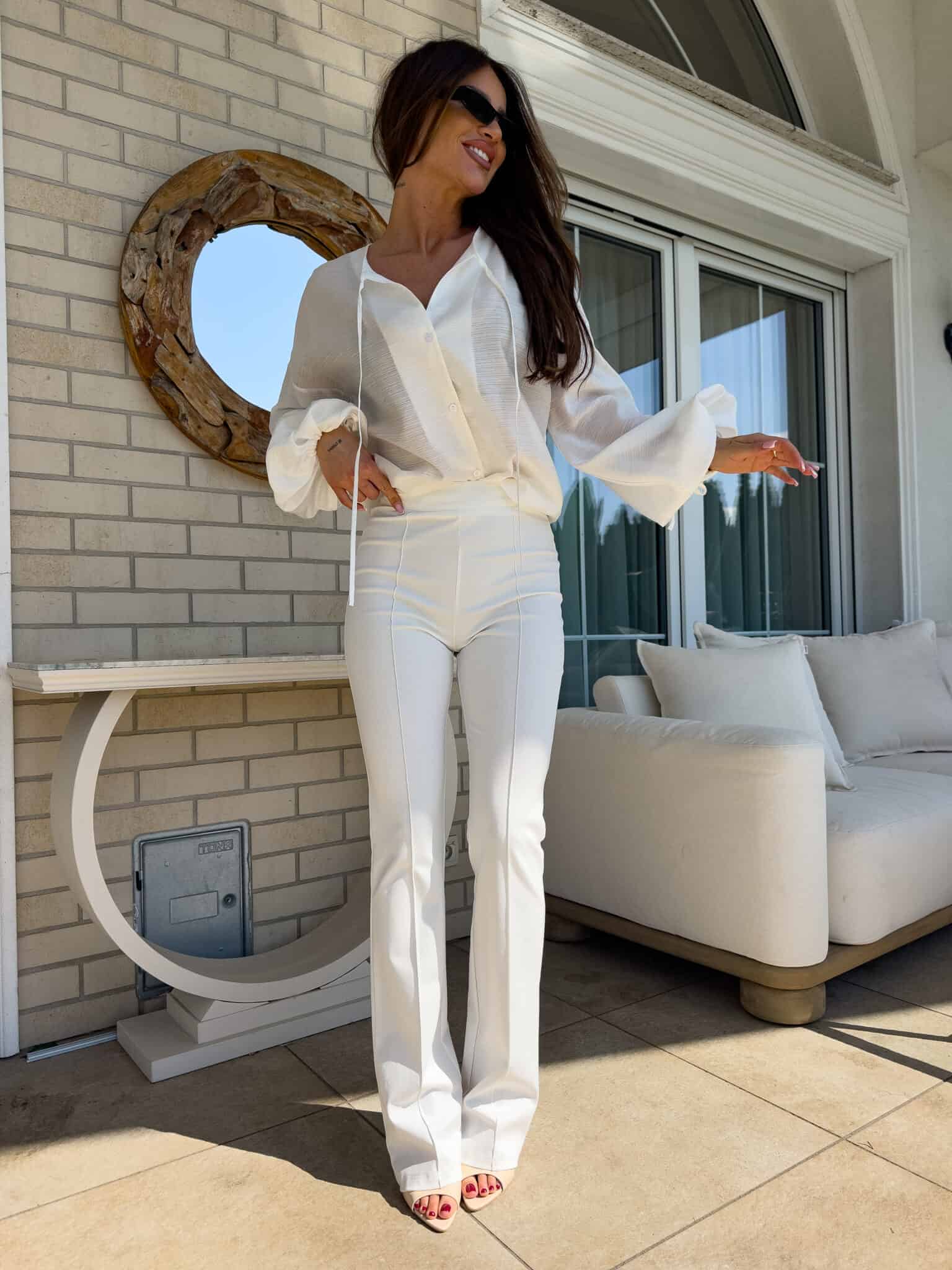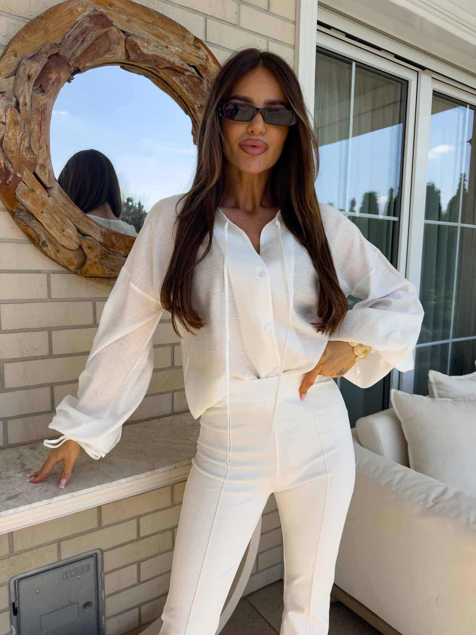 Luźny fason typu oversize to gwarancja wygody i swobody ruchów, a jednocześnie modny akcent w każdej stylizacji. Bluzka posiada dekolt z uroczym wiązaniem na troczki, które dodają całości lekkości i romantycznego charakteru. Bufiaste rękawy zakończone wiązaniem na troczki tworzą efektowną formę. Idealna do jeansów, spodni z wysokim stanem lub spódnic — na co dzień i na specjalne okazje.