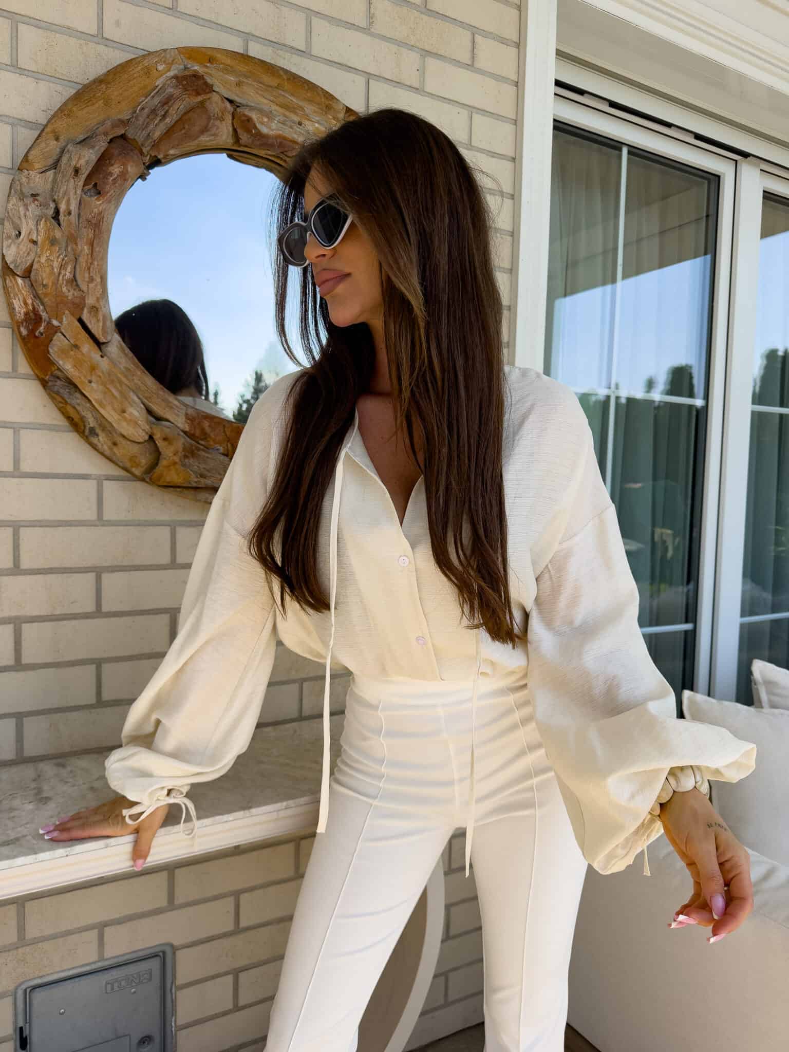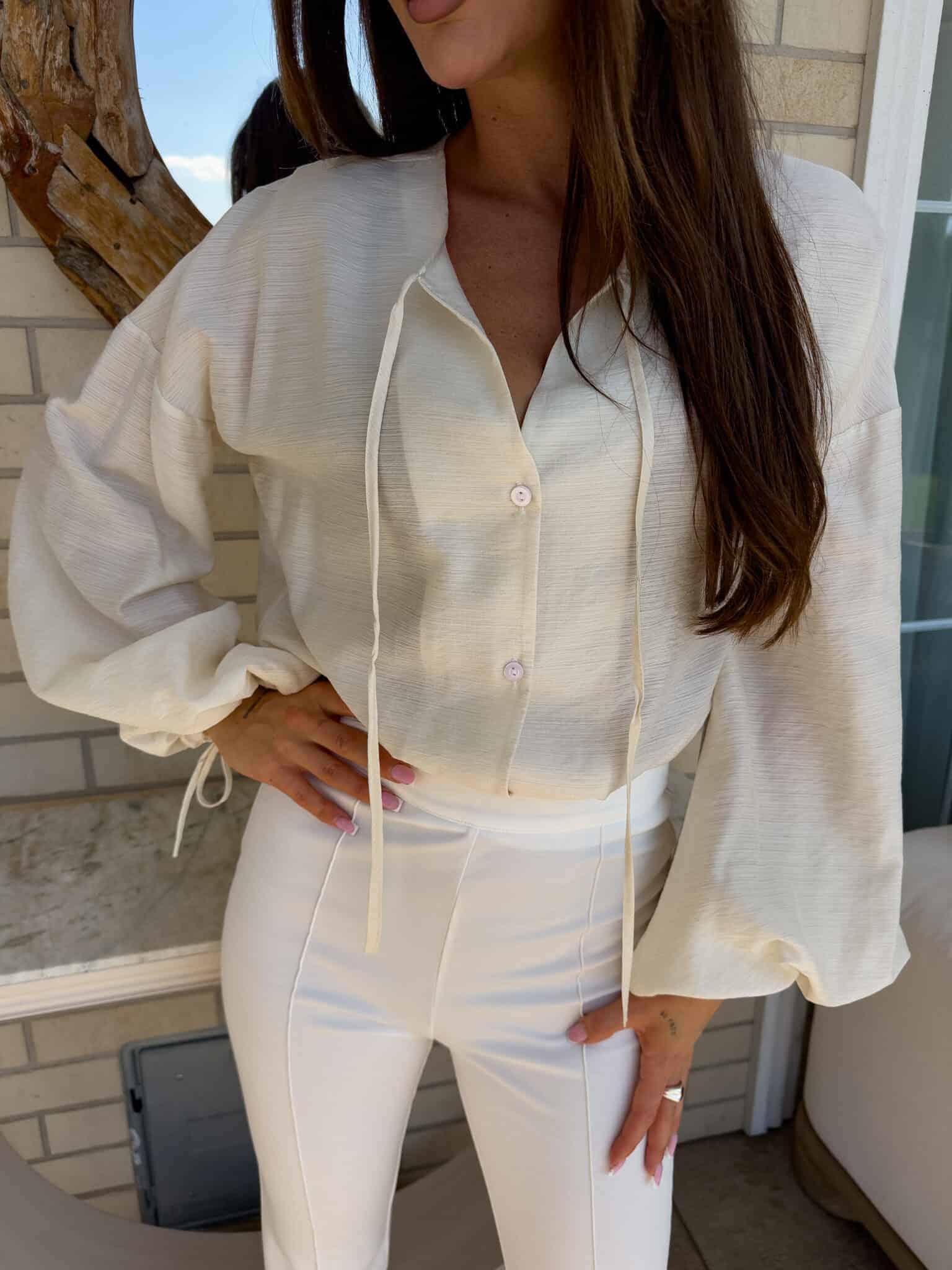 Luźny fason typu oversize to gwarancja wygody i swobody ruchów, a jednocześnie modny akcent w każdej stylizacji. Bluzka posiada dekolt z uroczym wiązaniem na troczki, które dodają całości lekkości i romantycznego charakteru. Bufiaste rękawy zakończone wiązaniem na troczki tworzą efektowną formę. Idealna do jeansów, spodni z wysokim stanem lub spódnic — na co dzień i na specjalne okazje.