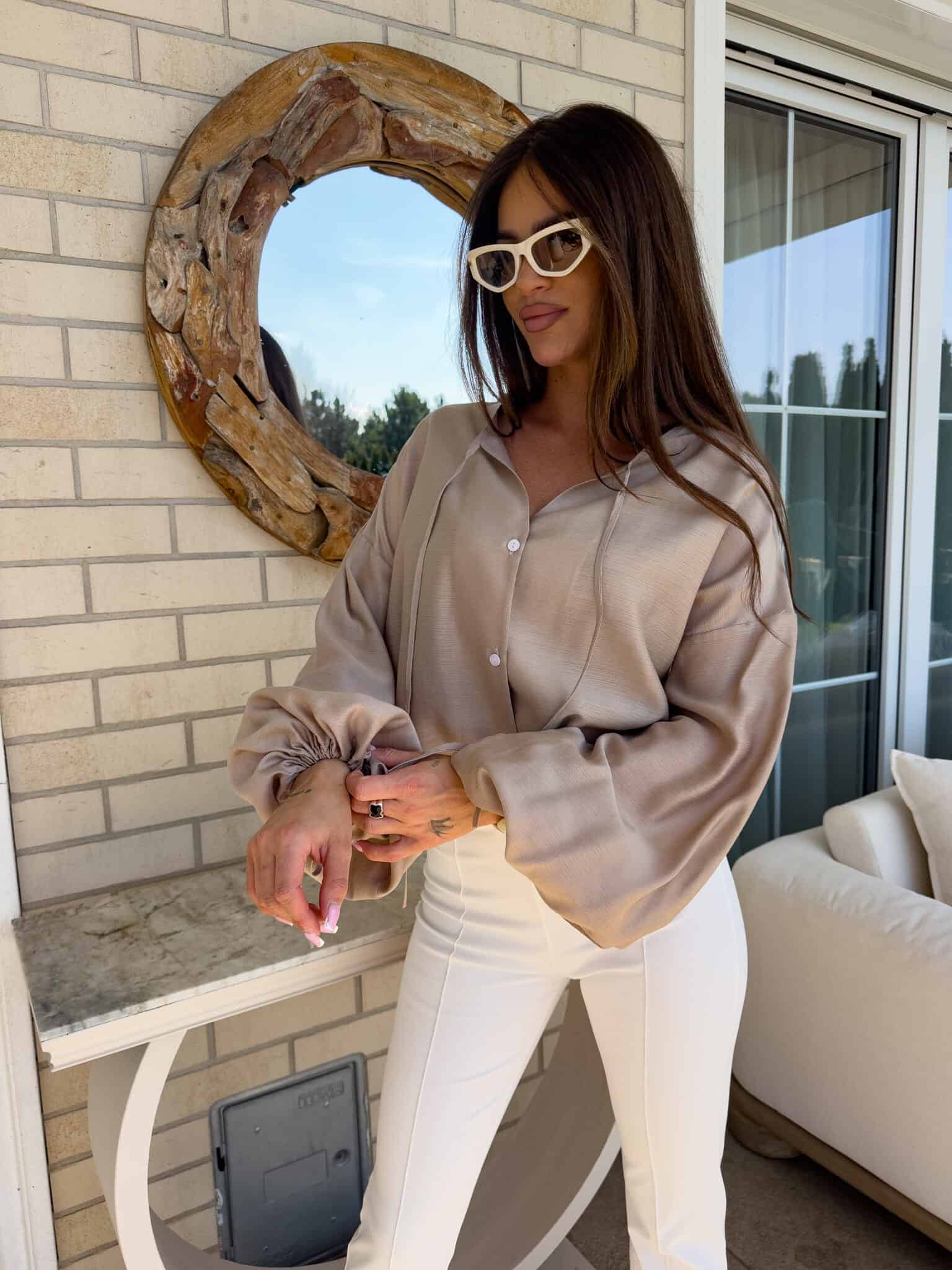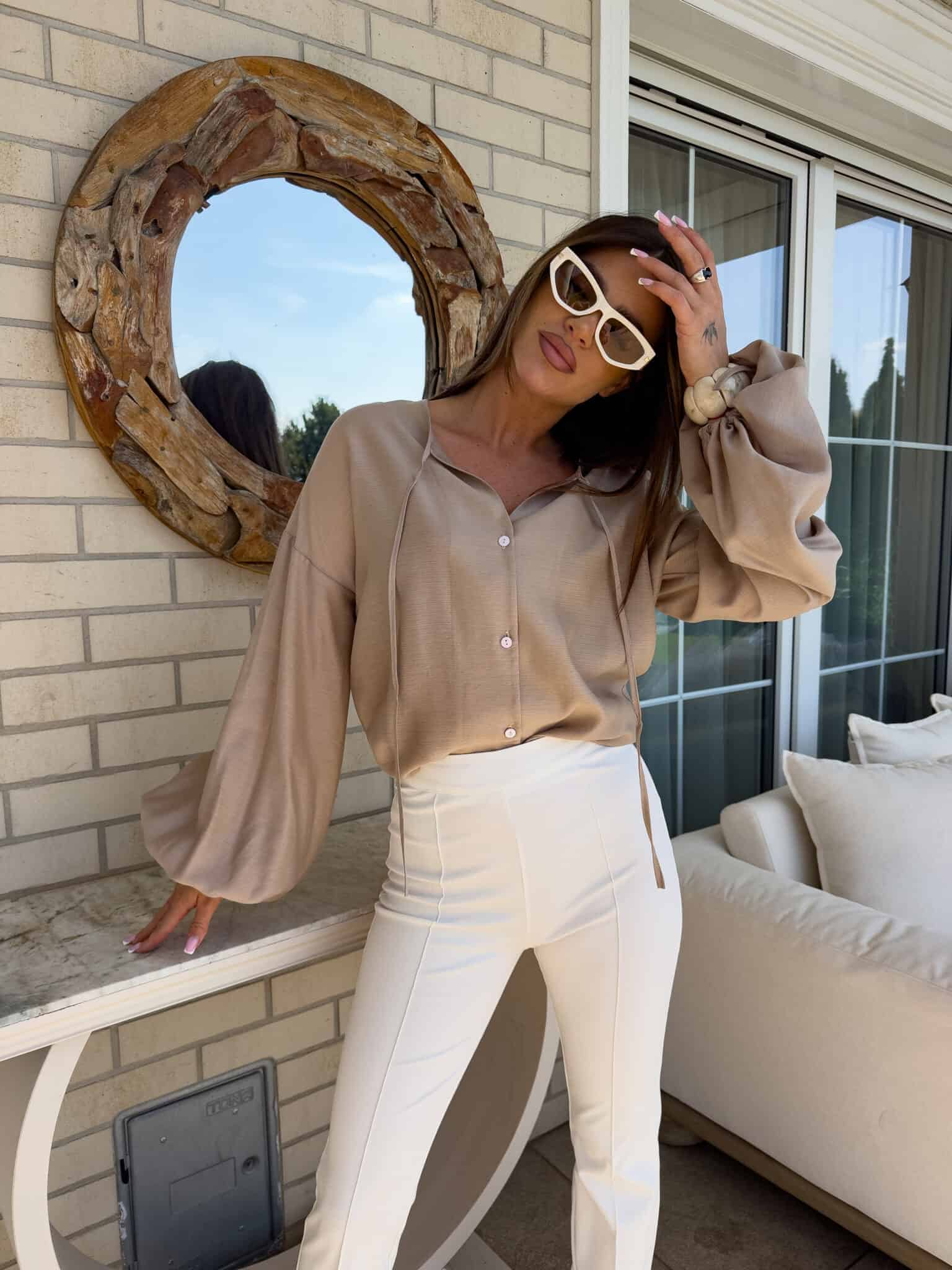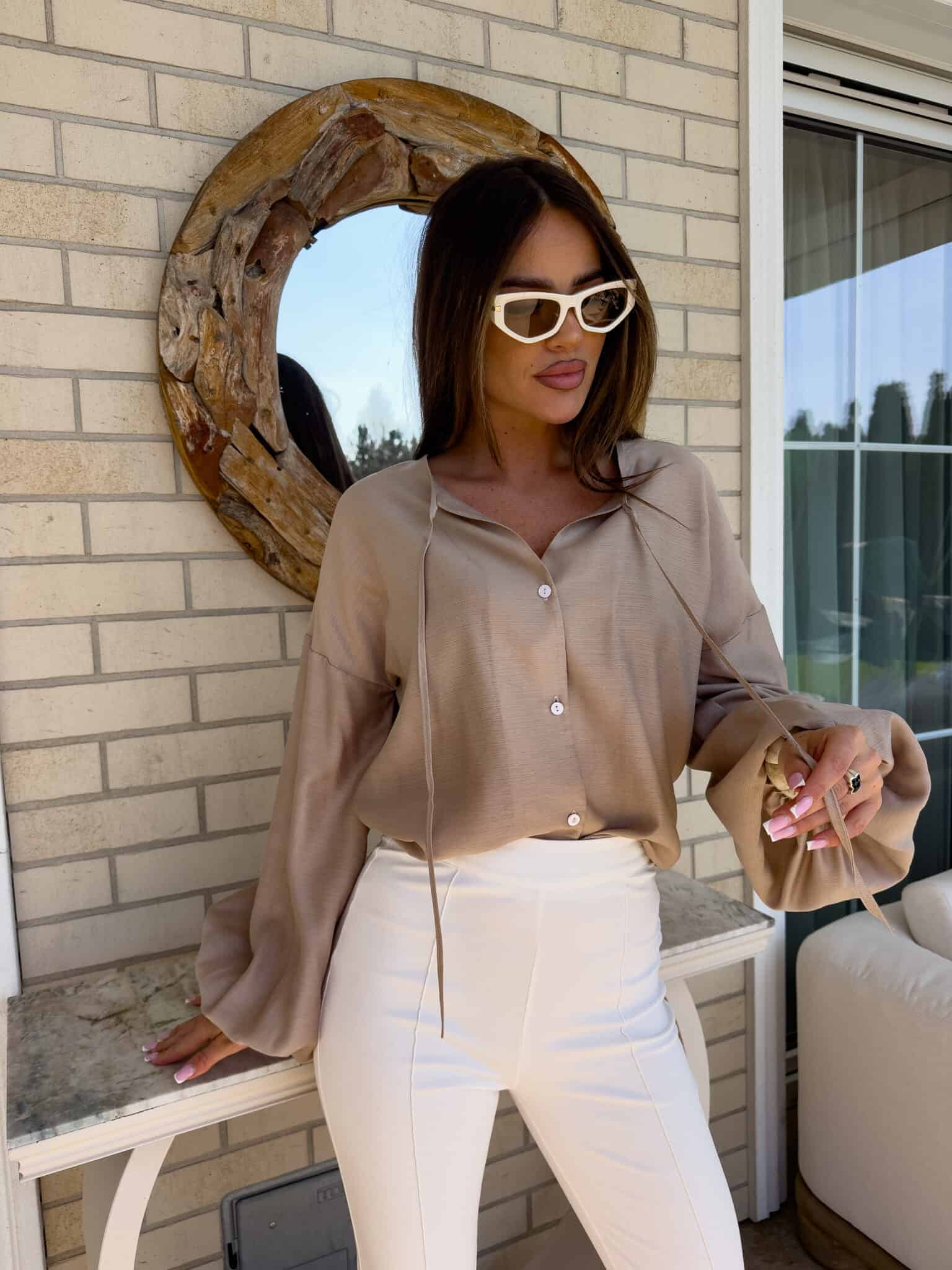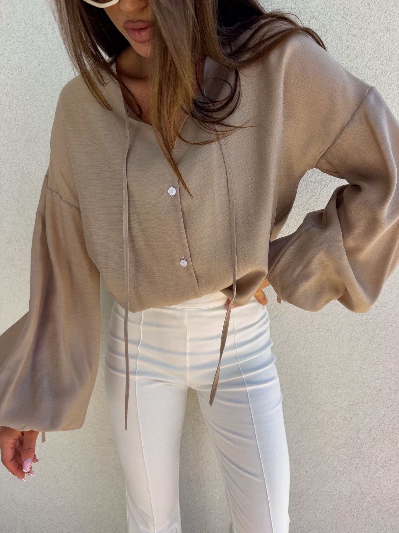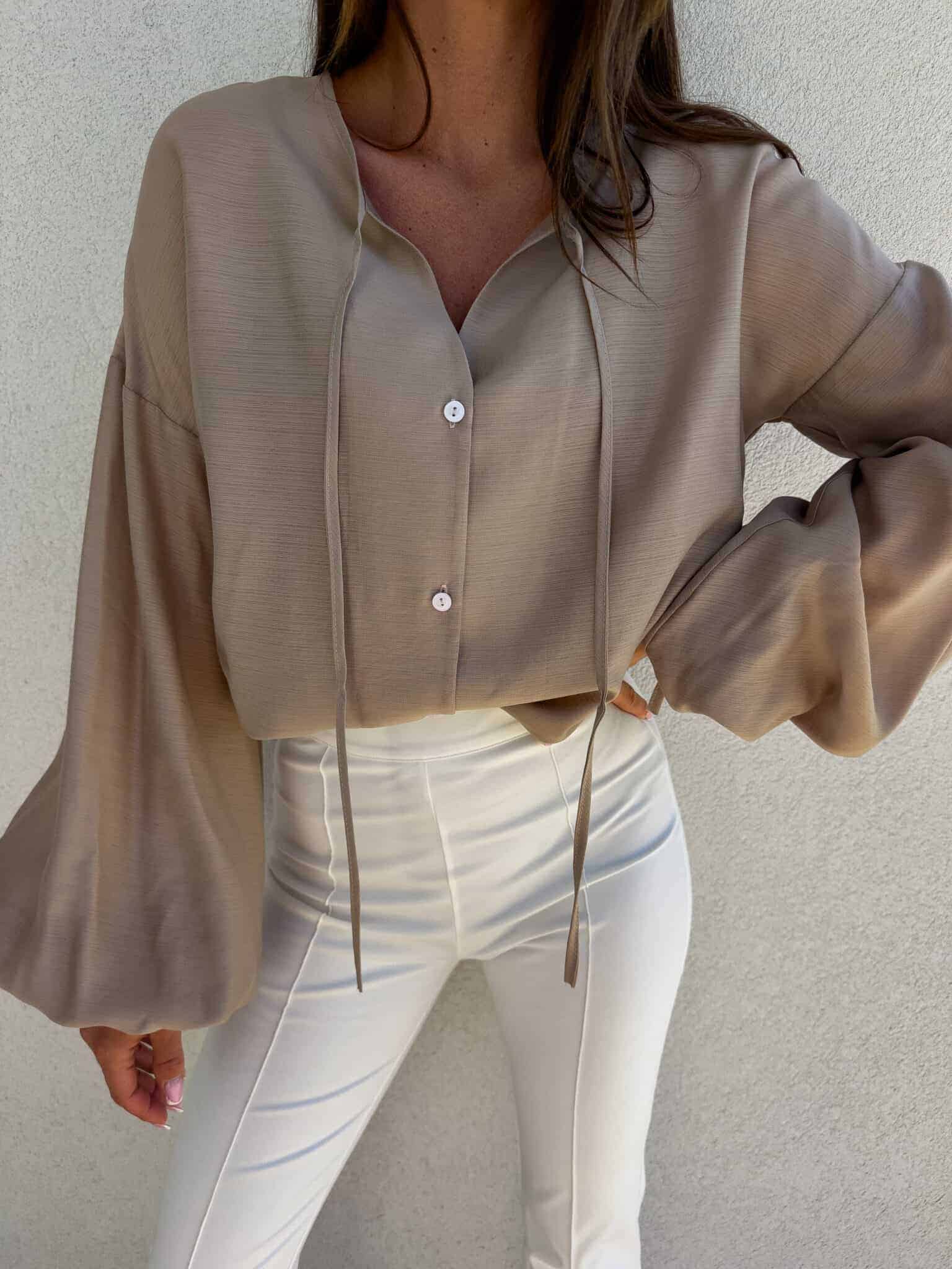 Luźny fason typu oversize to gwarancja wygody i swobody ruchów, a jednocześnie modny akcent w każdej stylizacji. Bluzka posiada dekolt z uroczym wiązaniem na troczki, które dodają całości lekkości i romantycznego charakteru. Bufiaste rękawy zakończone wiązaniem na troczki tworzą efektowną formę. Idealna do jeansów, spodni z wysokim stanem lub spódnic — na co dzień i na specjalne okazje.