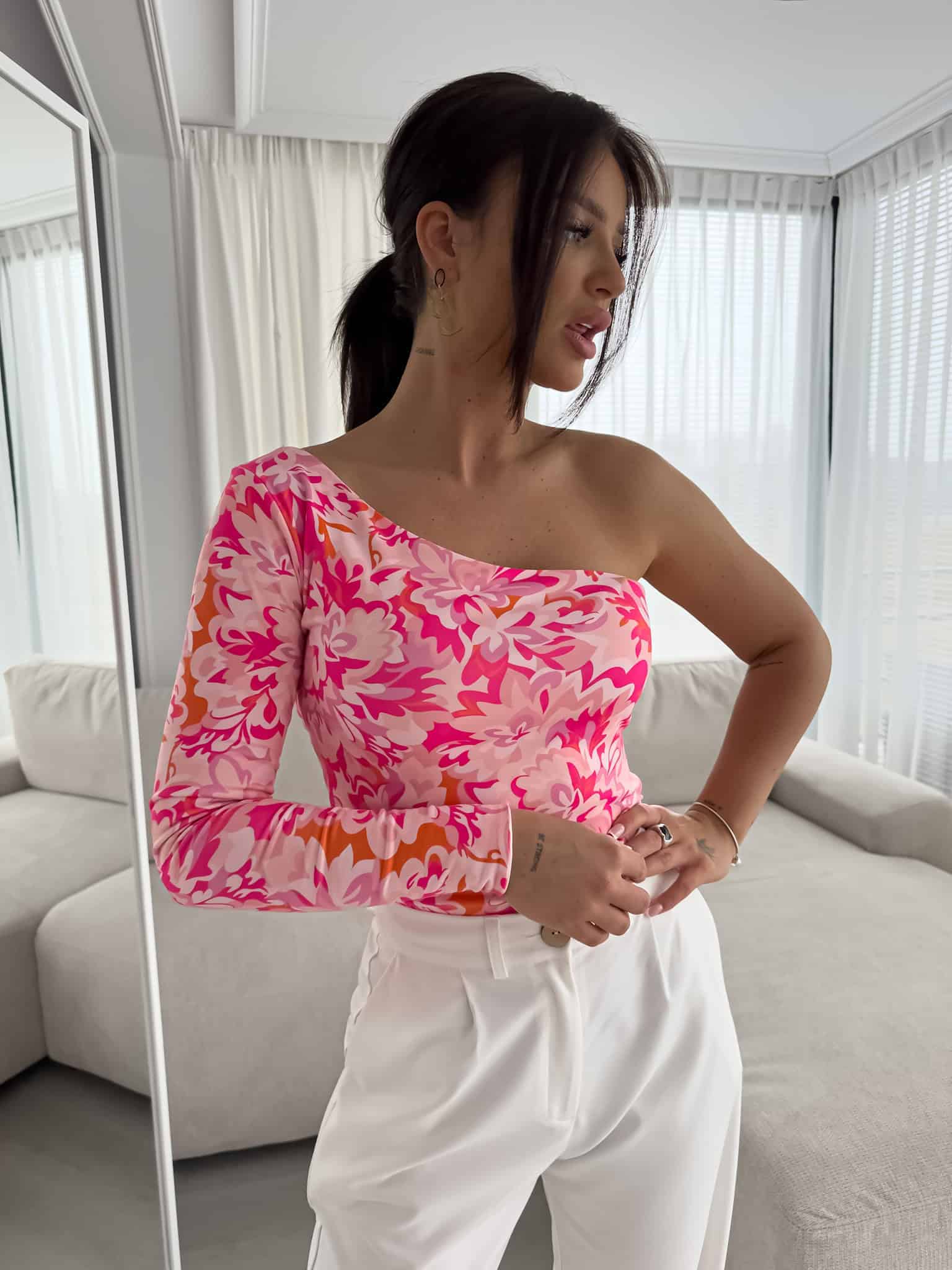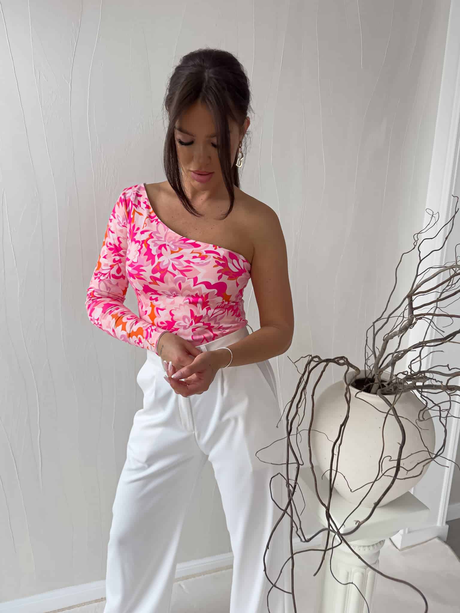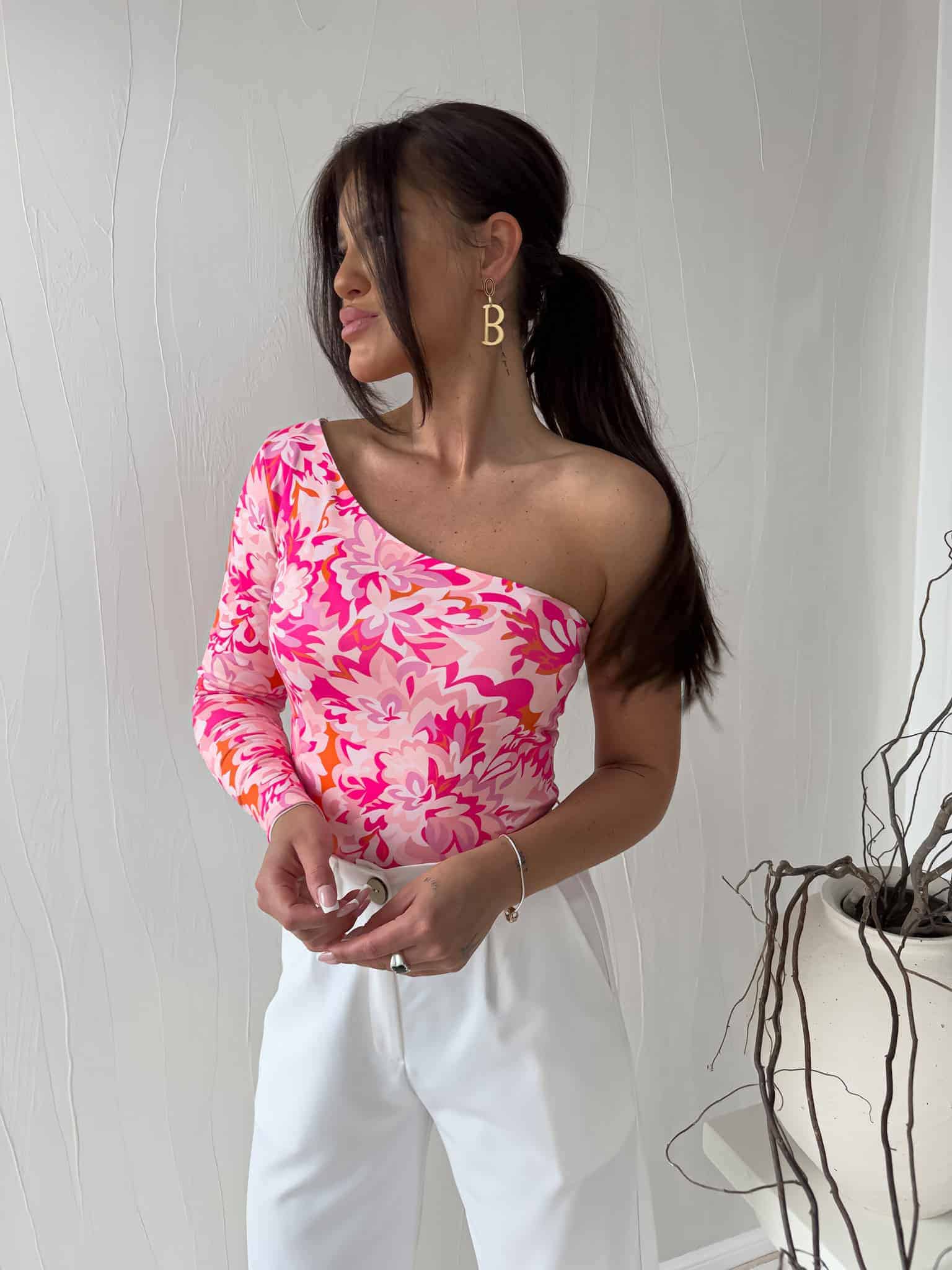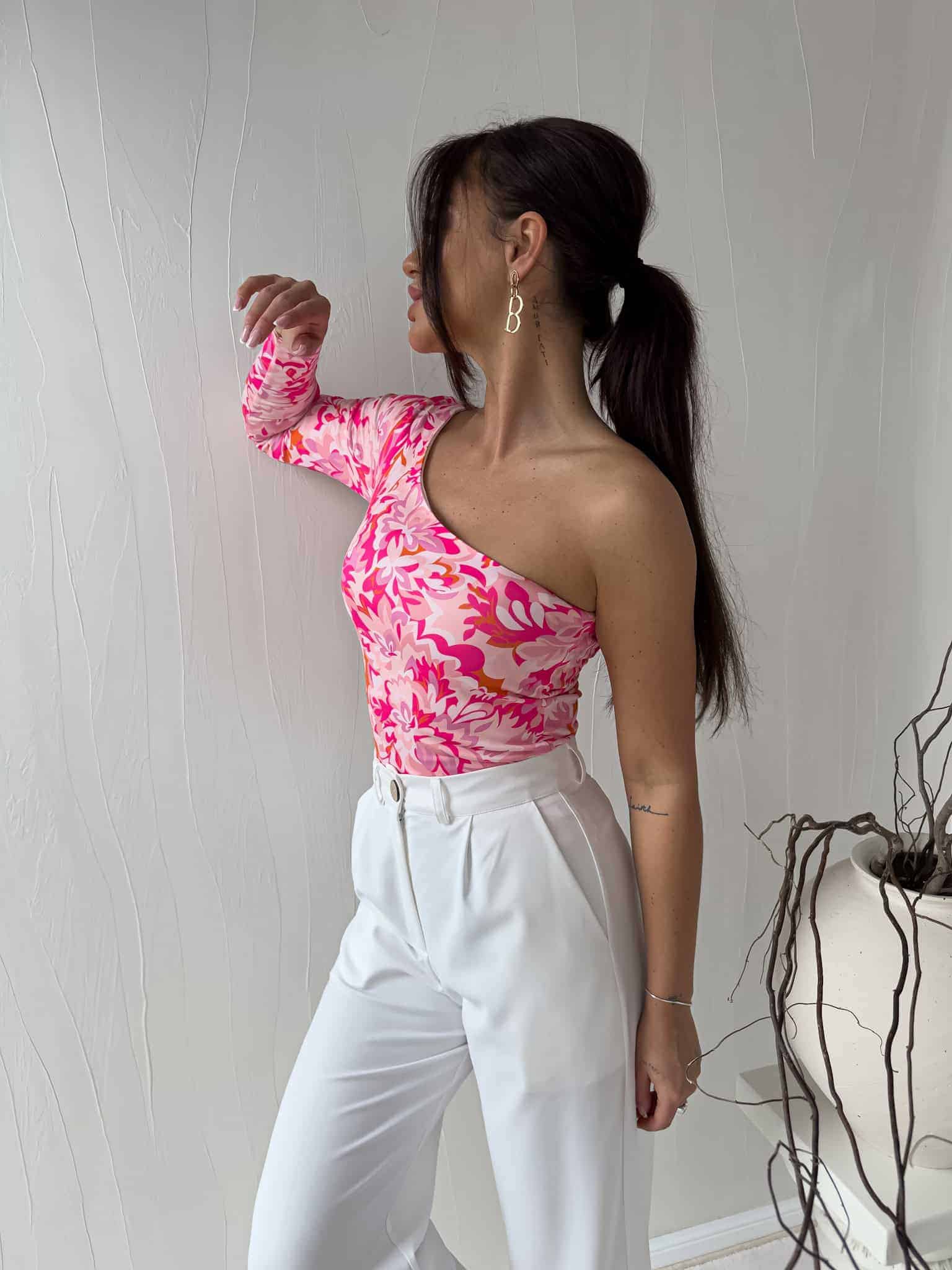 Bluzka Cintia na jednoramię z podwójnego materiału. Sprawdzi się do wielu stylizacji.