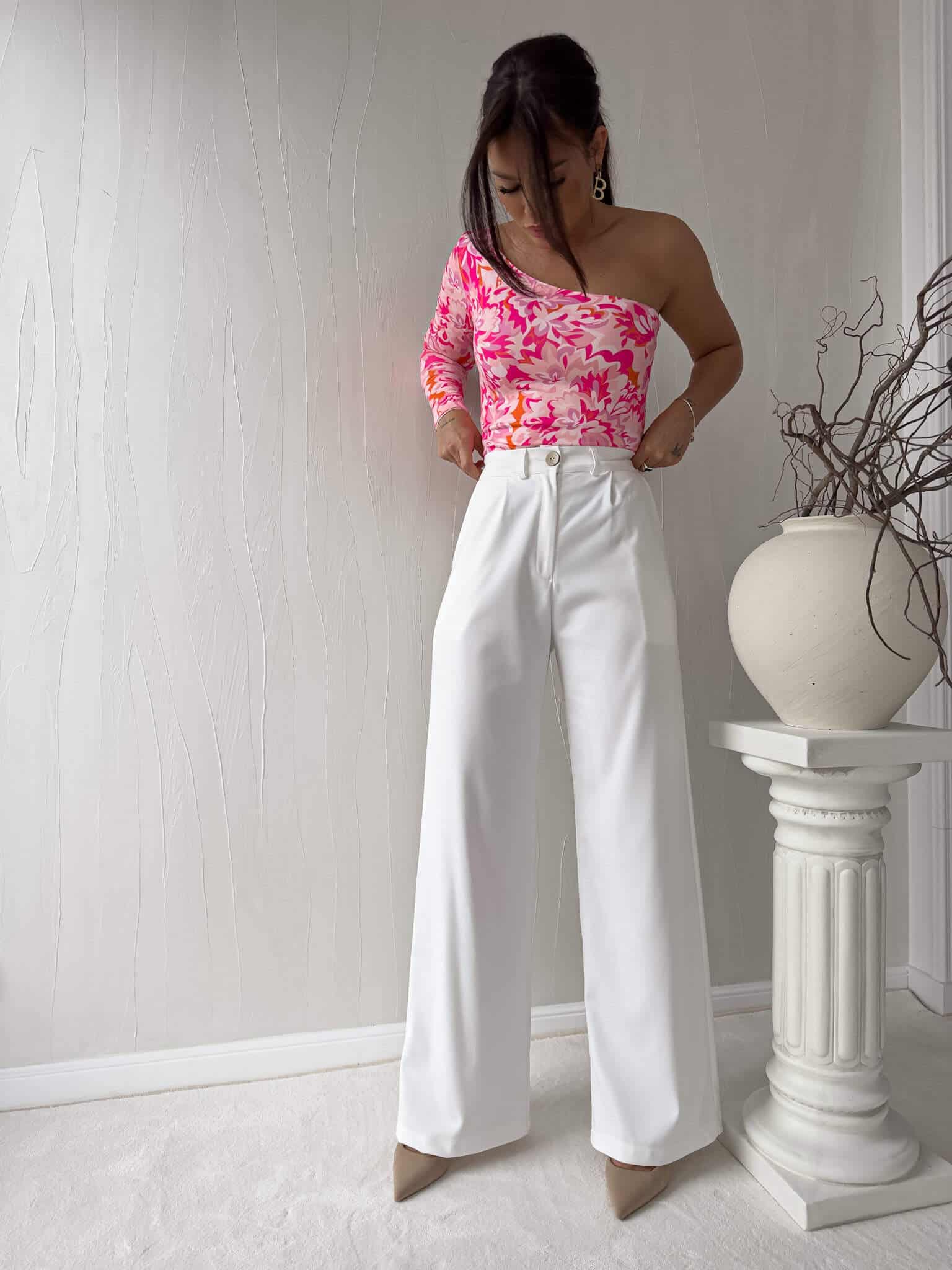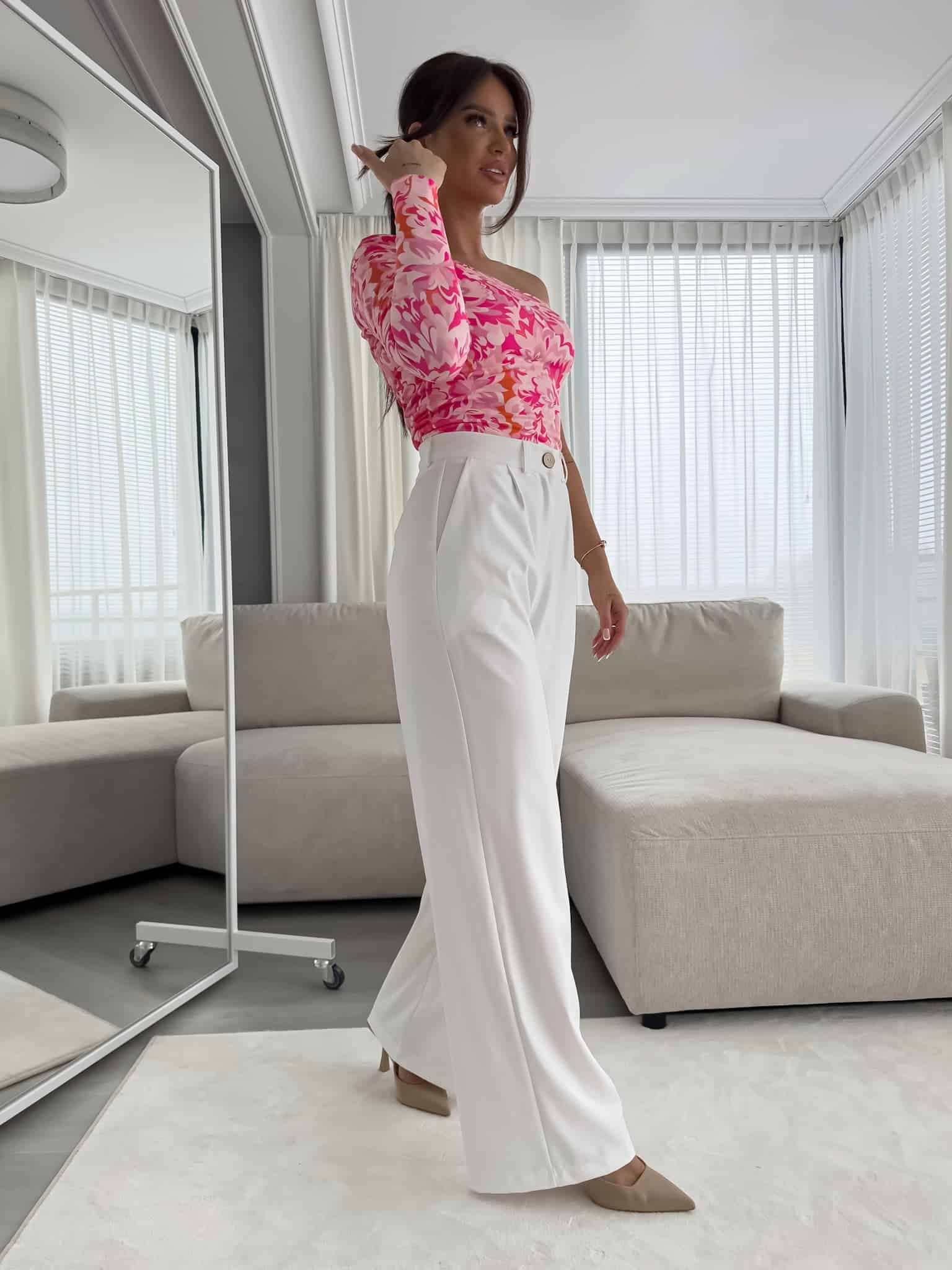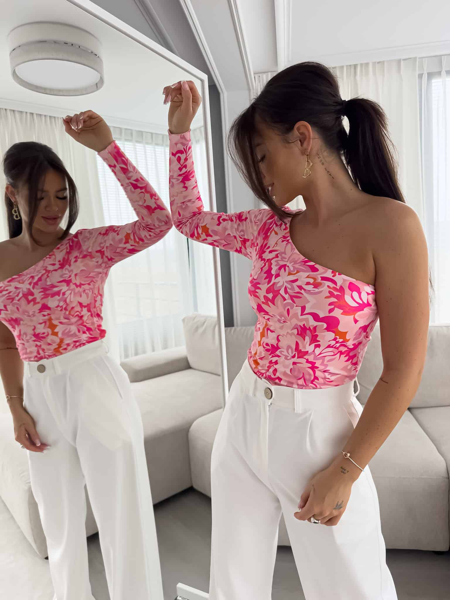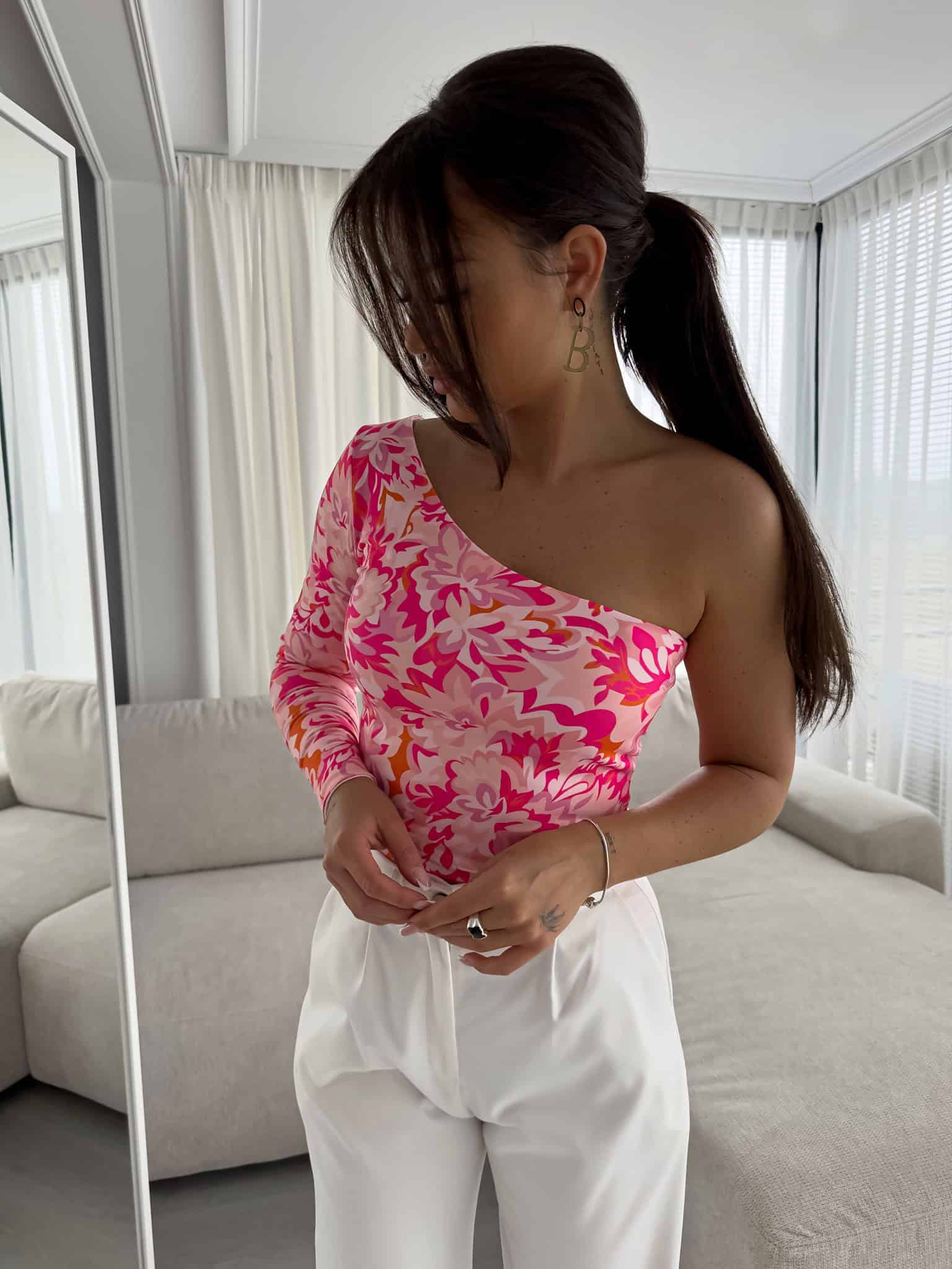 Bluzka Cintia na jednoramię z podwójnego materiału. Sprawdzi się do wielu stylizacji.
