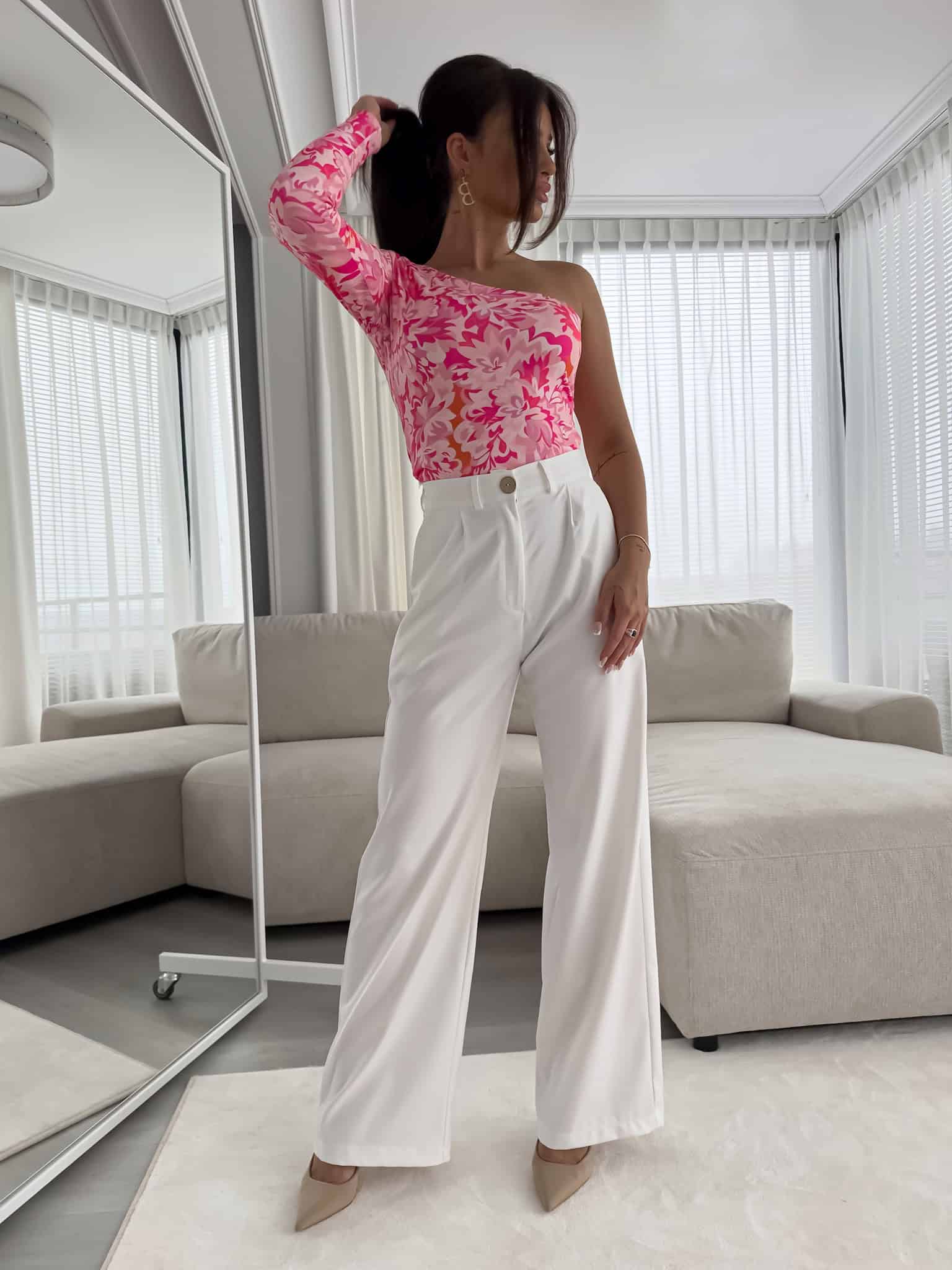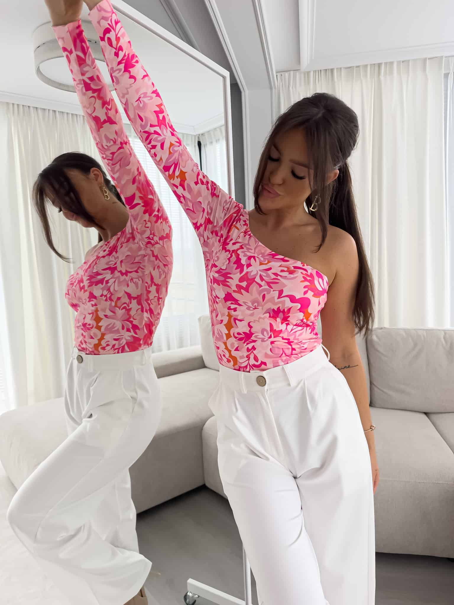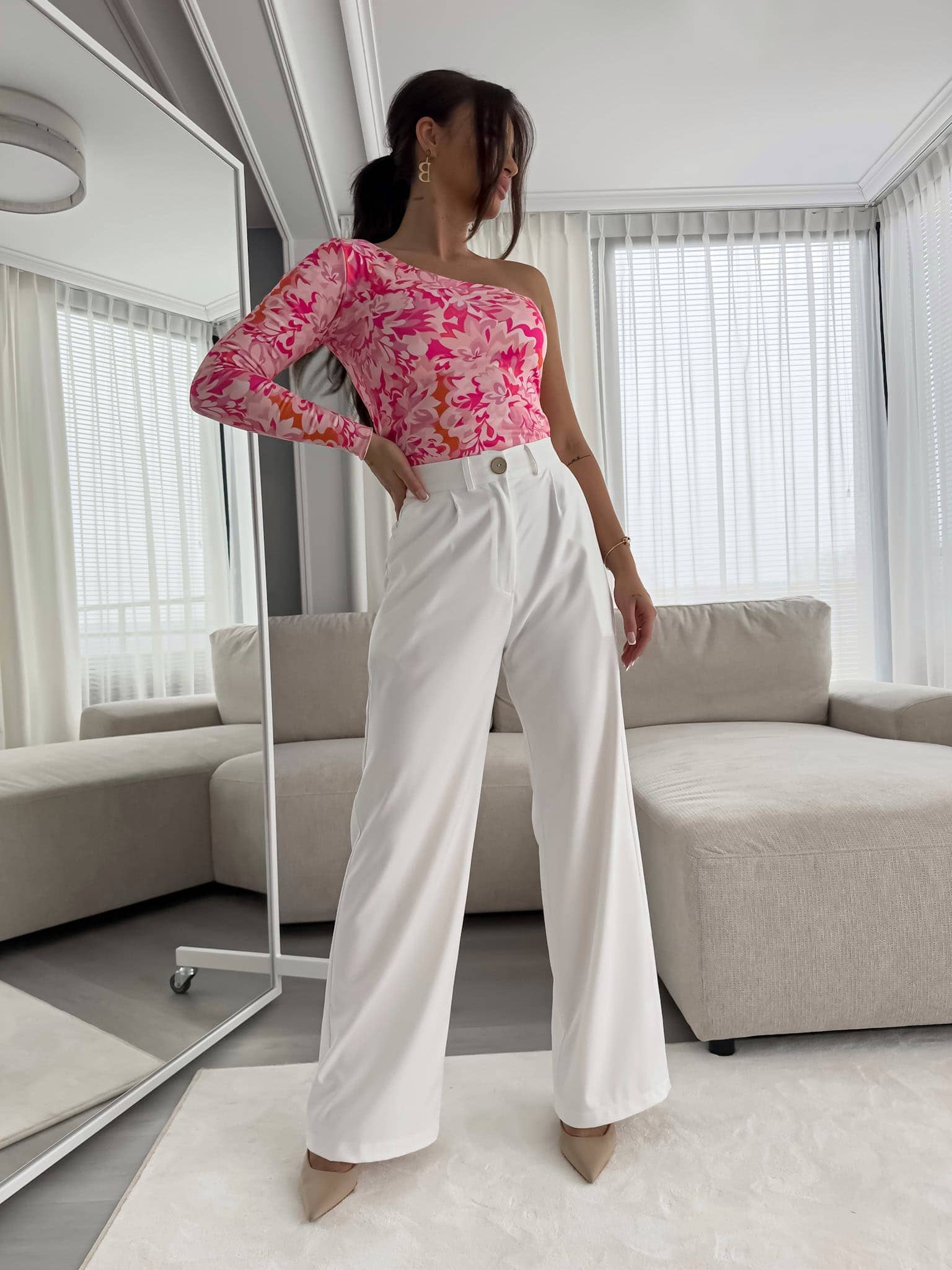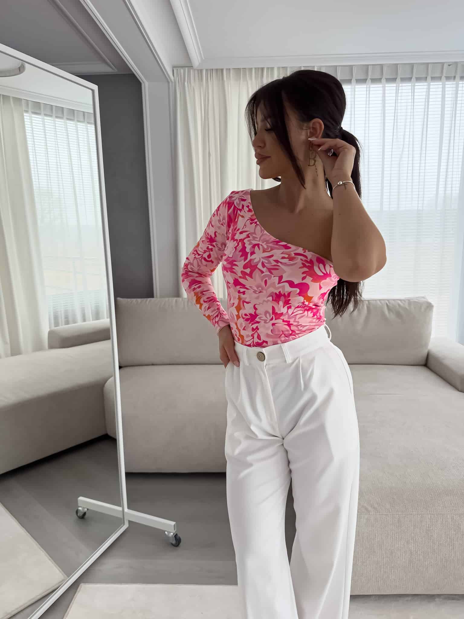 Bluzka Cintia na jednoramię z podwójnego materiału. Sprawdzi się do wielu stylizacji.