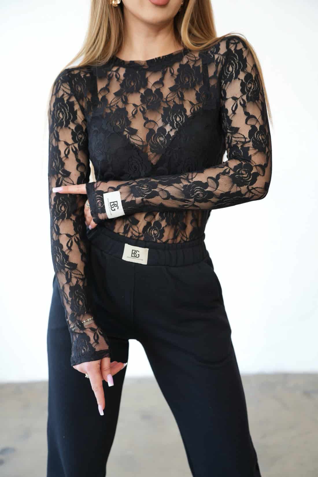 Opis produktu: Bluzka z długim rękawem BG MANIFEST z elastycznej koronki. Bluzka posiada ozdobną naszywkę z logo marki na lewym rękawie. Krój dopasowany.