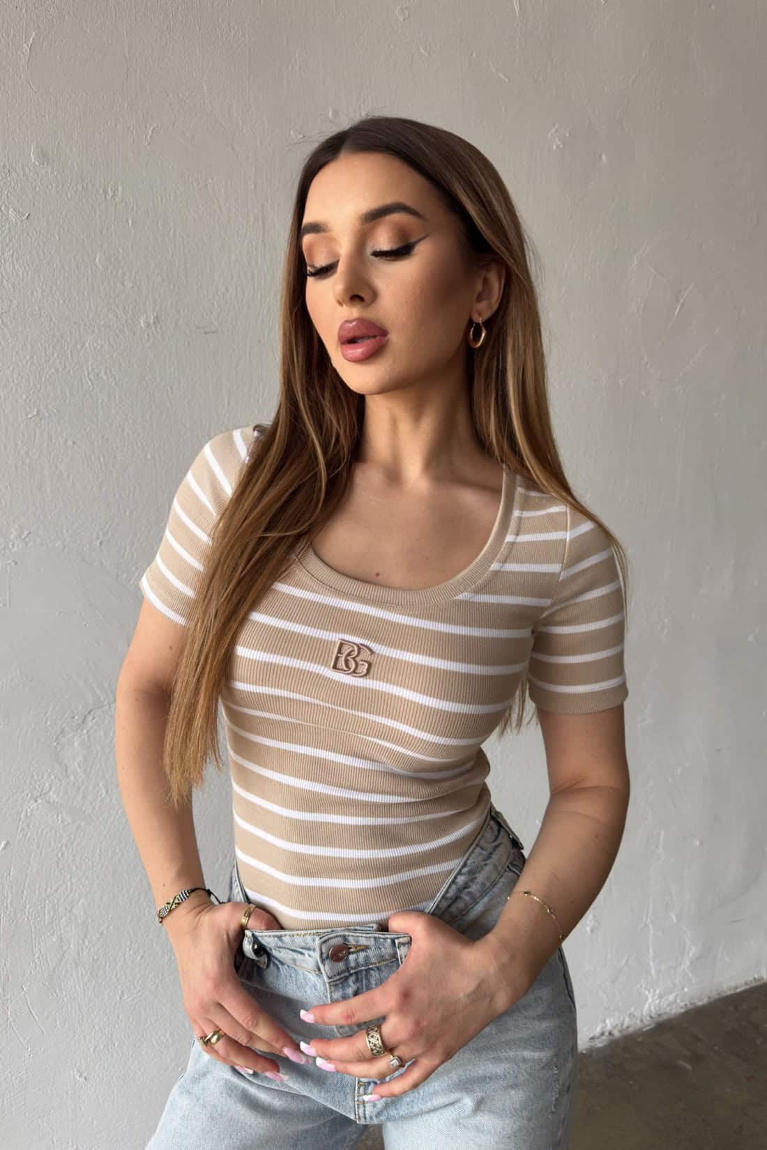 Opis produktu: Bluzka damska BG SISI z elastycznego bawełnianego ściągacza dzianego fabrycznie w paski. Bluzka z krótkim rękawem, dekold okrągły, klasyczne logowanie marki BG w 3D na środku.