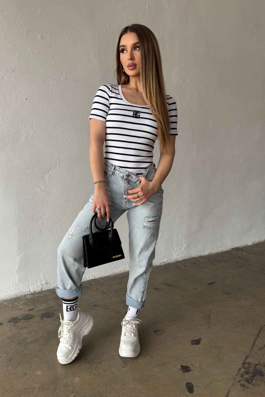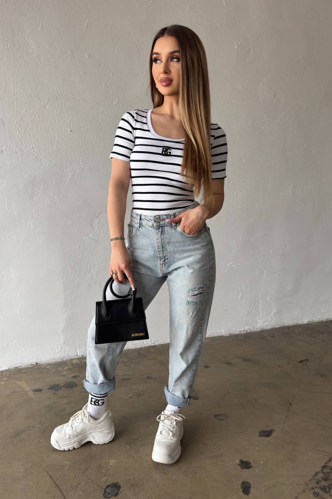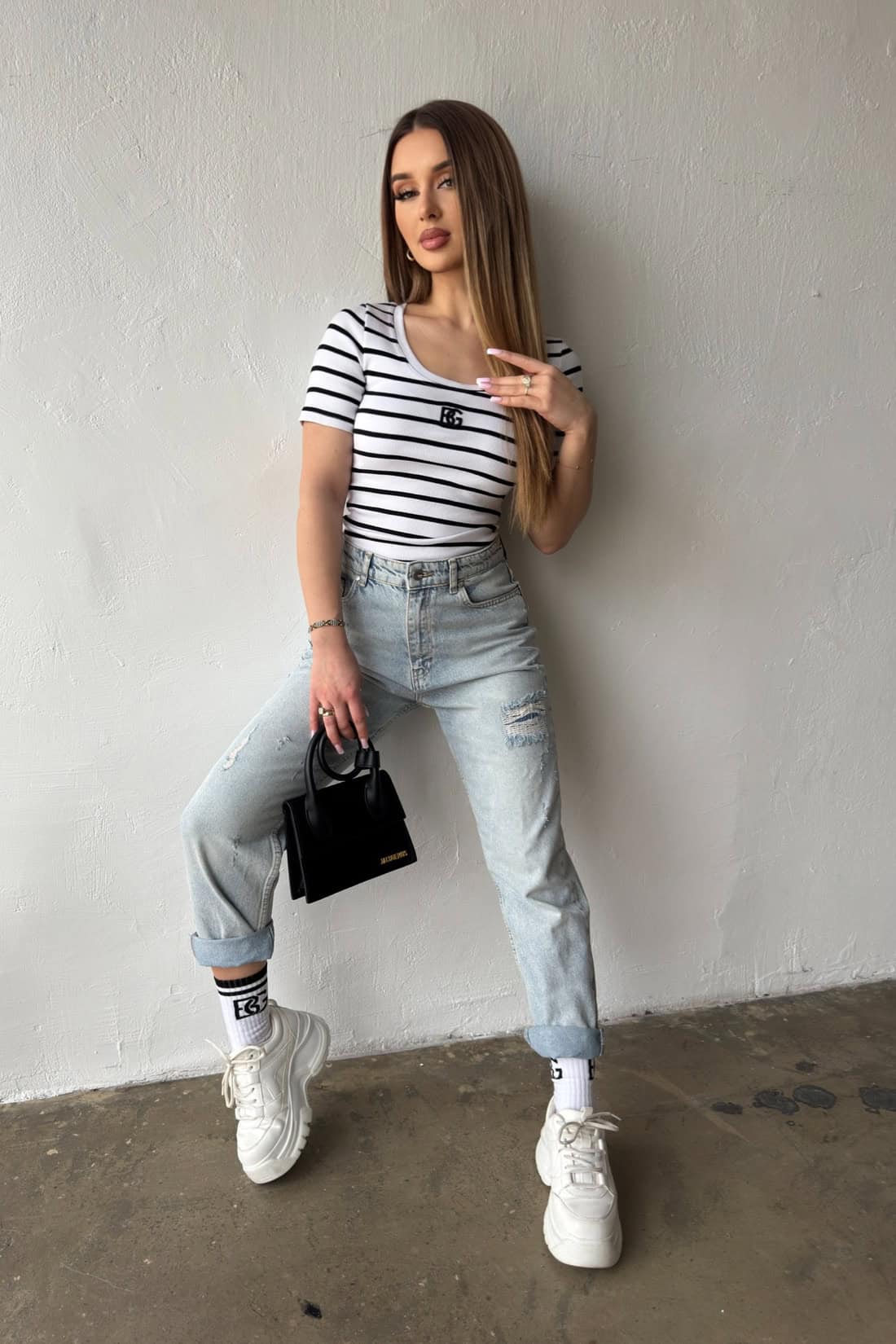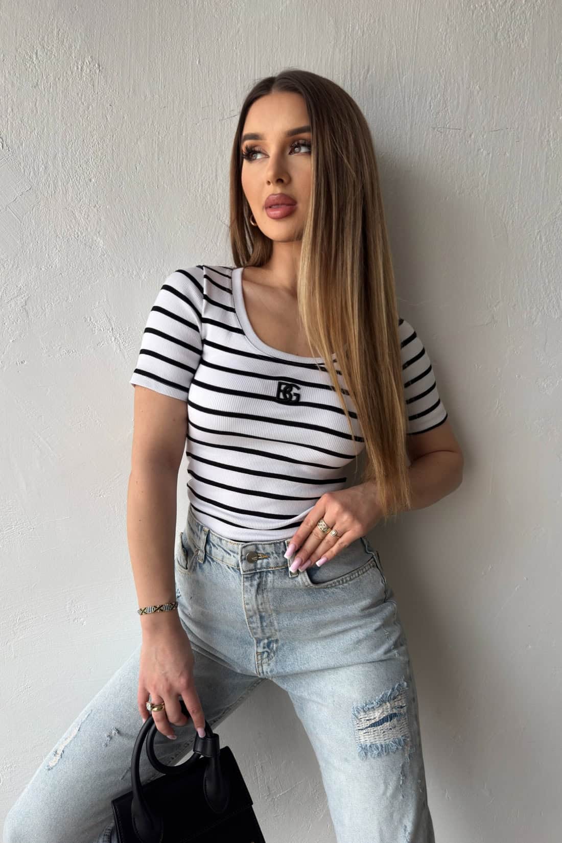 Opis produktu: Bluzka damska BG SISI z elastycznego bawełnianego ściągacza dzianego fabrycznie w paski. Bluzka z krótkim rękawem, dekold okrągły, klasyczne logowanie marki BG w 3D na środku.