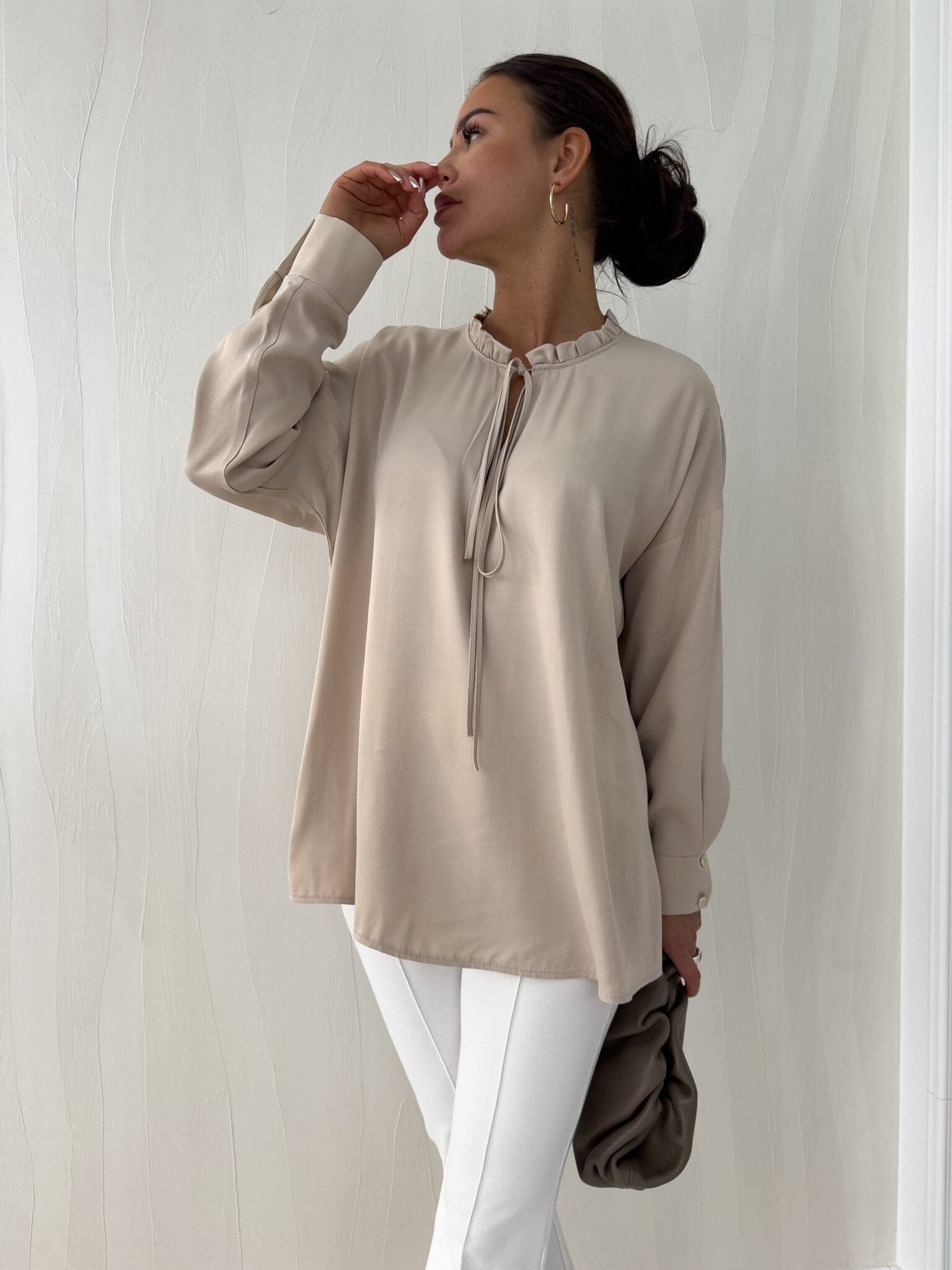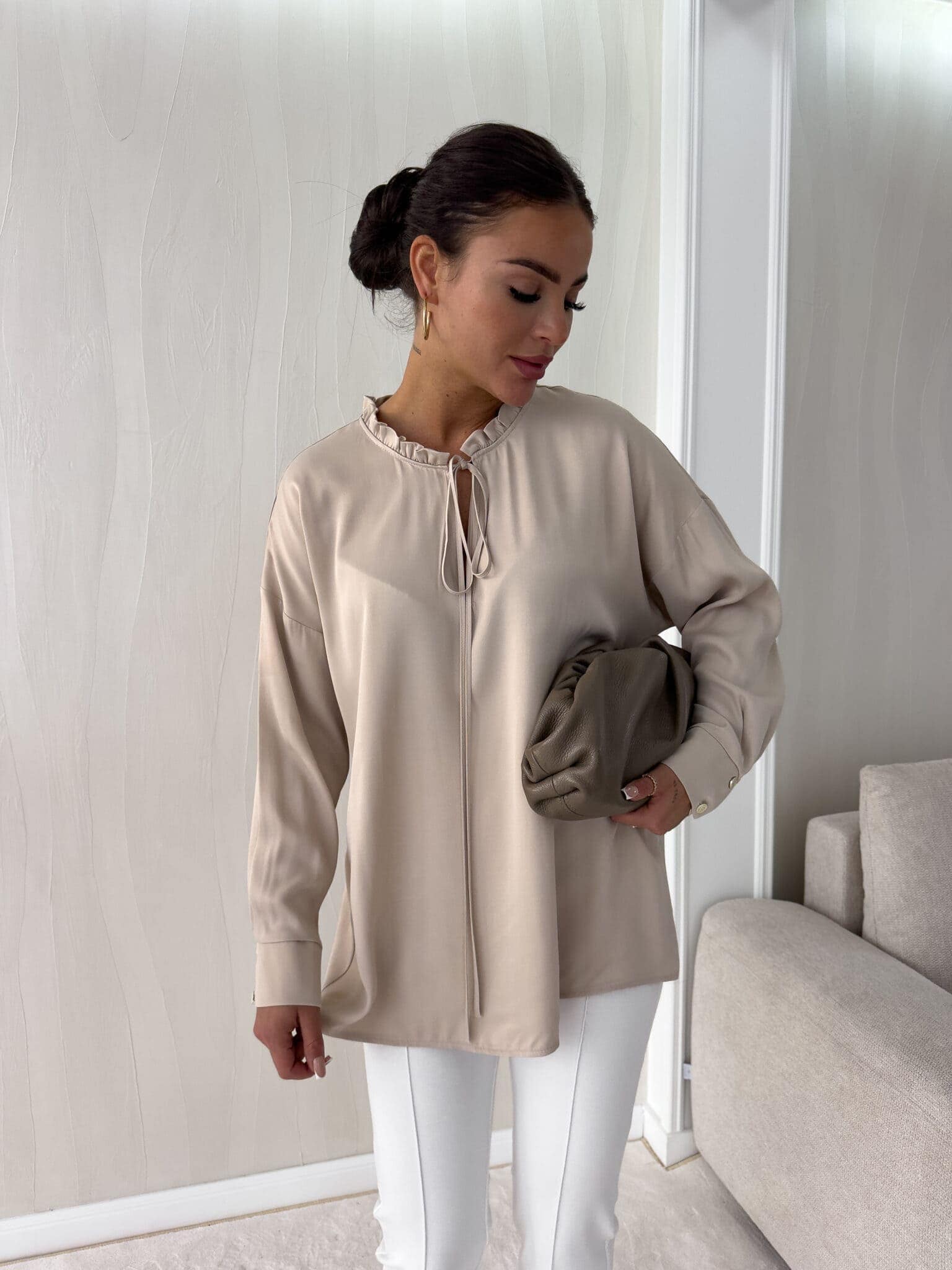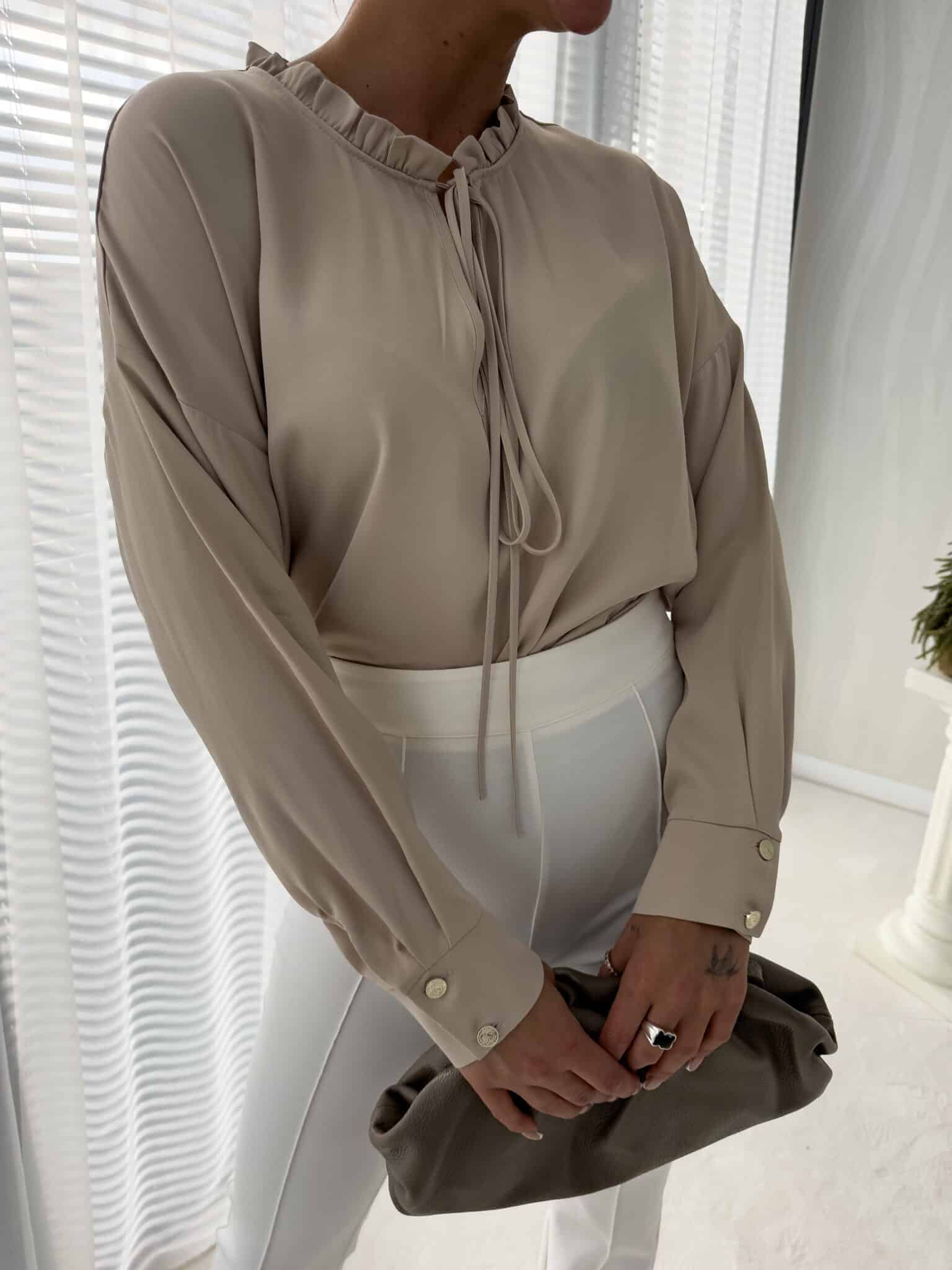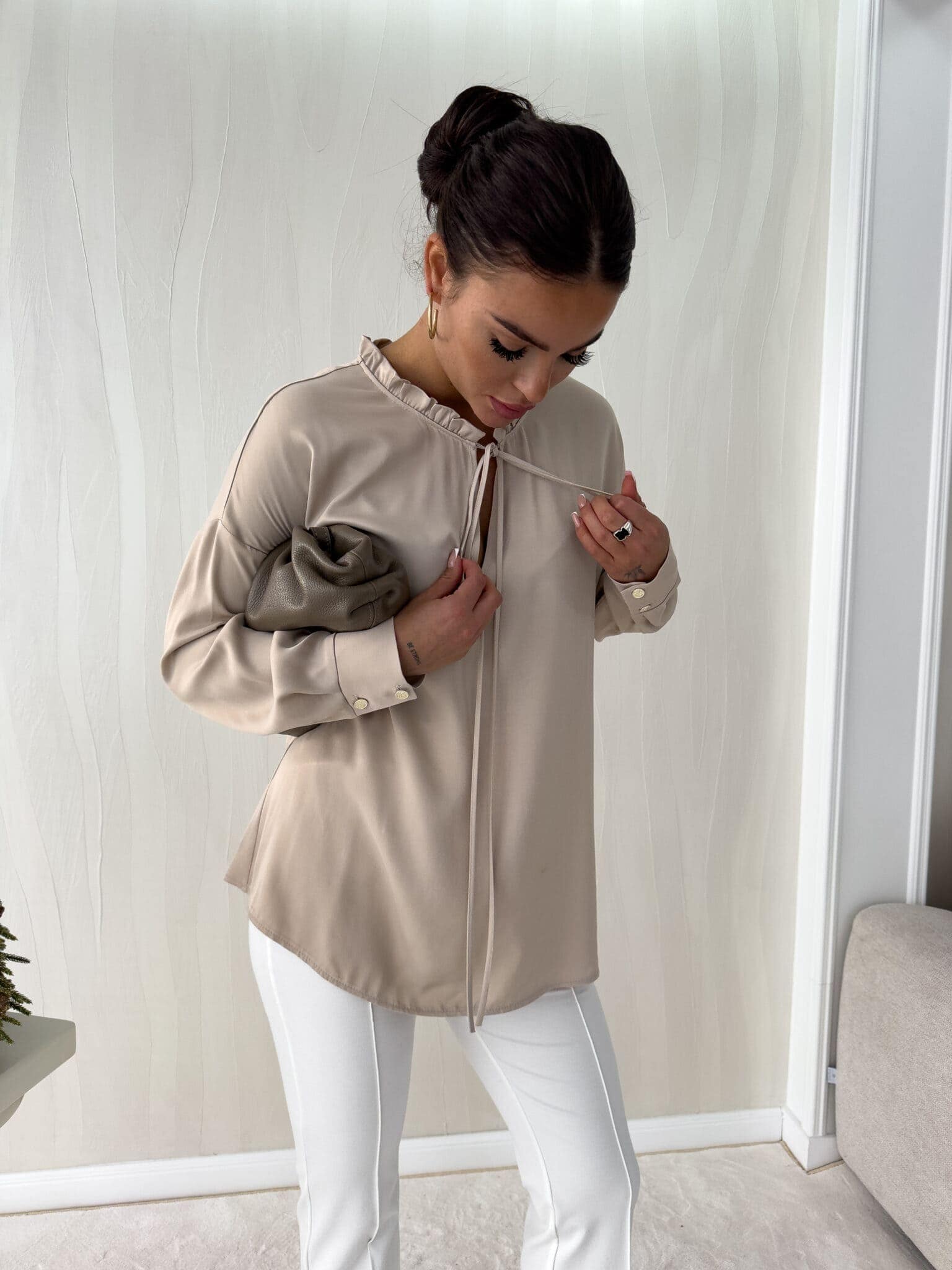 Bluzka Elegant typu oversize z najwyższej jakości materiału. Dekolt wiązany z delikatną falbanką. Rękawy z mankietami zapinane na guzik.