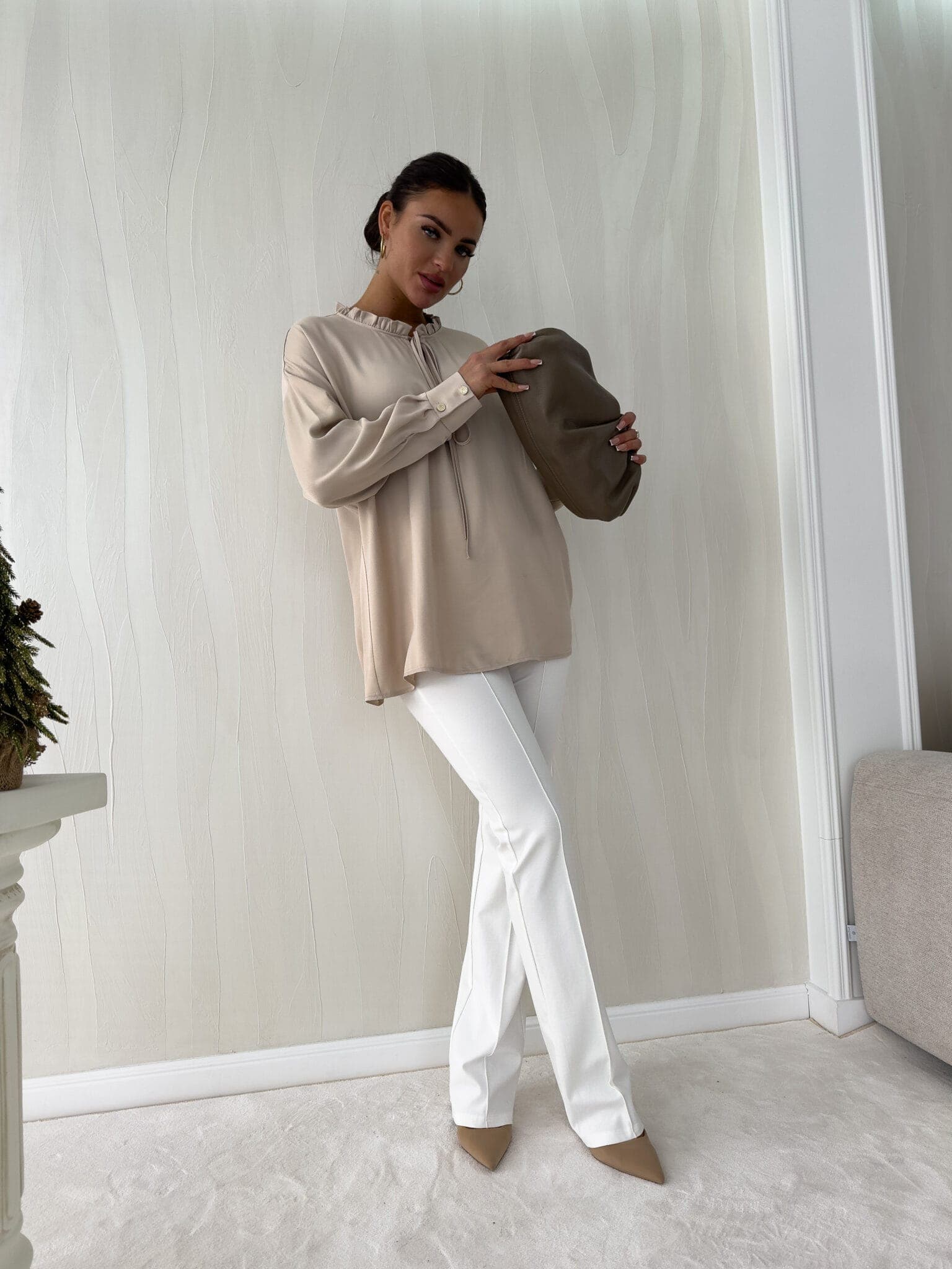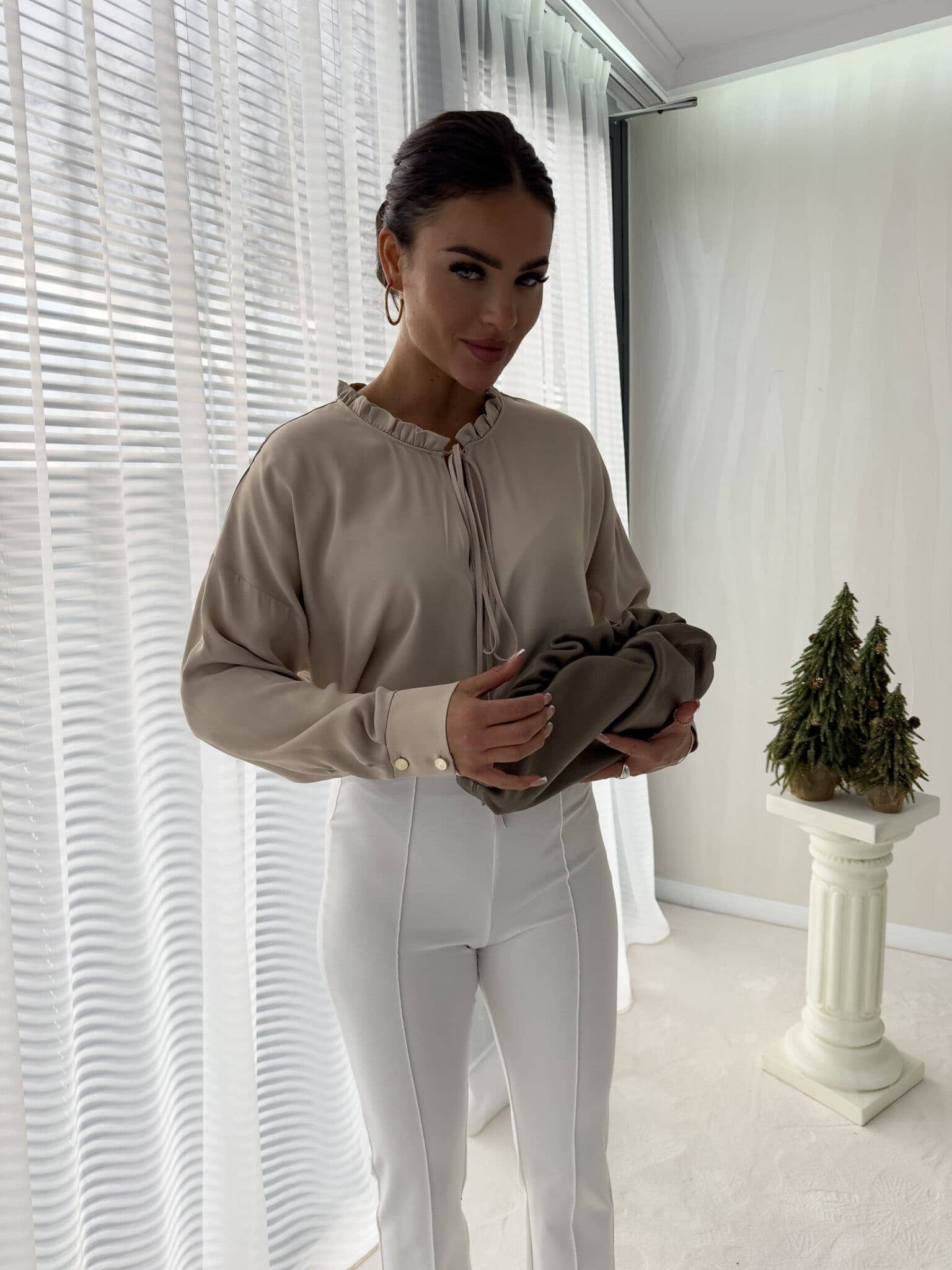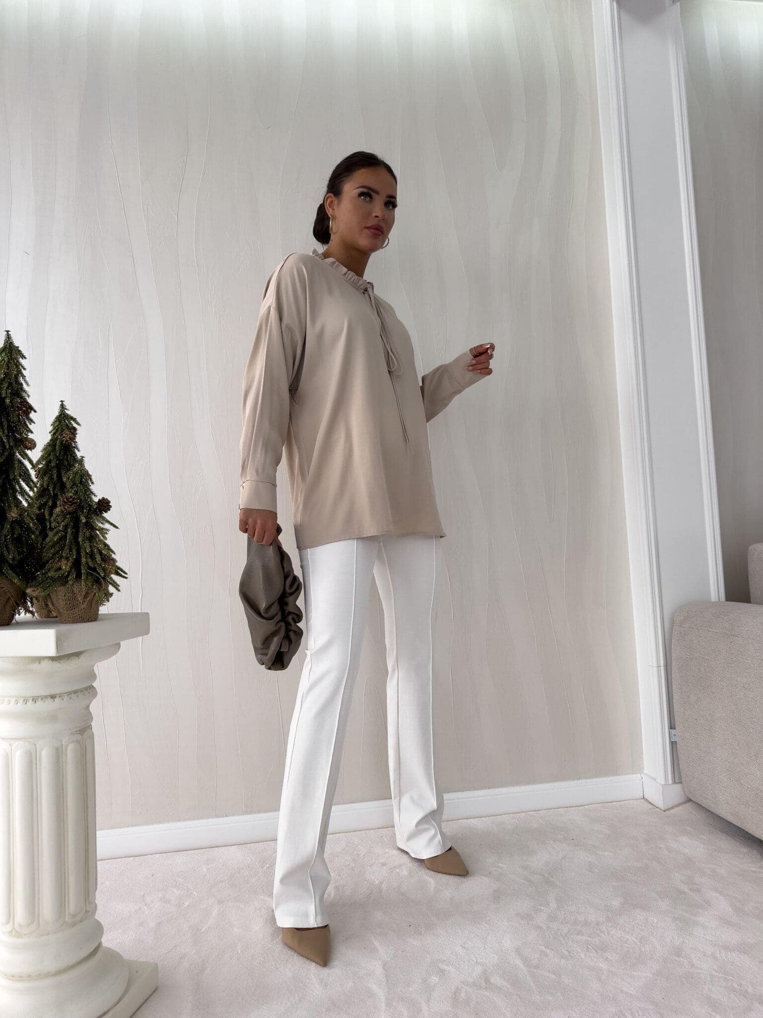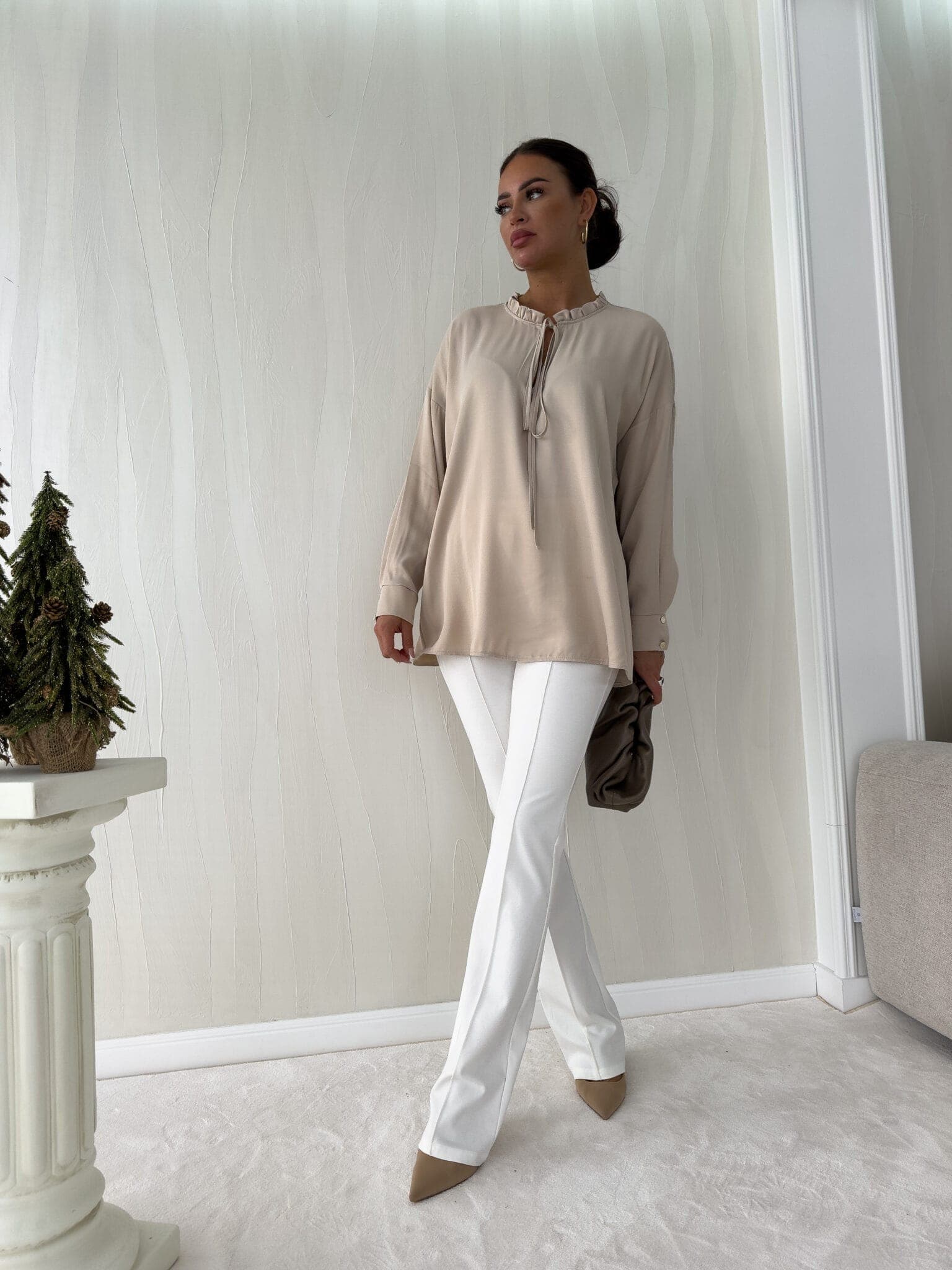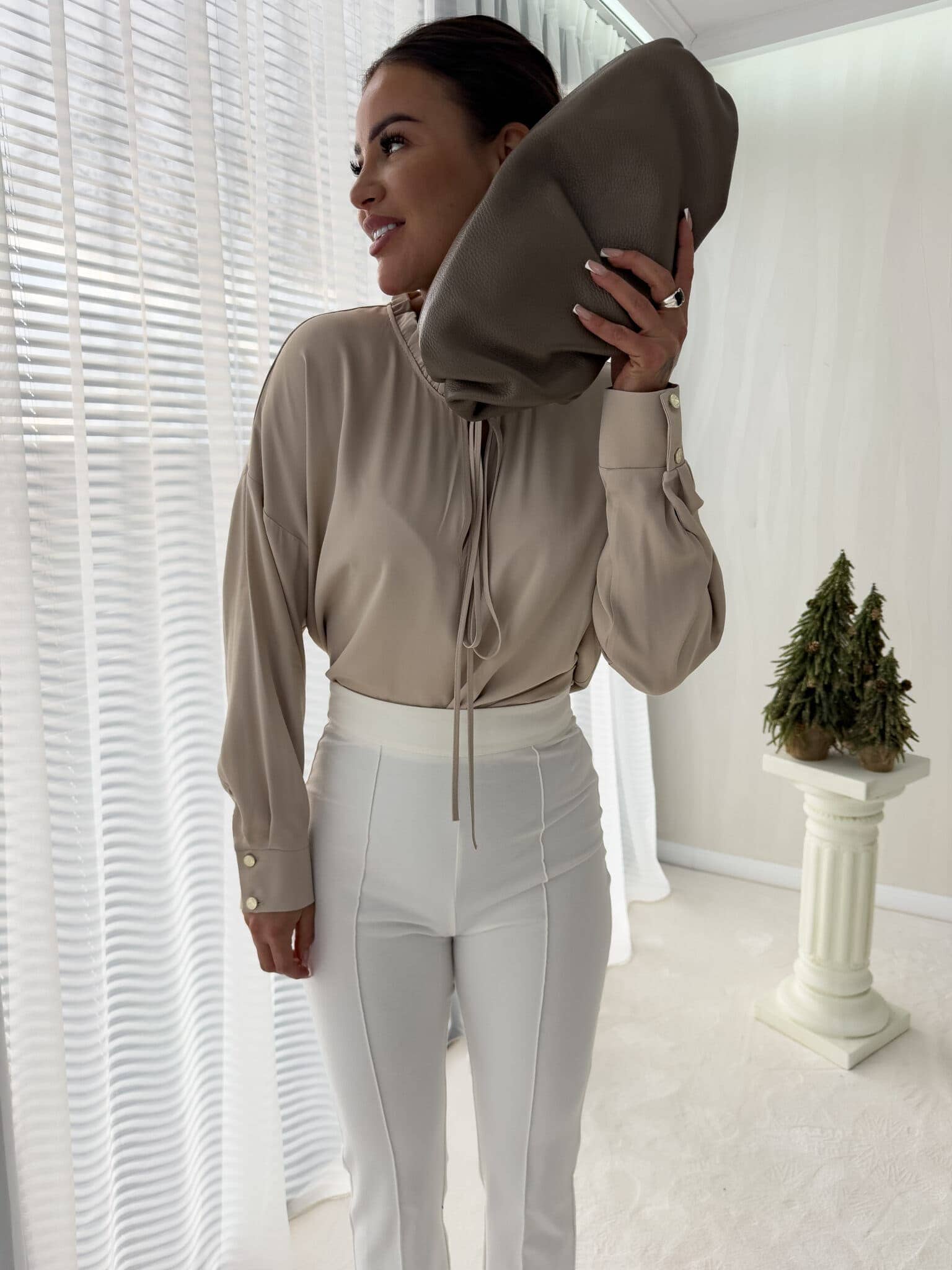 Bluzka Elegant typu oversize z najwyższej jakości materiału. Dekolt wiązany z delikatną falbanką. Rękawy z mankietami zapinane na guzik.