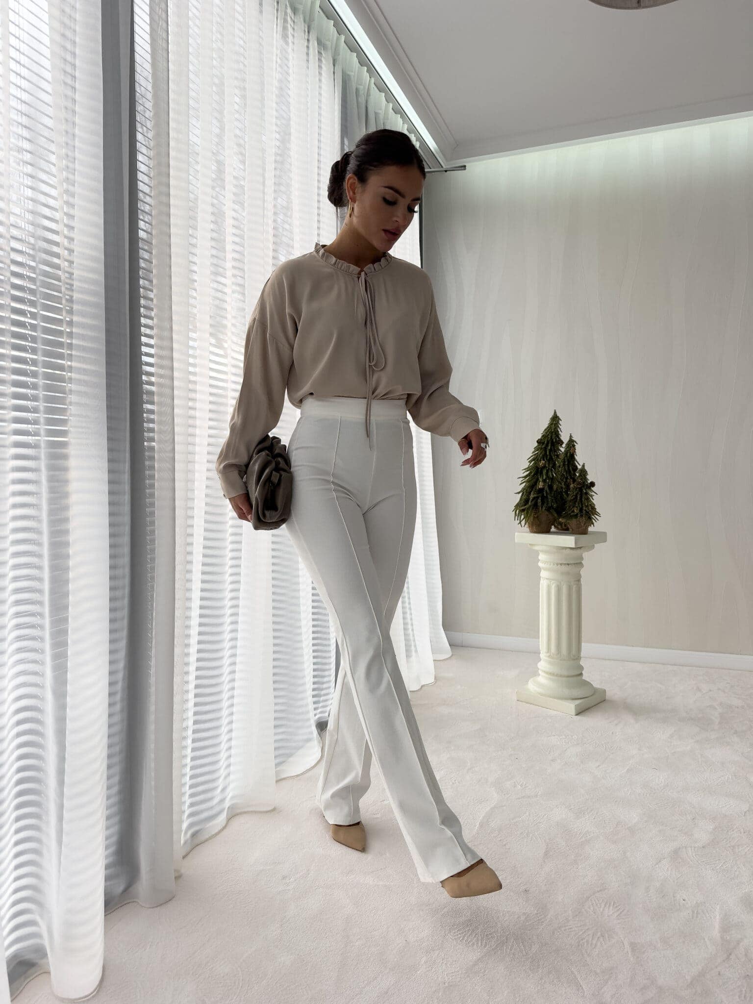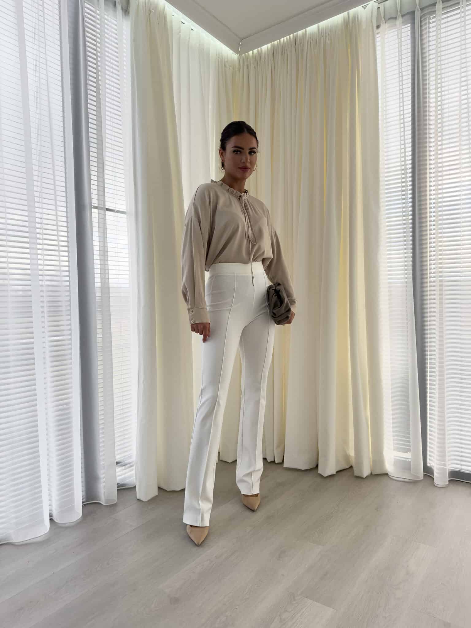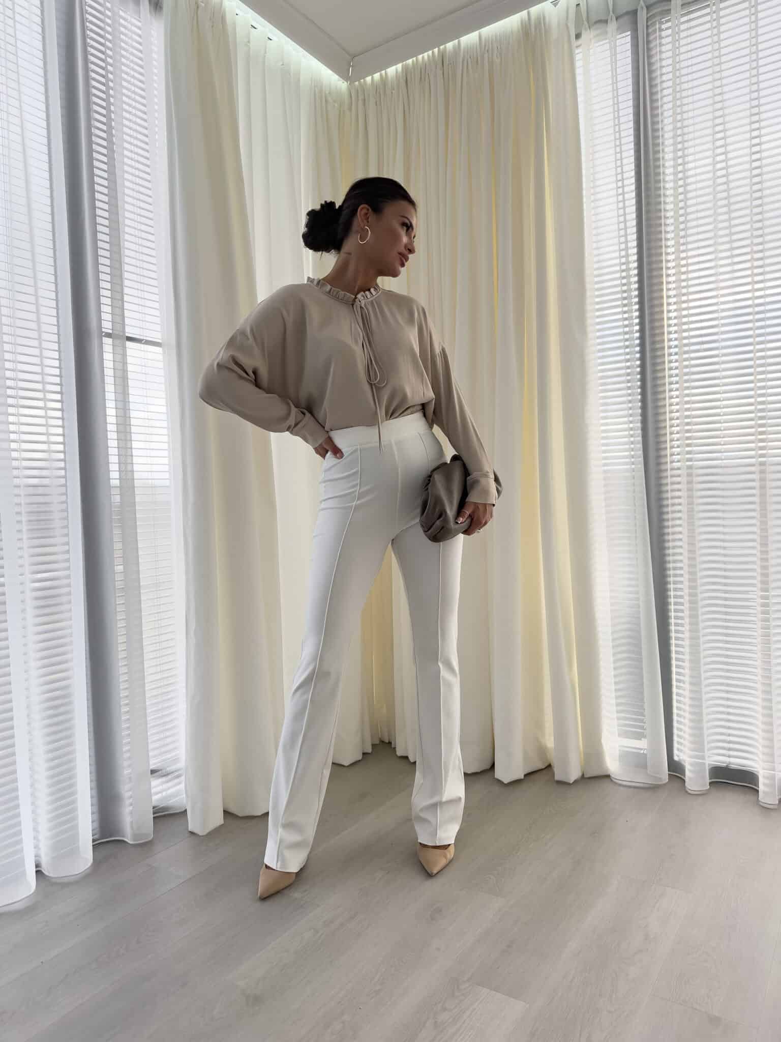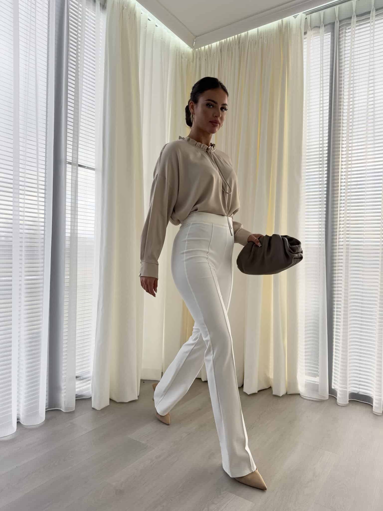 Bluzka Elegant typu oversize z najwyższej jakości materiału. Dekolt wiązany z delikatną falbanką. Rękawy z mankietami zapinane na guzik.