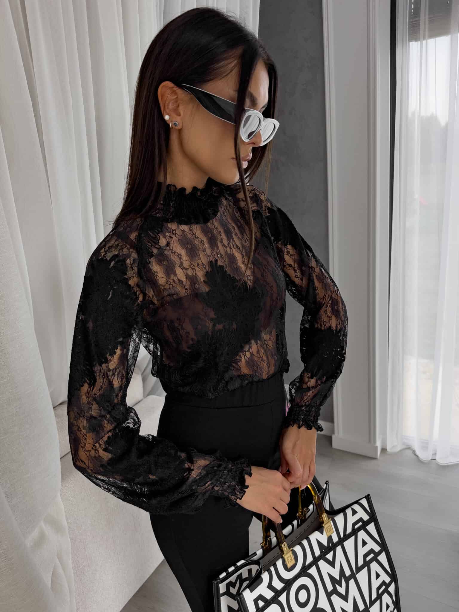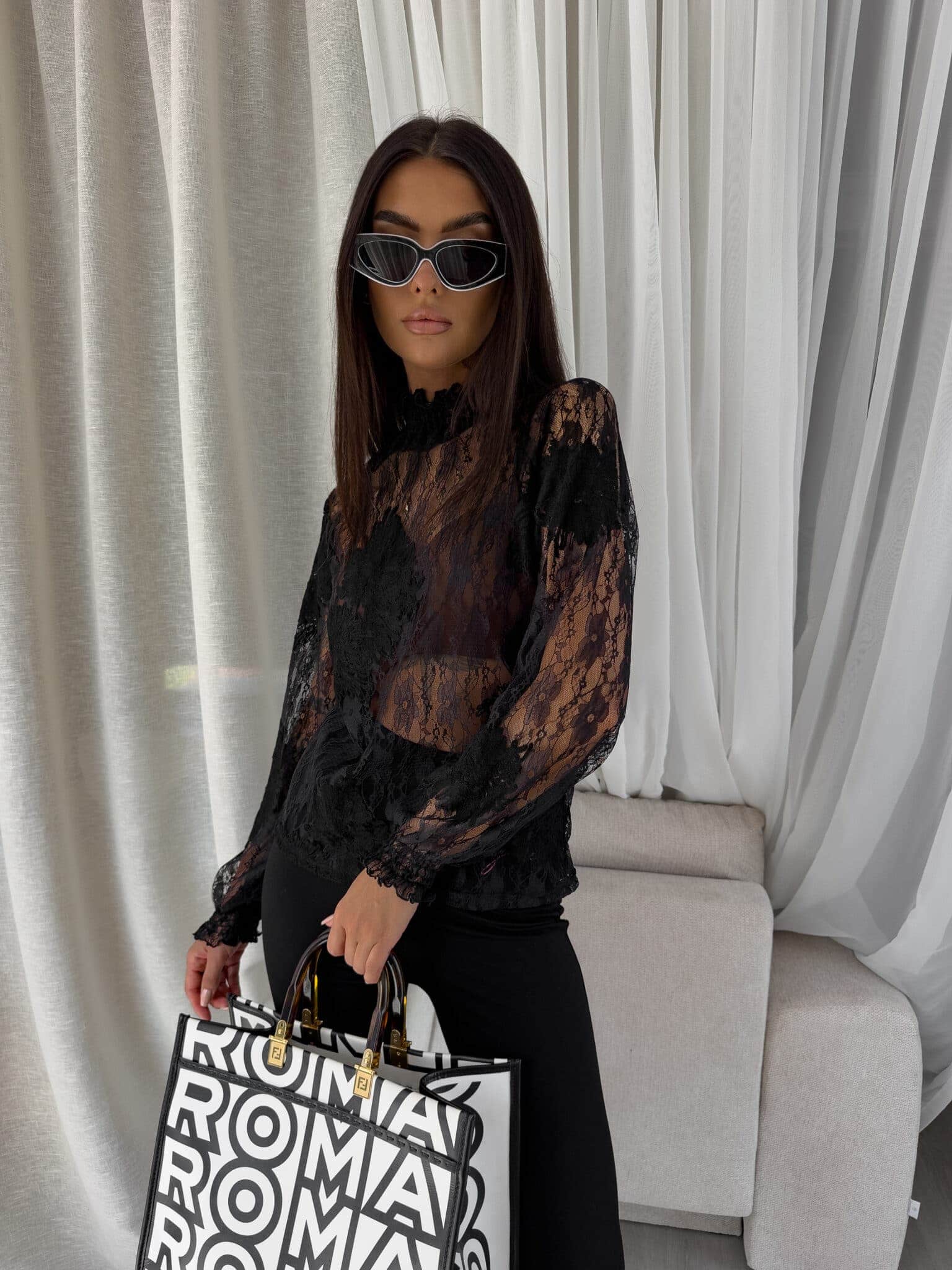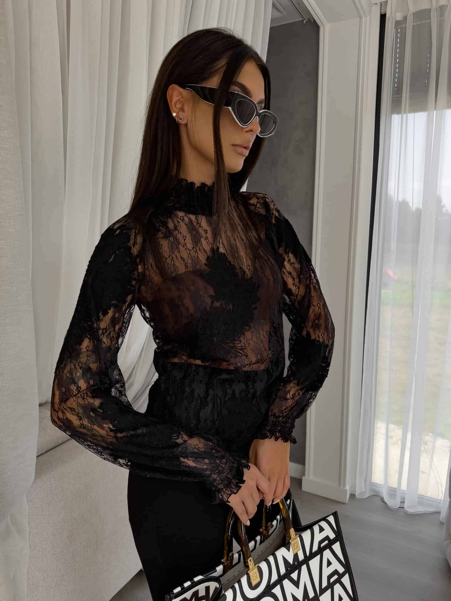 Bluzka wykonana została z delikatnej koronki, zdobionej finezyjnym, kwiatowym motywem. Długie, koronkowe rękawy zakończone są lekką falbanką, która dodaje całości romantycznego charakteru.