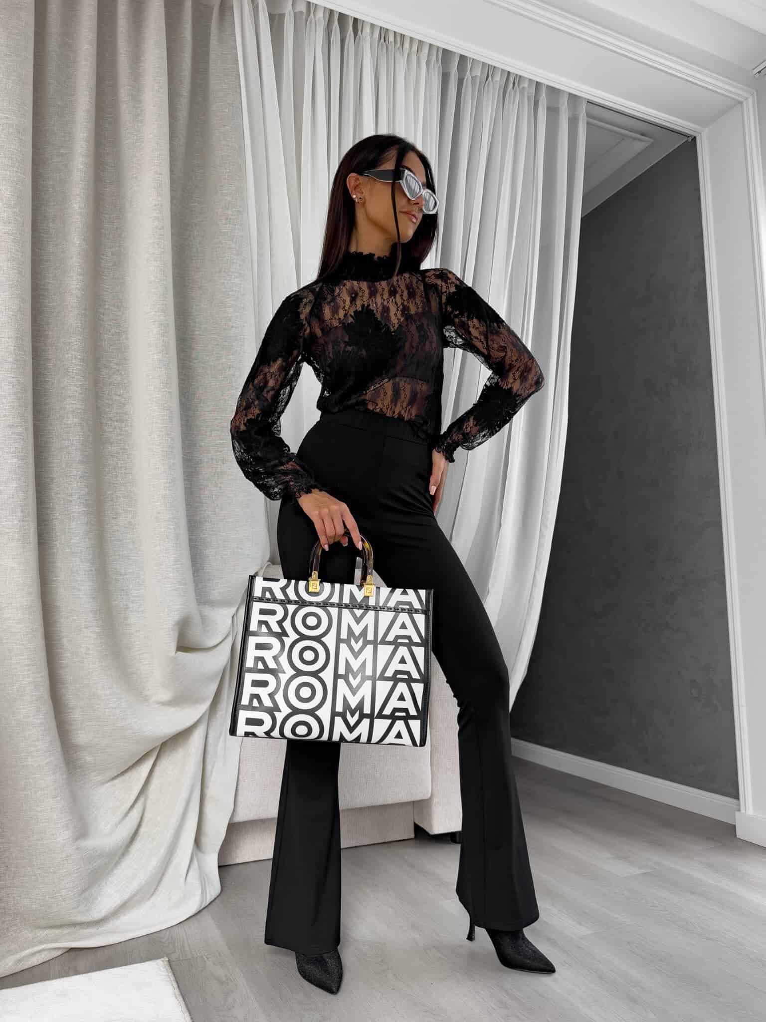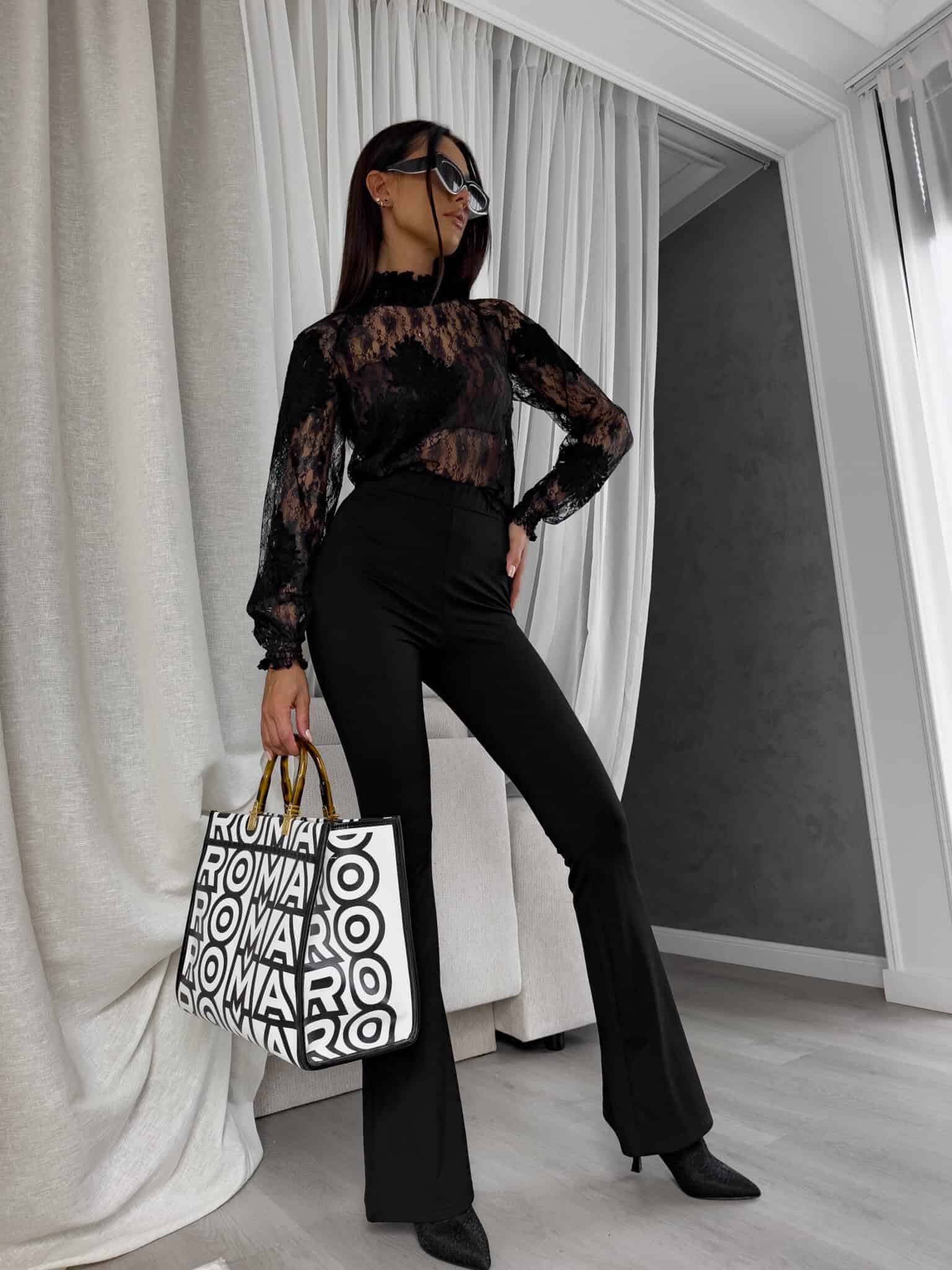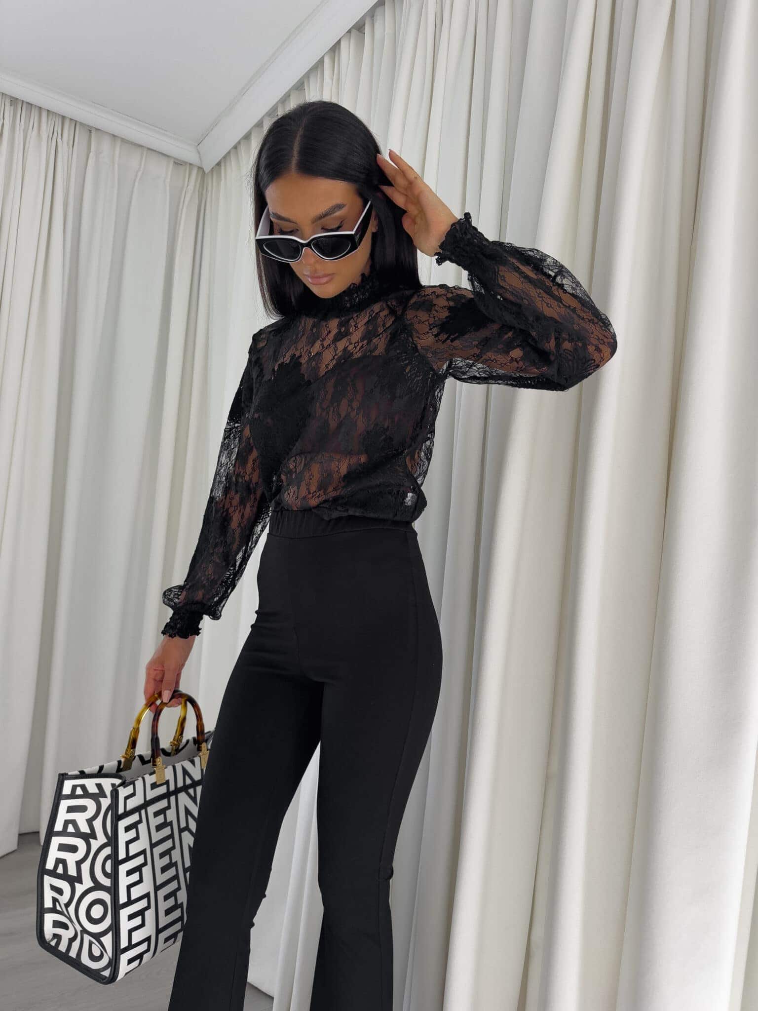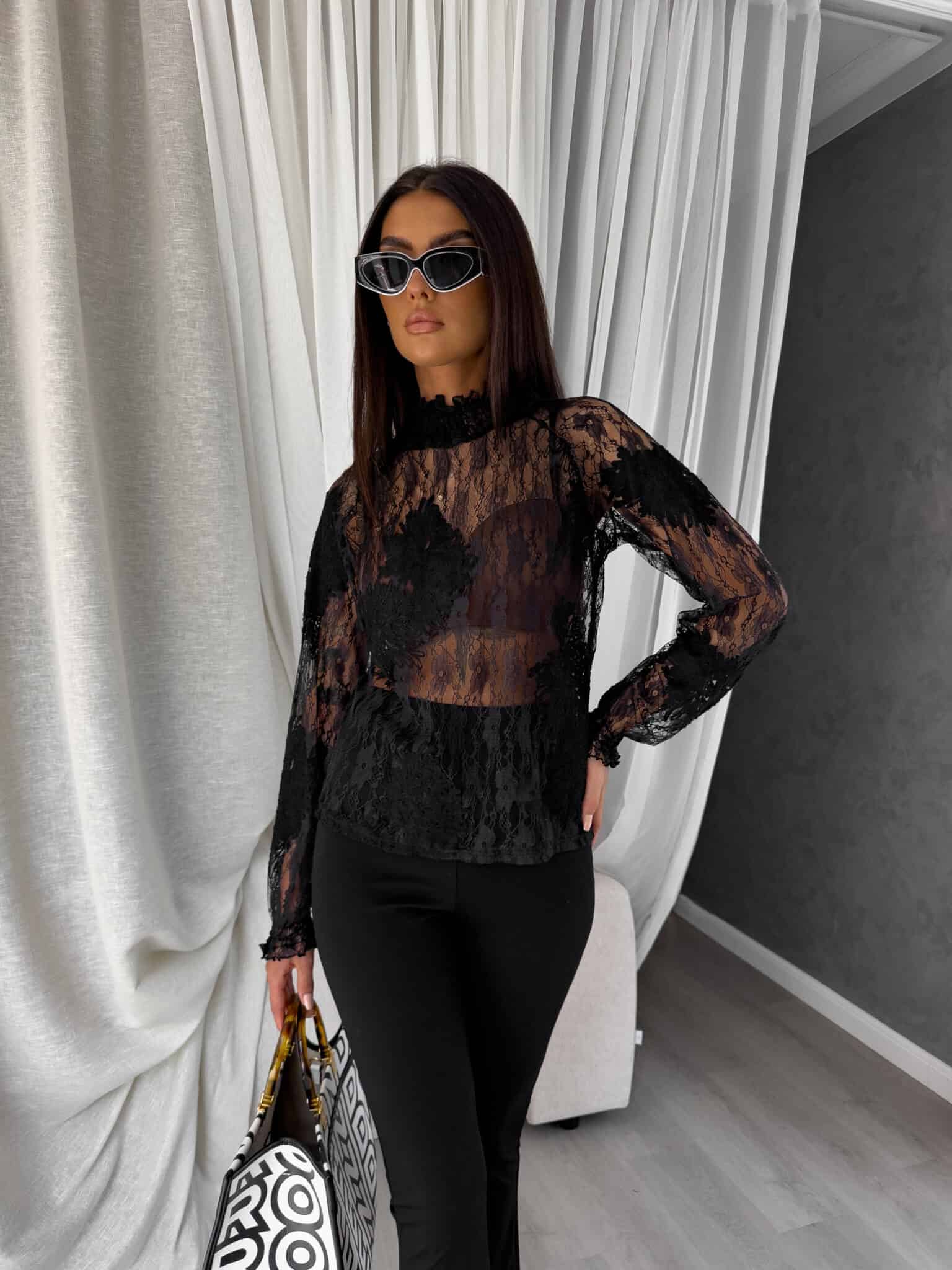 Bluzka wykonana została z delikatnej koronki, zdobionej finezyjnym, kwiatowym motywem. Długie, koronkowe rękawy zakończone są lekką falbanką, która dodaje całości romantycznego charakteru.