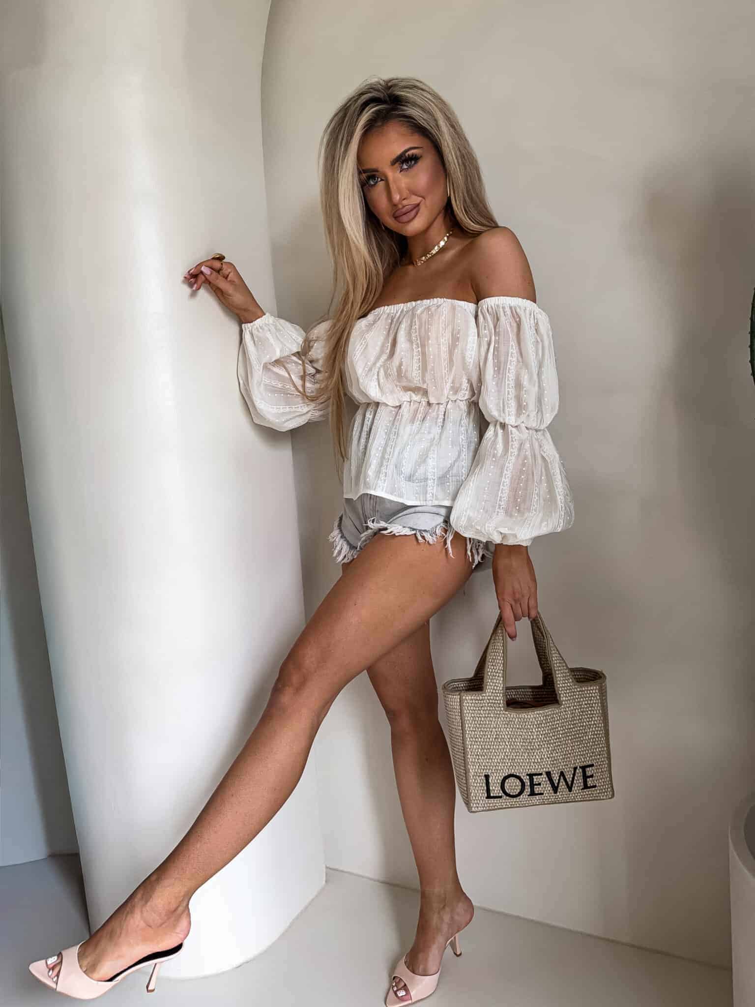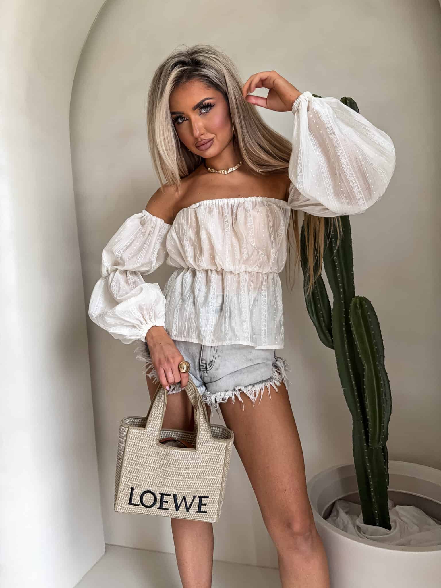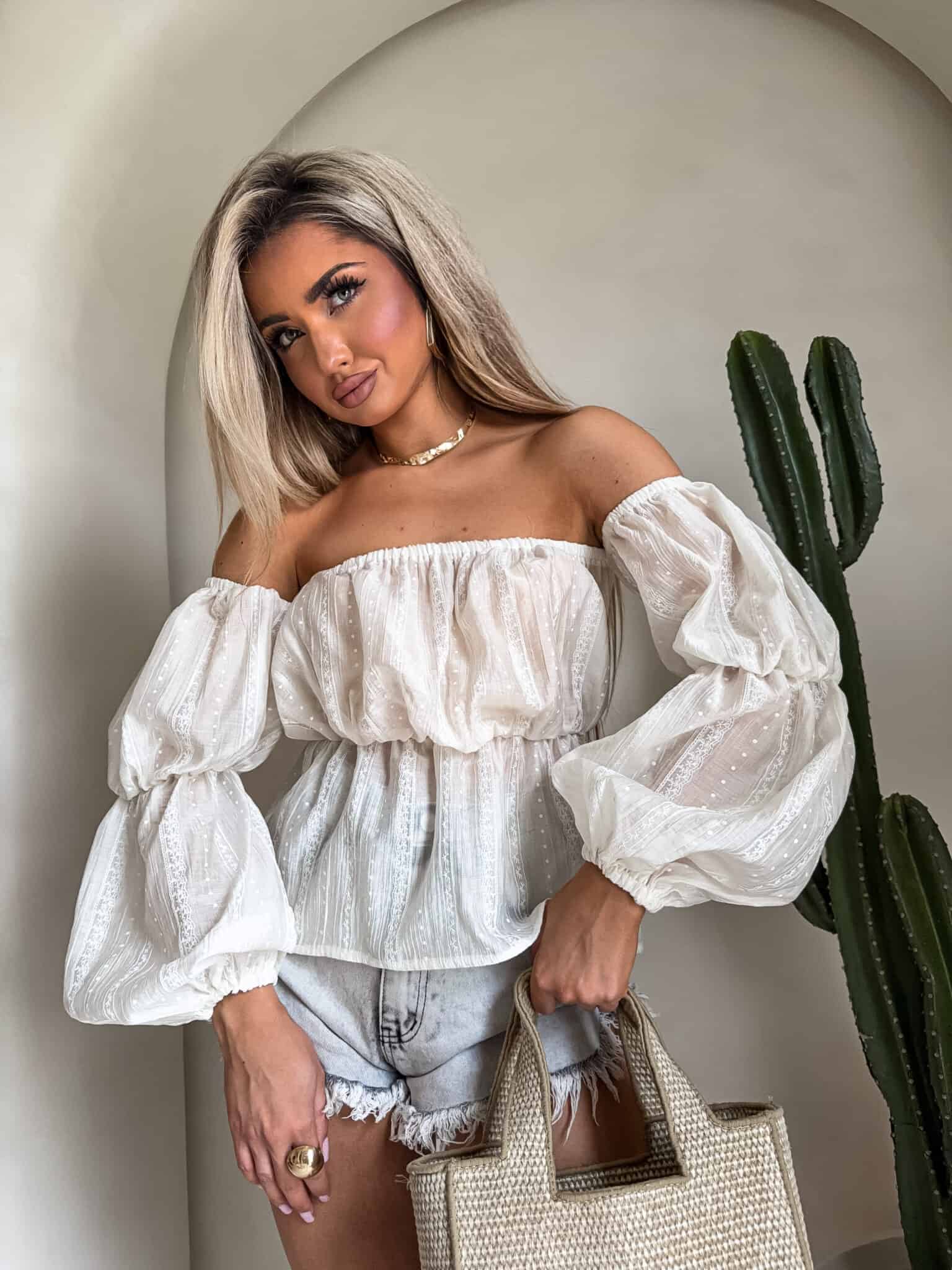 Bluzka typu hiszpanka – z odkrytymi ramionami i elastycznym wykończeniem przy dekolcie. Rękawy są długie, lekko bufiaste, zakończone gumeczką.