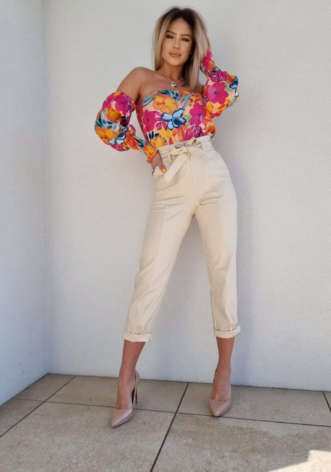 Bluzka typu hiszpanka – z odkrytymi ramionami i elastycznym wykończeniem przy dekolcie.  Rękawy są długie, lekko bufiaste, zakończone marszczonym, elastycznym mankietem, który tworzy delikatną falbankę i dodaje całości romantycznego uroku.