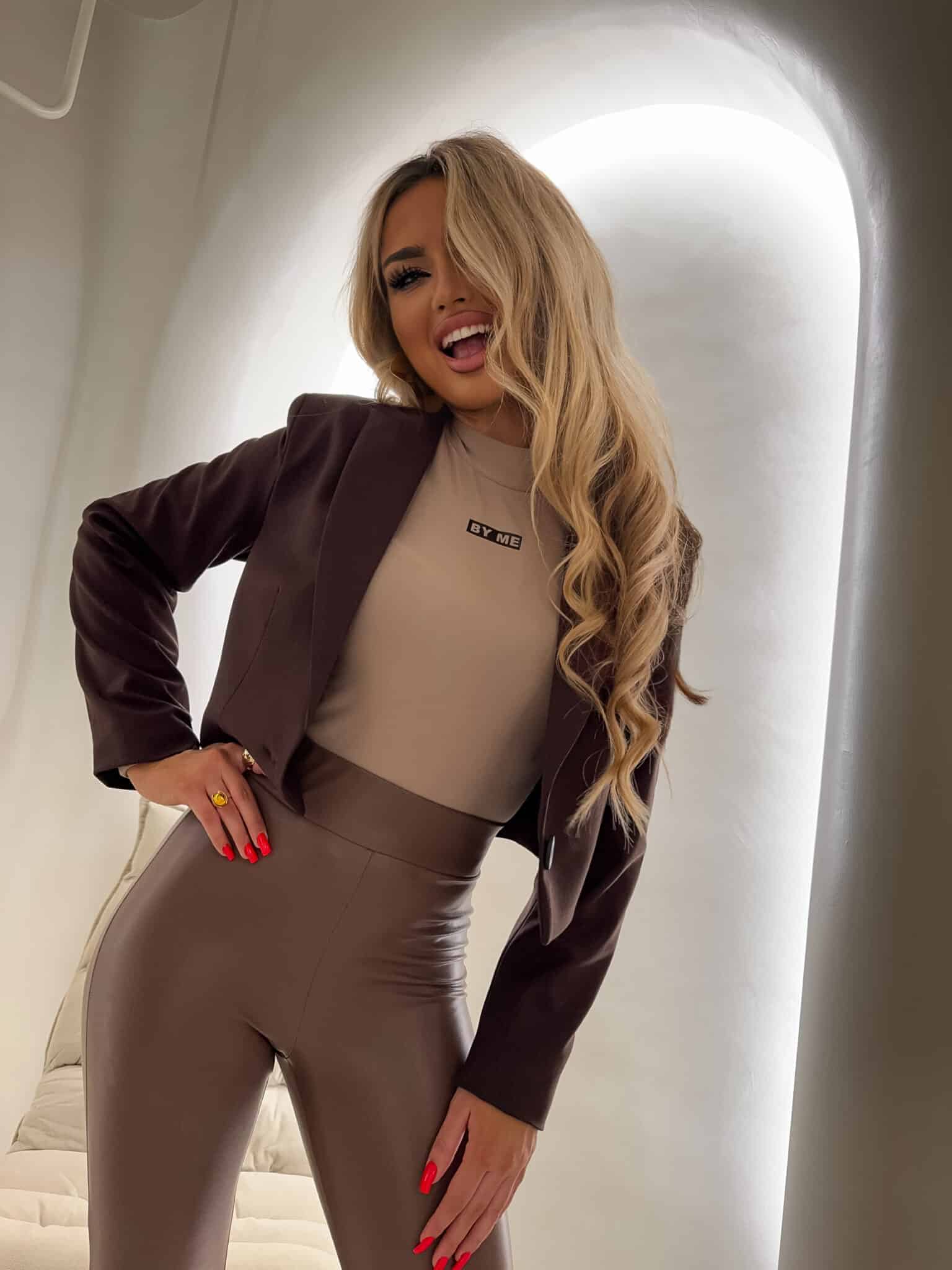 Bluzka dopasowana, wykonana z elastycznego, przyjemnego w dotyku materiału, który subtelnie podkreśla sylwetkę. Model posiada długie rękawy oraz wysoki, zabudowany dekolt ozdobiony delikatnym logowaniem. Konstrukcja została wzbogacona o poduszki na ramionach, dzięki którym bluzka zyskuje wyrazisty, geometryczny charakter i modowy, nowoczesny wygląd.