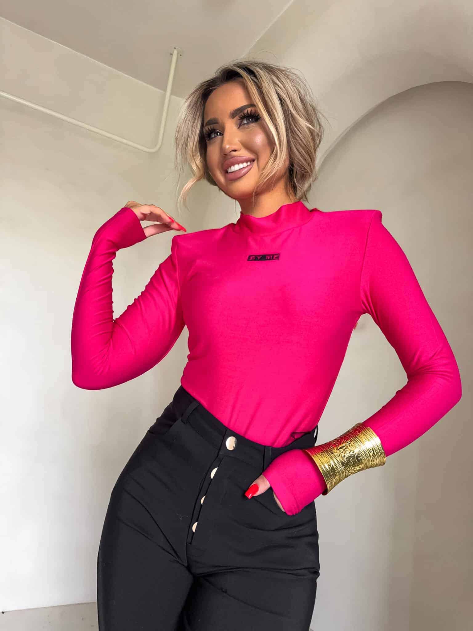 Bluzka dopasowana, wykonana z elastycznego, przyjemnego w dotyku materiału, który subtelnie podkreśla sylwetkę. Model posiada długie rękawy oraz wysoki, zabudowany dekolt ozdobiony delikatnym logowaniem. Konstrukcja została wzbogacona o poduszki na ramionach, dzięki którym bluzka zyskuje wyrazisty, geometryczny charakter i modowy, nowoczesny wygląd.