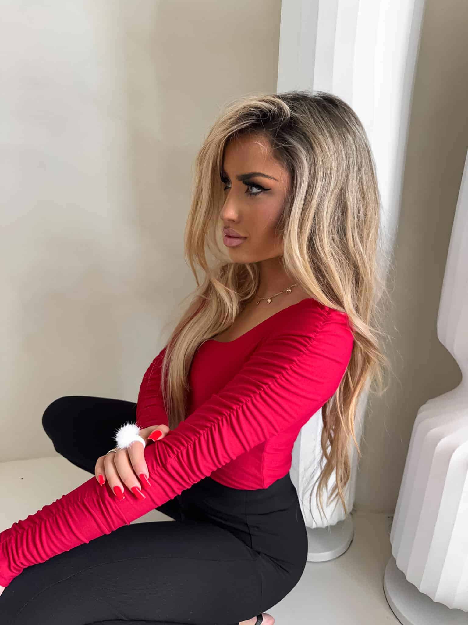 Bluzka Modena wkładana przez głowę. Przód i tył bluzki z podwójnego materiału, rękawy z pojedynczej warstwy materiału. Rękawy pięknie umarszczone. Dekolt w delikatne karo.