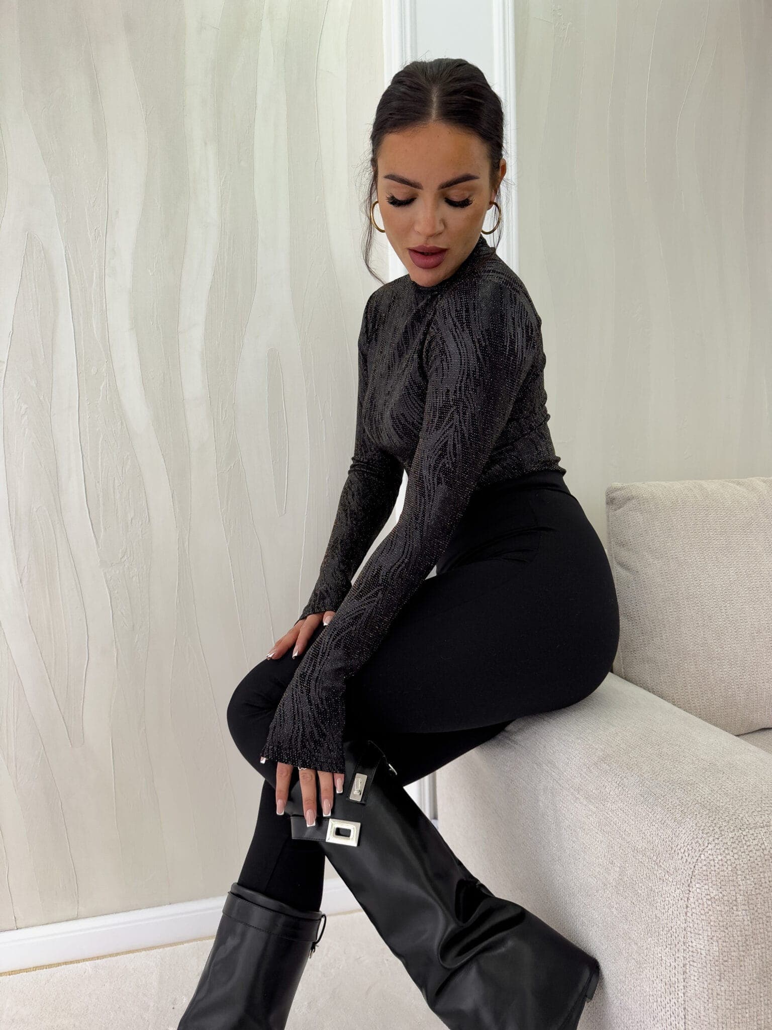 Bluzka Sabrina o dopasowanym kroju sprawdzi się jako baza do wielu różnorodnych stylizacji. Charakteryzuje się rękawem typu long sleeve. Delikatna stójka.