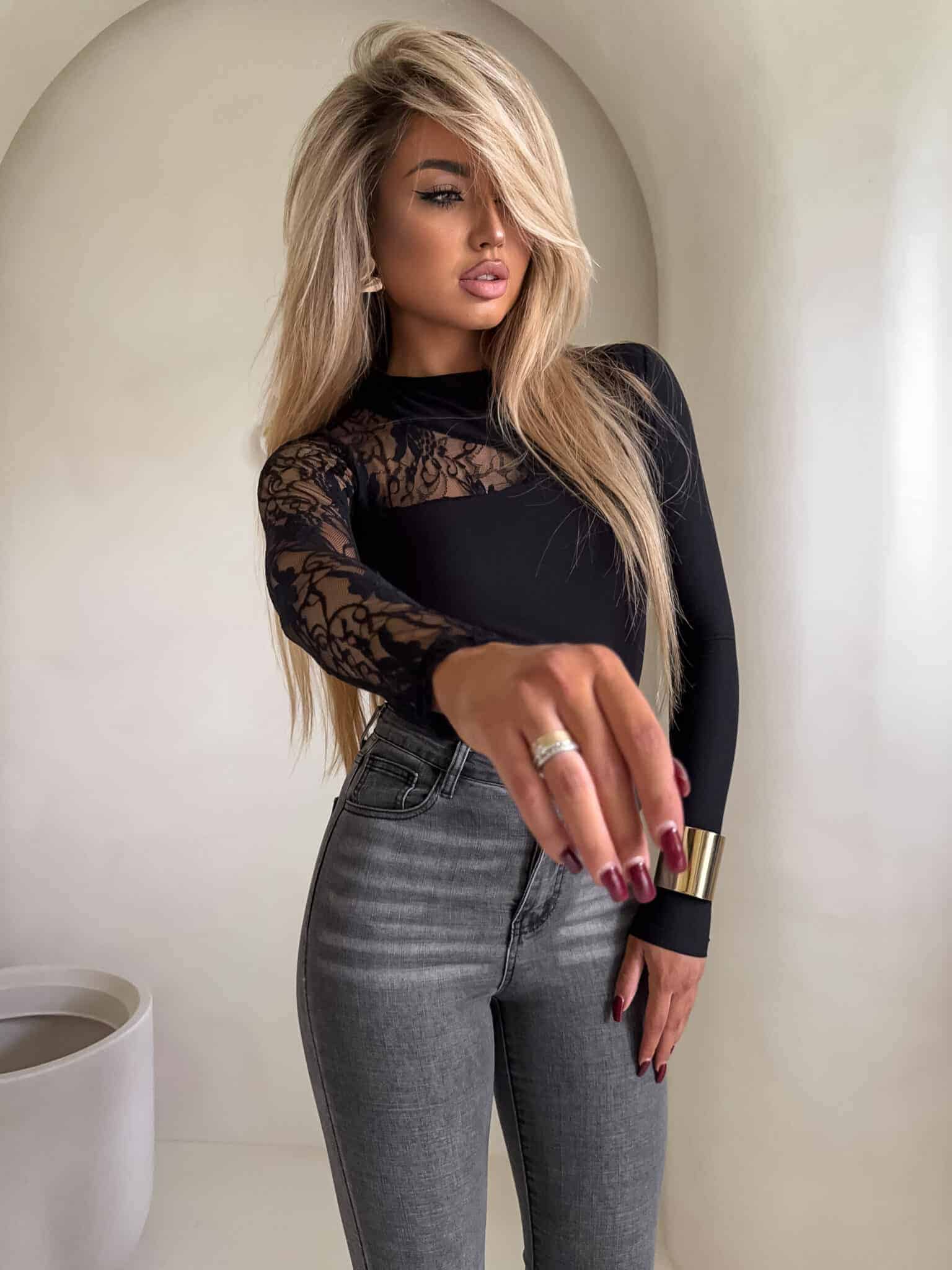 Nowoczesnego i zmysłowego charakteru dodaje jej asymetryczna wstawka z transparentnej siateczki, umieszczona subtelnie na ramieniu i przy dekolcie.