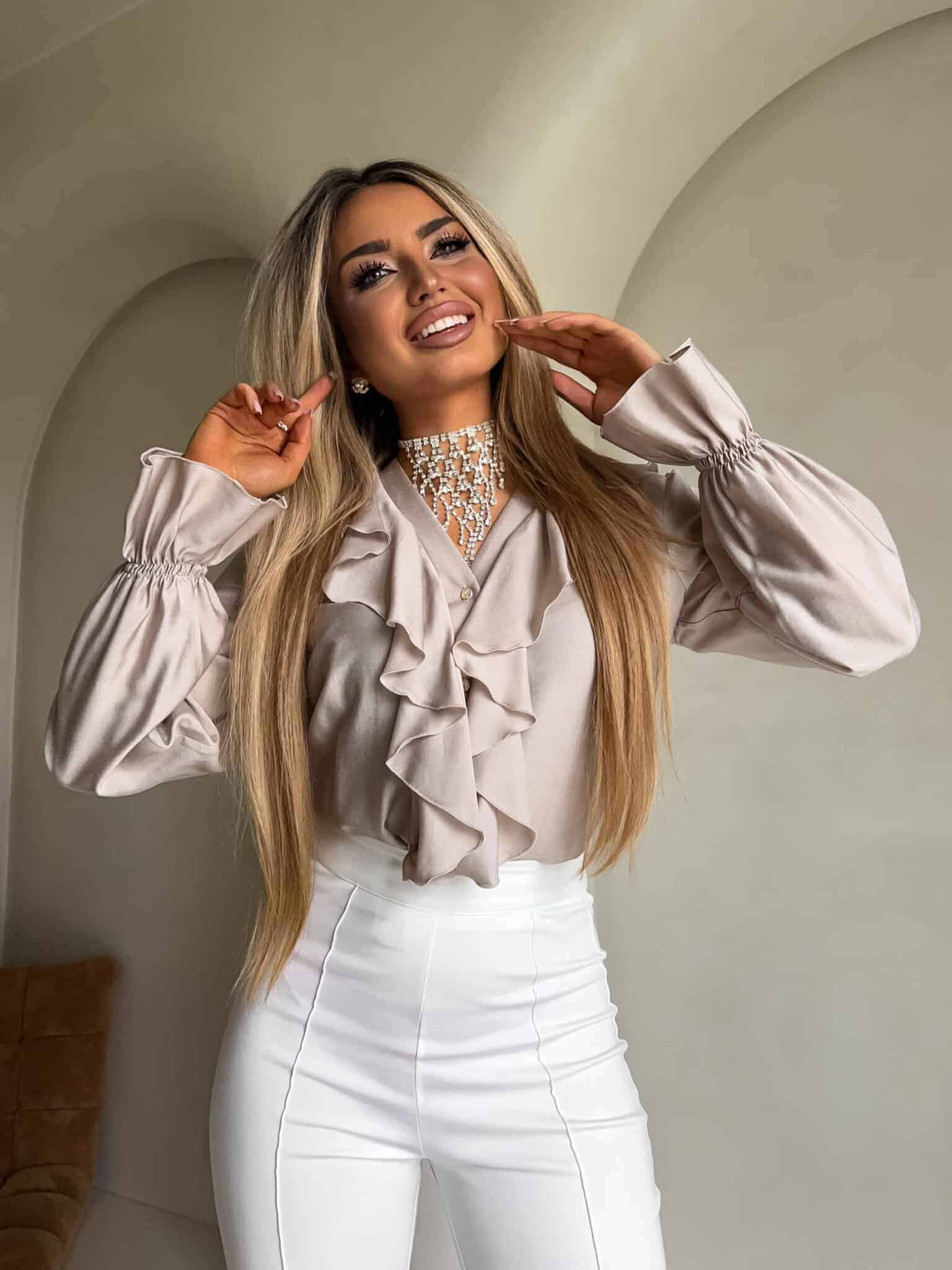 Elegancka i kobieca bluzka wykonana z gładkiego, satynowego materiału. Model wyróżnia się ozdobnymi falbanami biegnącymi przez środek oraz delikatnie okalającymi dekolt. Długie rękawy zakończone są szerokimi, elastycznymi mankietami, które tworzą efektowne, lekkie bufki. Fason jest lekko dopasowany, a jednocześnie swobodny, dzięki czemu bluzka doskonale układa się na sylwetce i zapewnia komfort noszenia.
