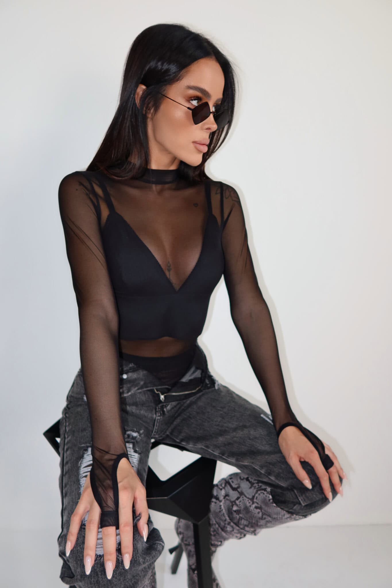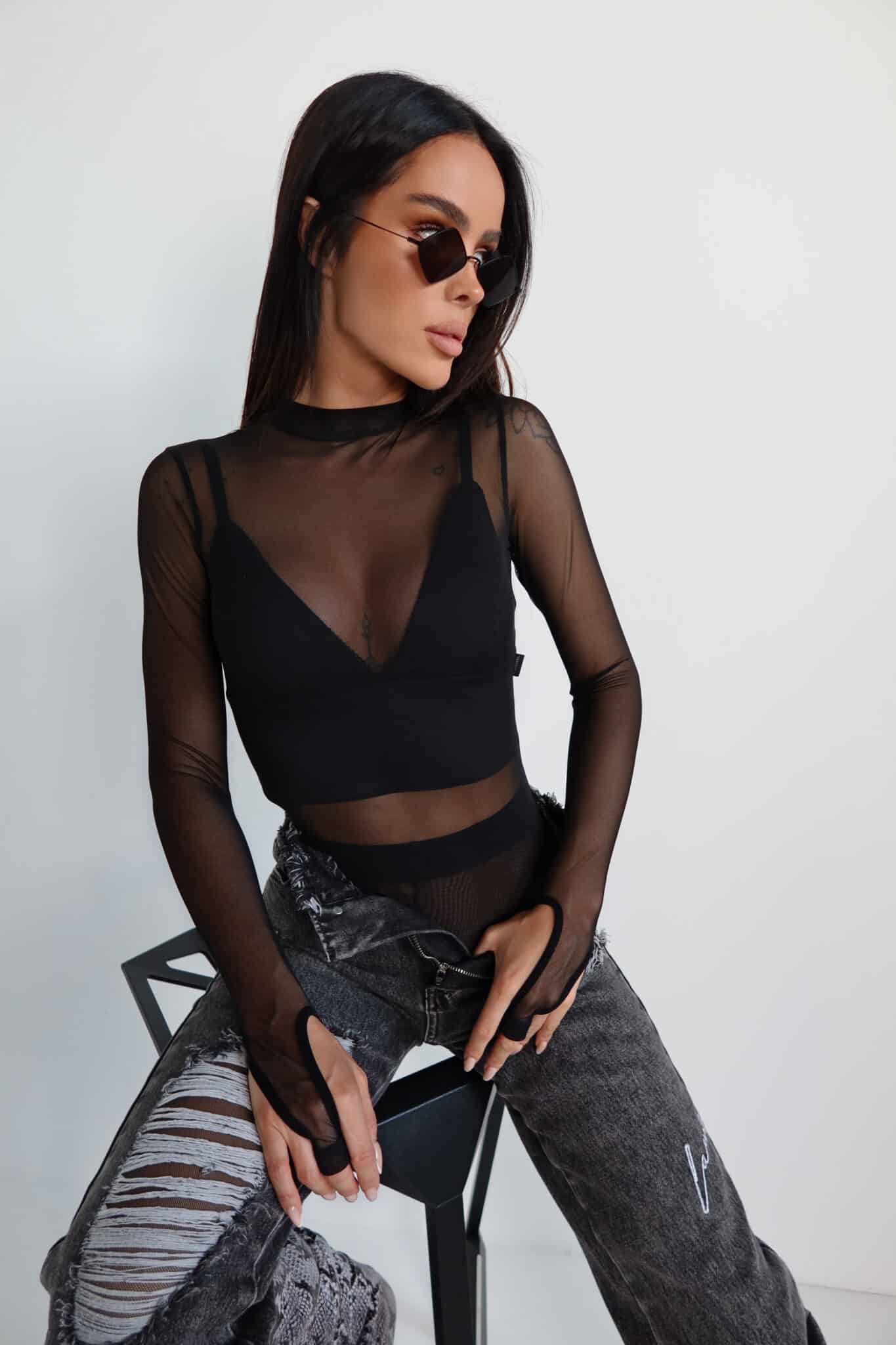 Dopasowane body z elastycznej, transparentnej siateczki, zaprojektowane z myślą o odważnych, nowoczesnych sylwetkach. Długi rękaw wykończony otworem na środkowy palec tworzy efekt przedłużonej linii dłoni i dodaje stylizacji edgy klimatu. Półgolf przy szyi i delikatne przeszycia podkreślają minimalistyczny, ale wyrazisty krój. Idealne do noszenia solo lub warstwowo – z gorsetem, pod kamizelkę lub marynarkę.Skład: 95% poliester 5% elastan