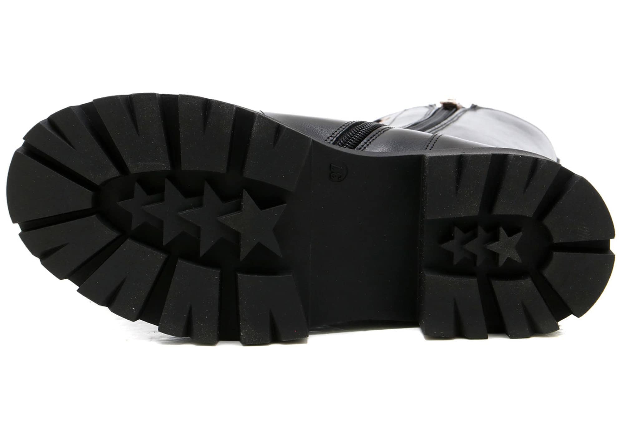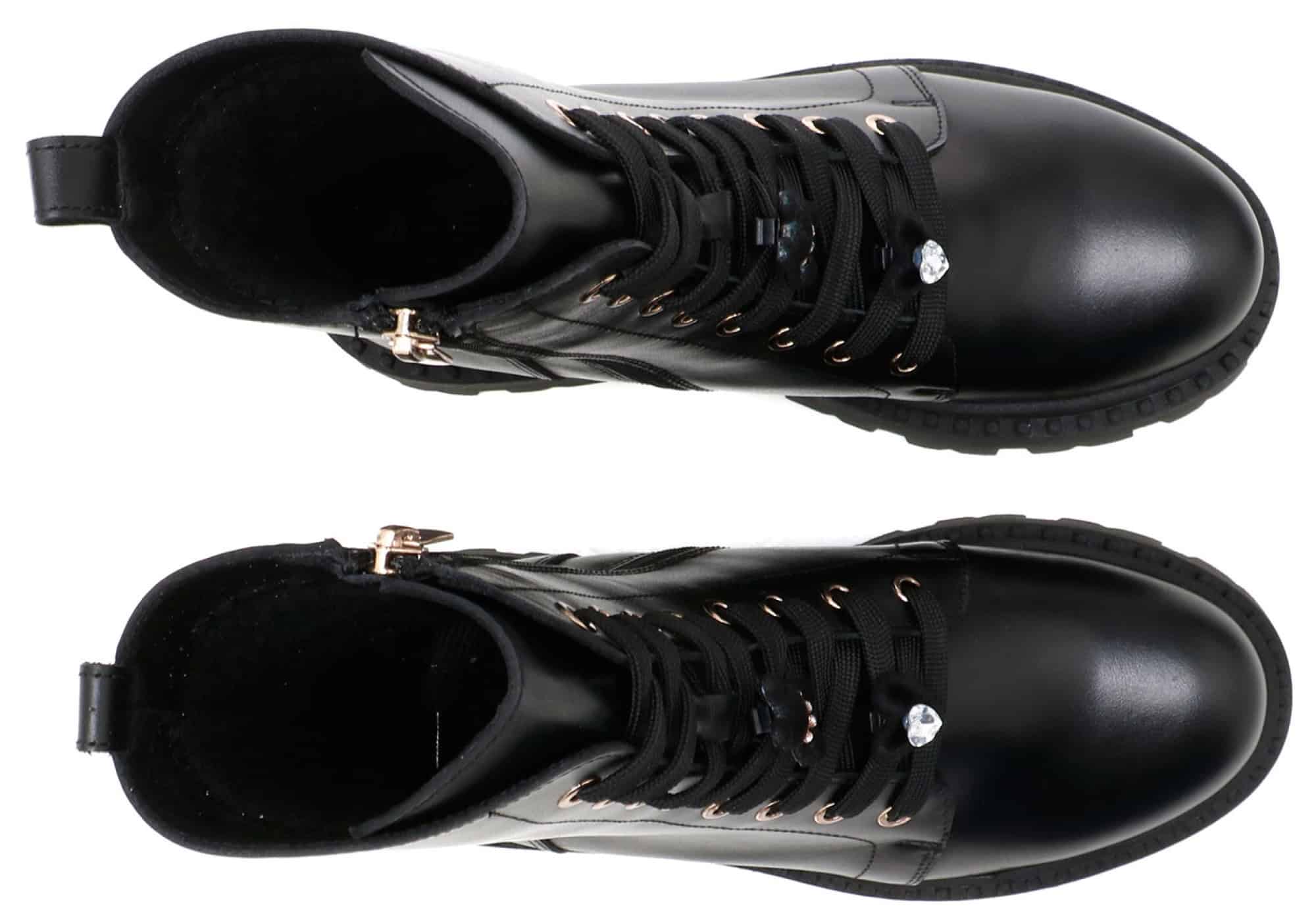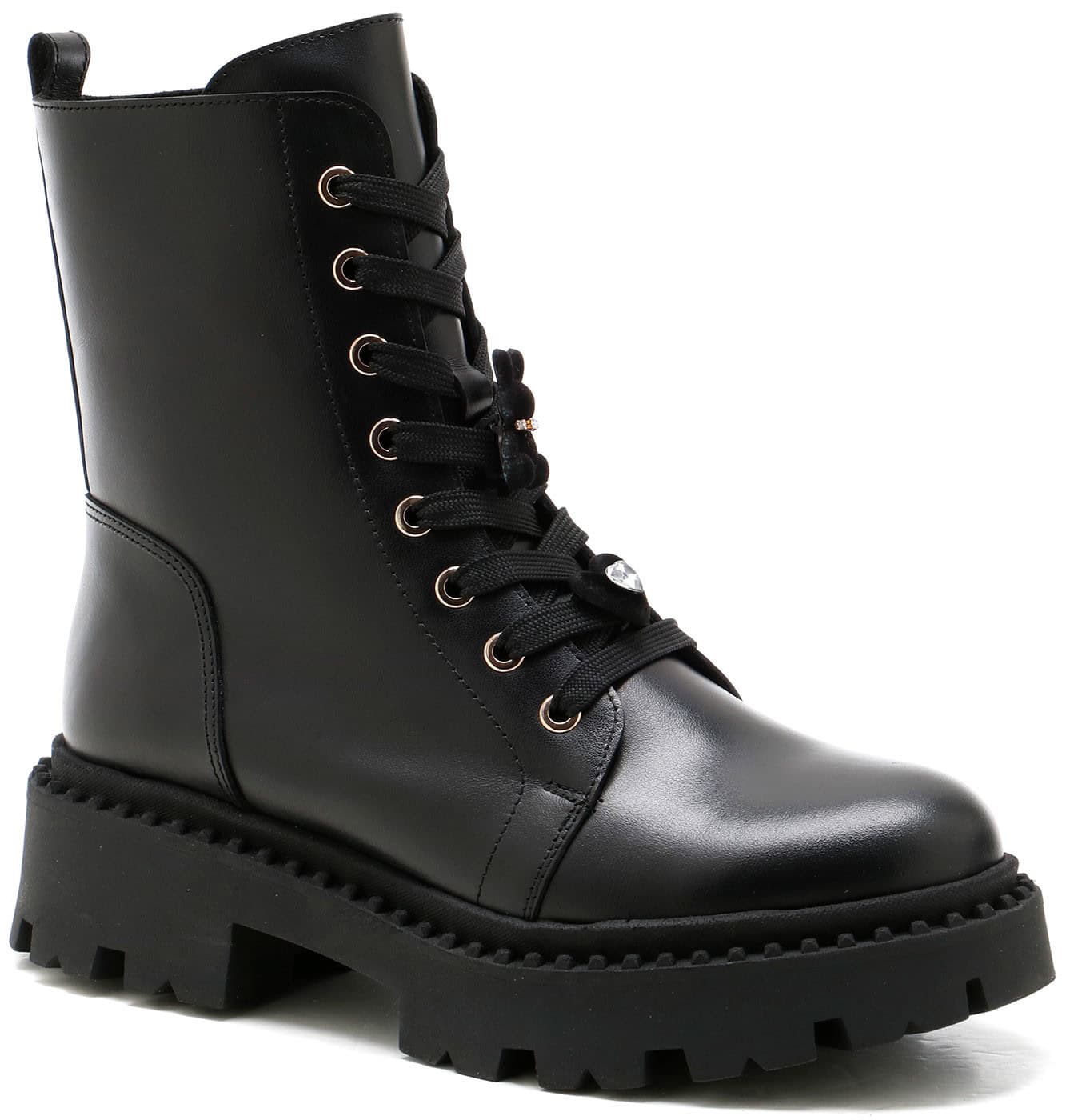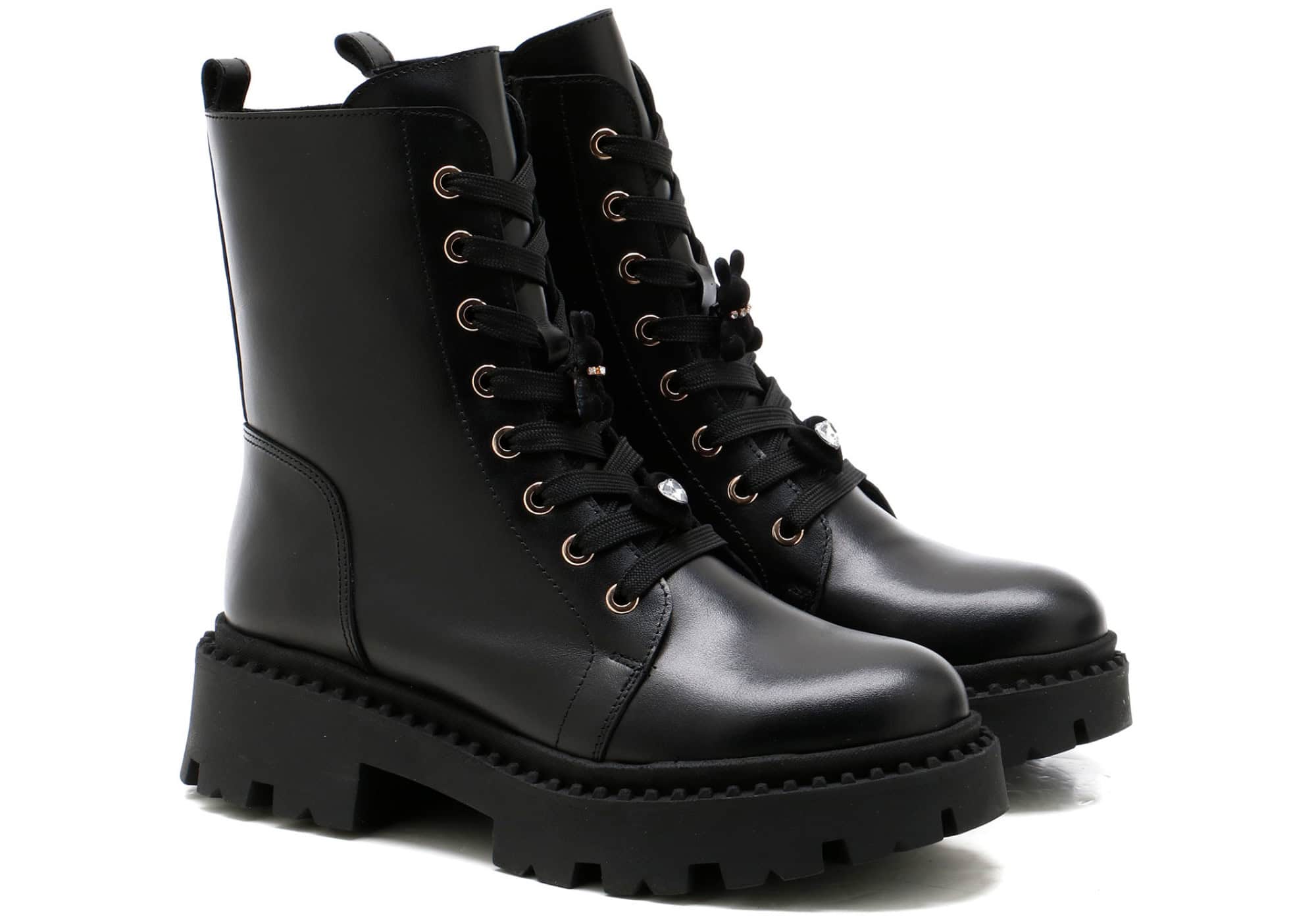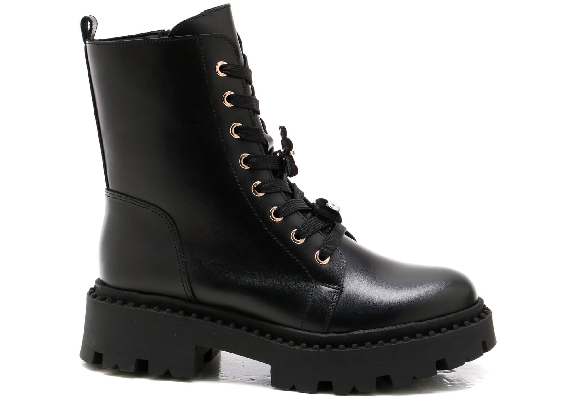 Skórzane botki Karino na wzmocnionej traperowej podeszwie, zapinane na zamek od wewnętrznej strony buta co ułatwia użytkowanie oraz wiązane sznurowadłami.