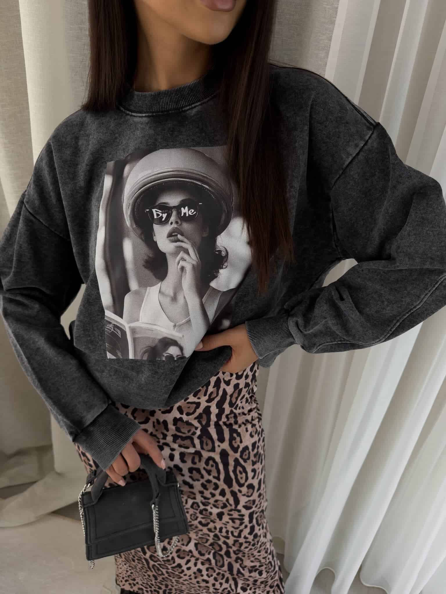 Stylowa bluza o swobodnym kroju, wykonana z miękkiej, dekatyzowanej bawełny, która nadaje jej unikalny, lekko sprany wygląd. Zakładana przez głowę, długie rękawy zapewniają komfort noszenia, a nadruk z przodu dodaje charakterystycznego akcentu. Idealna na co dzień – do jeansów, dresów czy szortów.