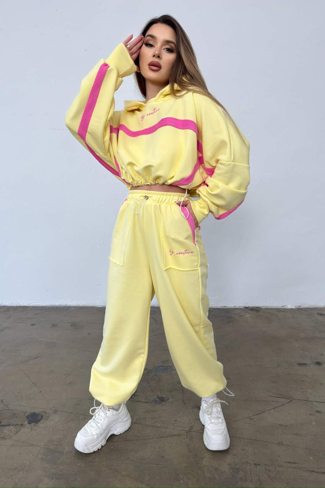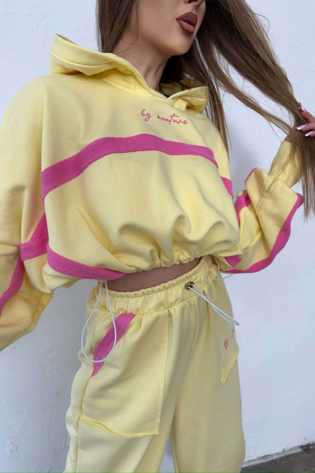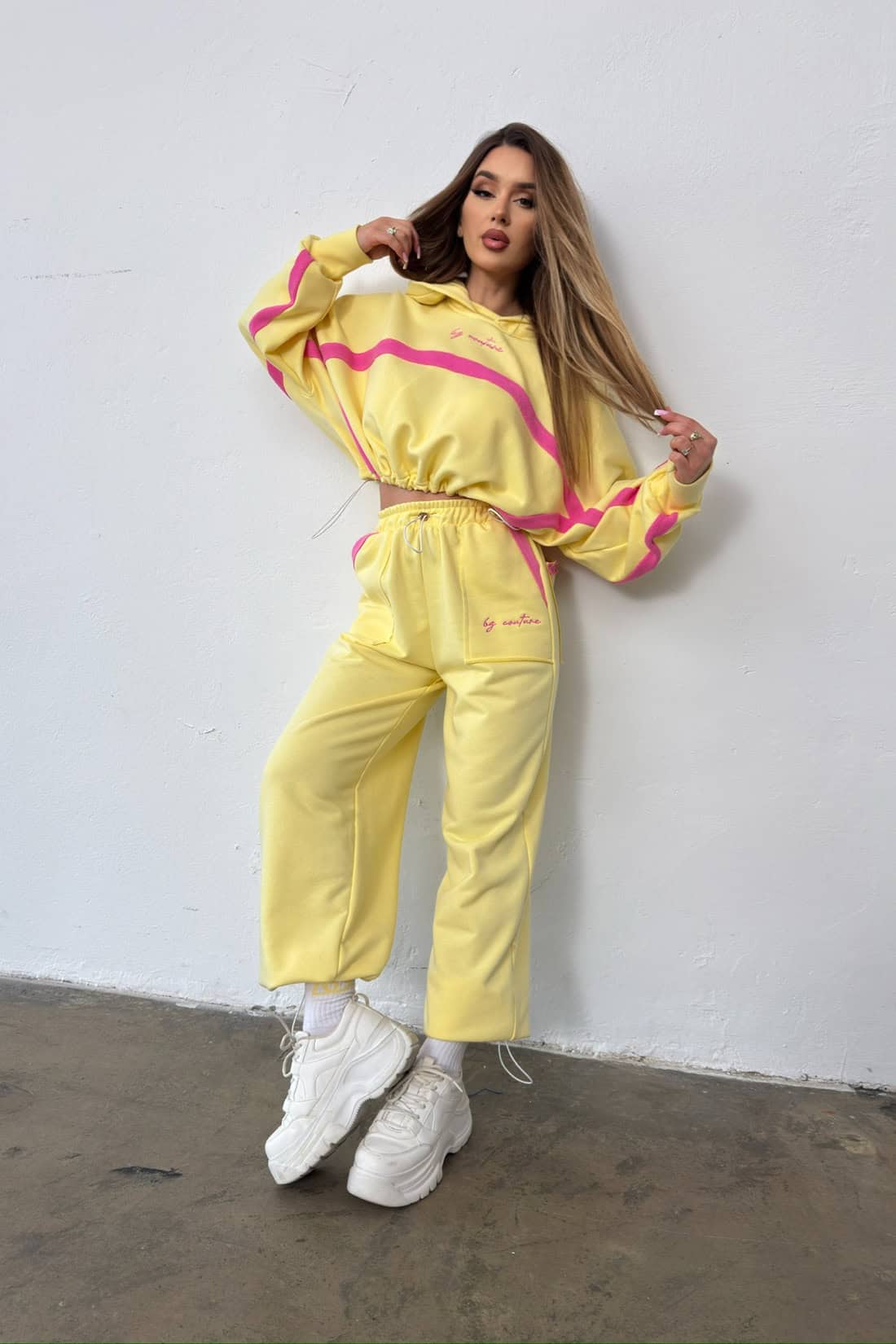 Opis produktu: Dres z bawełny nieocieplanej BG ACAPULCO. Bluza oraz spodnie zdobione haftowanym logo marki BG Brandenburg Couture w kontrastowym kolorze. Bluza posiada kaptur, mankiety wykończone ściągaczami. W dole bluzy gumosznurek z eleganckimi złotymi stoperami. Spodnie posiadają gumkę w pasie oraz gumosznurki w pasie oraz w dole nogawki. Oba elementy zestawu dodatkowo ozdobione kontrastowymi wstawkami.