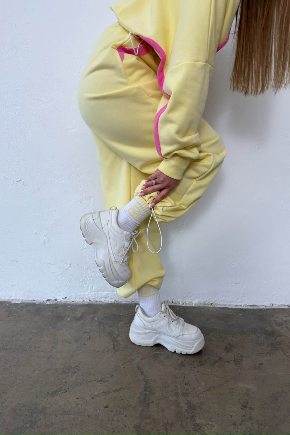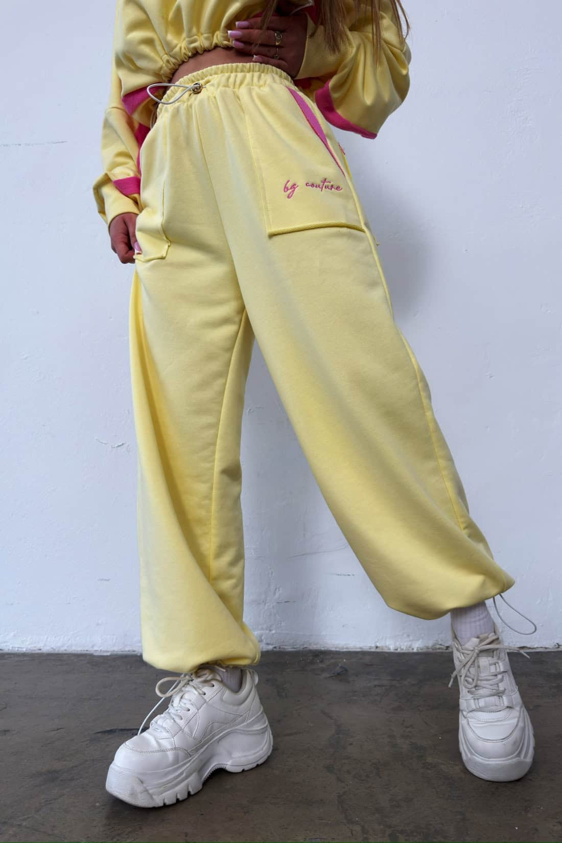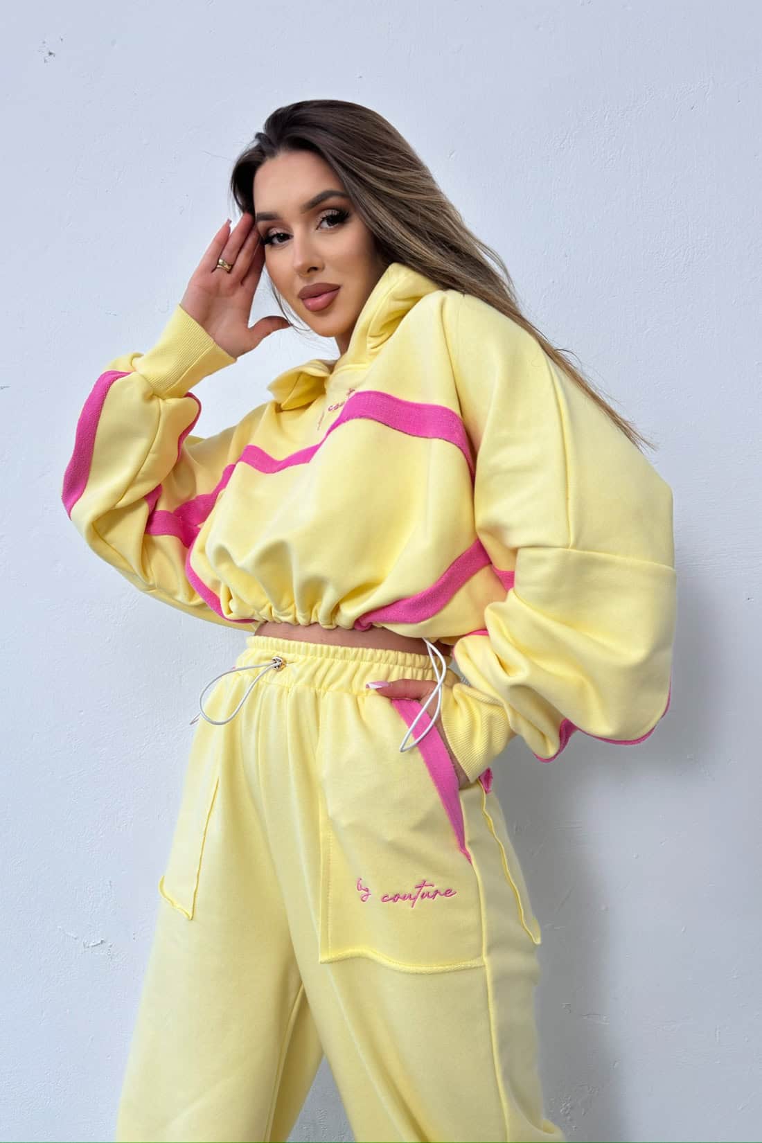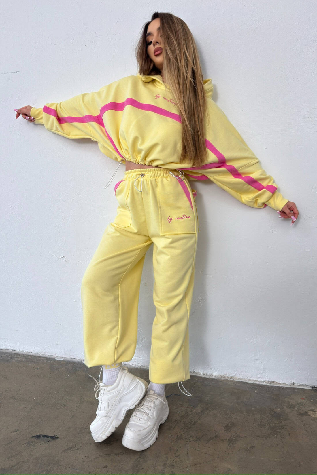 Opis produktu: Dres z bawełny nieocieplanej BG ACAPULCO. Bluza oraz spodnie zdobione haftowanym logo marki BG Brandenburg Couture w kontrastowym kolorze. Bluza posiada kaptur, mankiety wykończone ściągaczami. W dole bluzy gumosznurek z eleganckimi złotymi stoperami. Spodnie posiadają gumkę w pasie oraz gumosznurki w pasie oraz w dole nogawki. Oba elementy zestawu dodatkowo ozdobione kontrastowymi wstawkami.