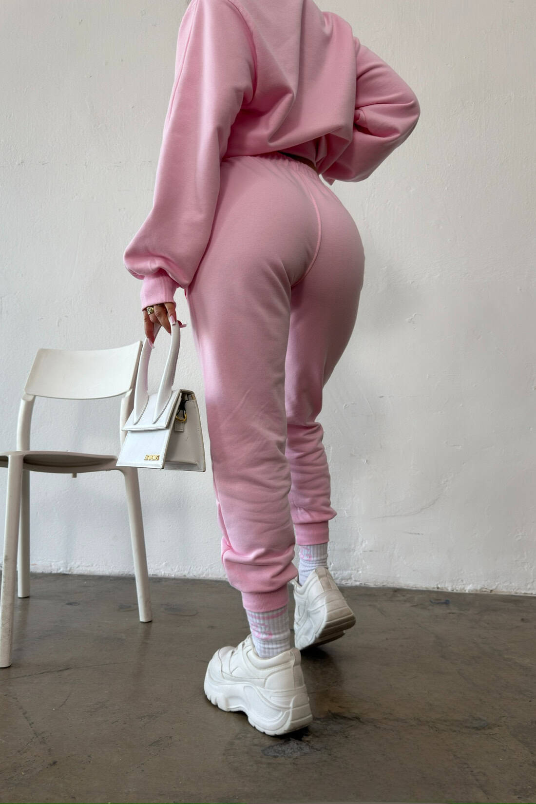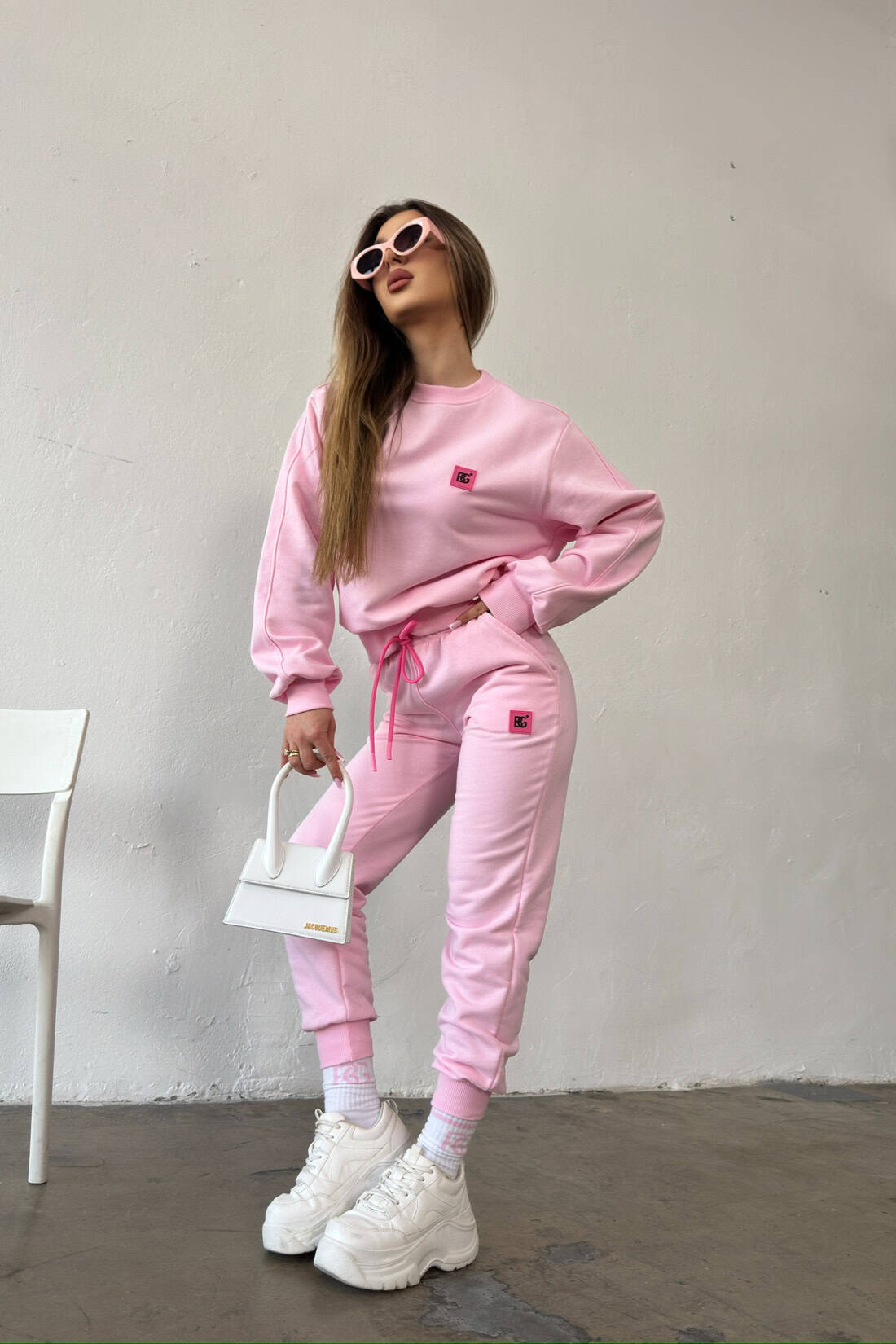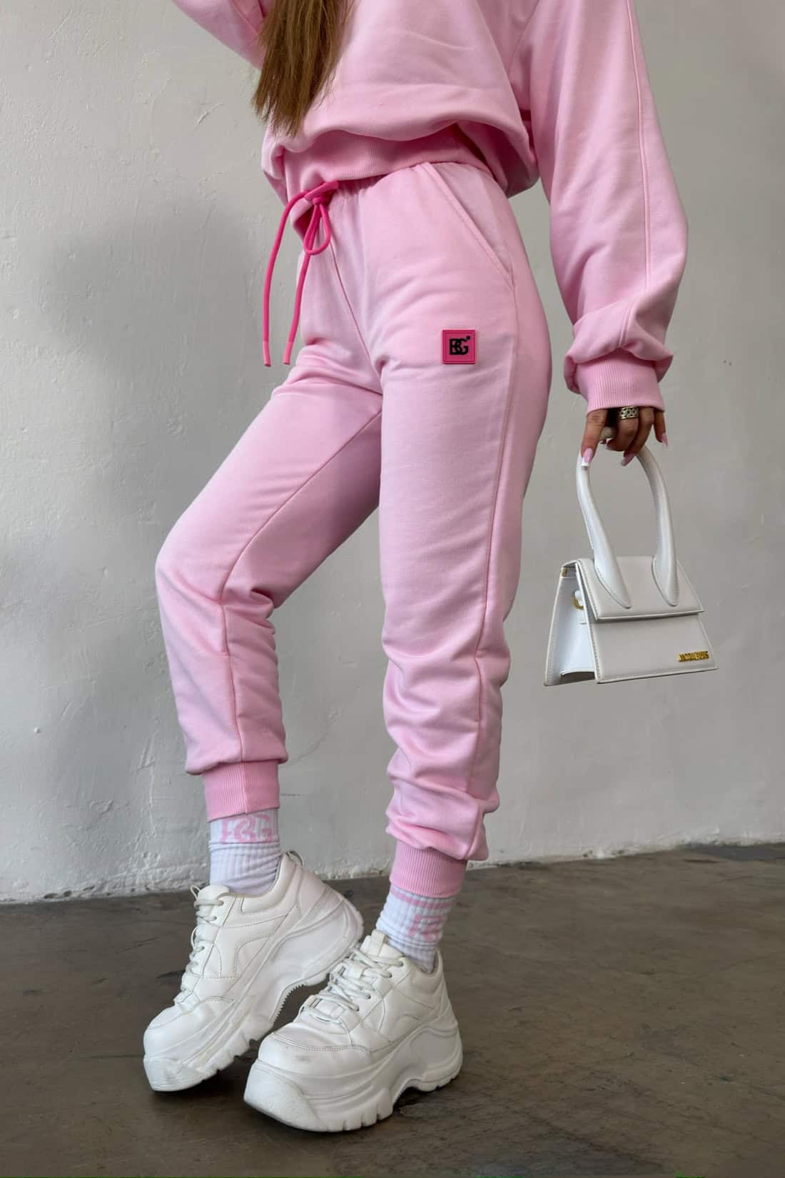 Opis produktu: Dres z bawełny nieocieplanej BG GELLY. Bluza oraz spodnie zdobione żelową naszywką logo marki BG Brandenburg Couture w kolorze różowym. Bluza i spodnie wykończone ściągaczem. Bluza bez kaptura. Spodnie posiadają gumkę w pasie oraz sznurek w kolorze różowym.