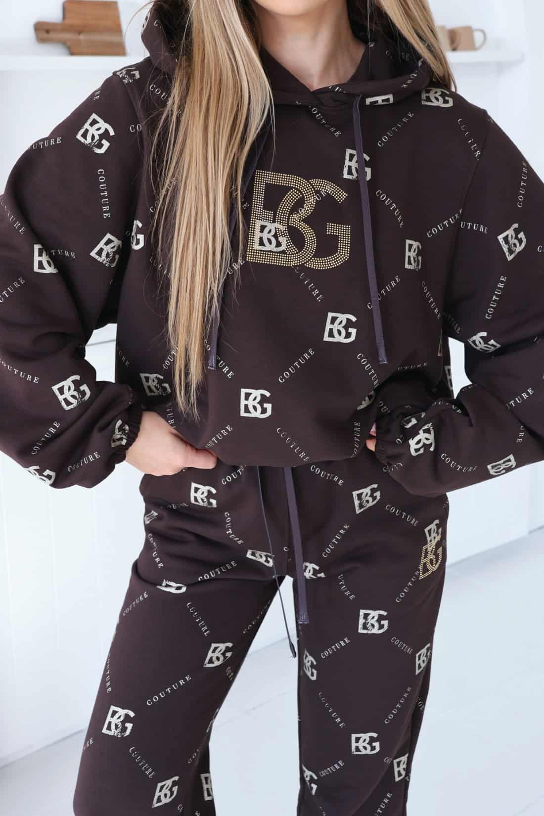 Opis produktu: Dres bawełniany BG HOLO. Cały dres drukowany złotym monogramem BG Couture. Bluza oraz spodnie dodatkowo zdobione wyklejanym świecącymi kamieniami logo BG w kolorze złotym. Bluza z kapturem, sznurek w tonacji materiału w kapturze. Spodnie posiadają gumkę w pasie oraz sznurek w tonacji materiału.