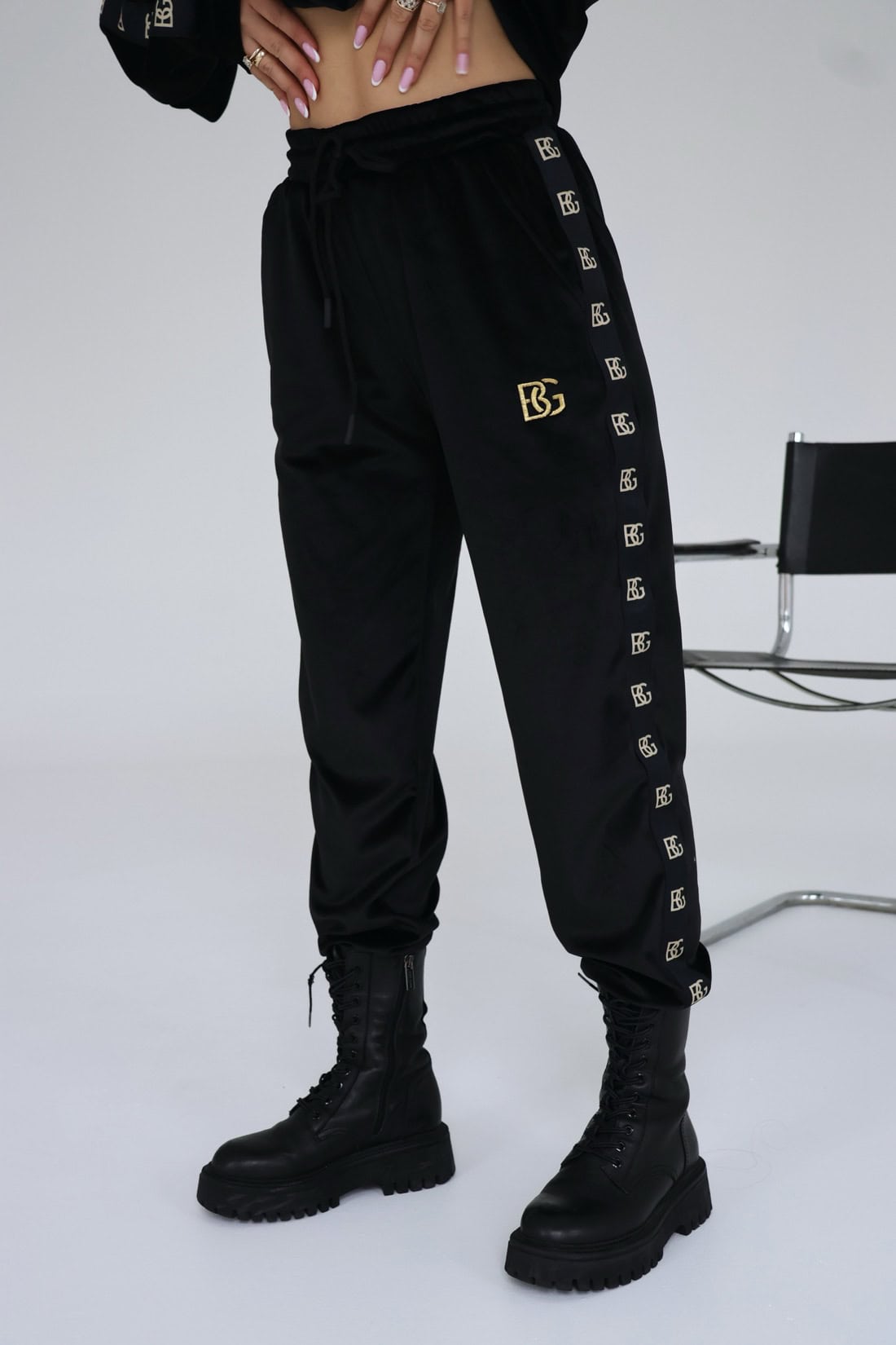 Opis produktu: Dres welurowy BG QUENNY. Bluza oraz spodnie zdobione haftowanym logo BG kolorze złotym. Rękawy bluzy oraz nogawki spodni ozdobione czarnymi lampasami ze złotym logo BG. Spodnie posiadają gumkę w pasie oraz sznurek.