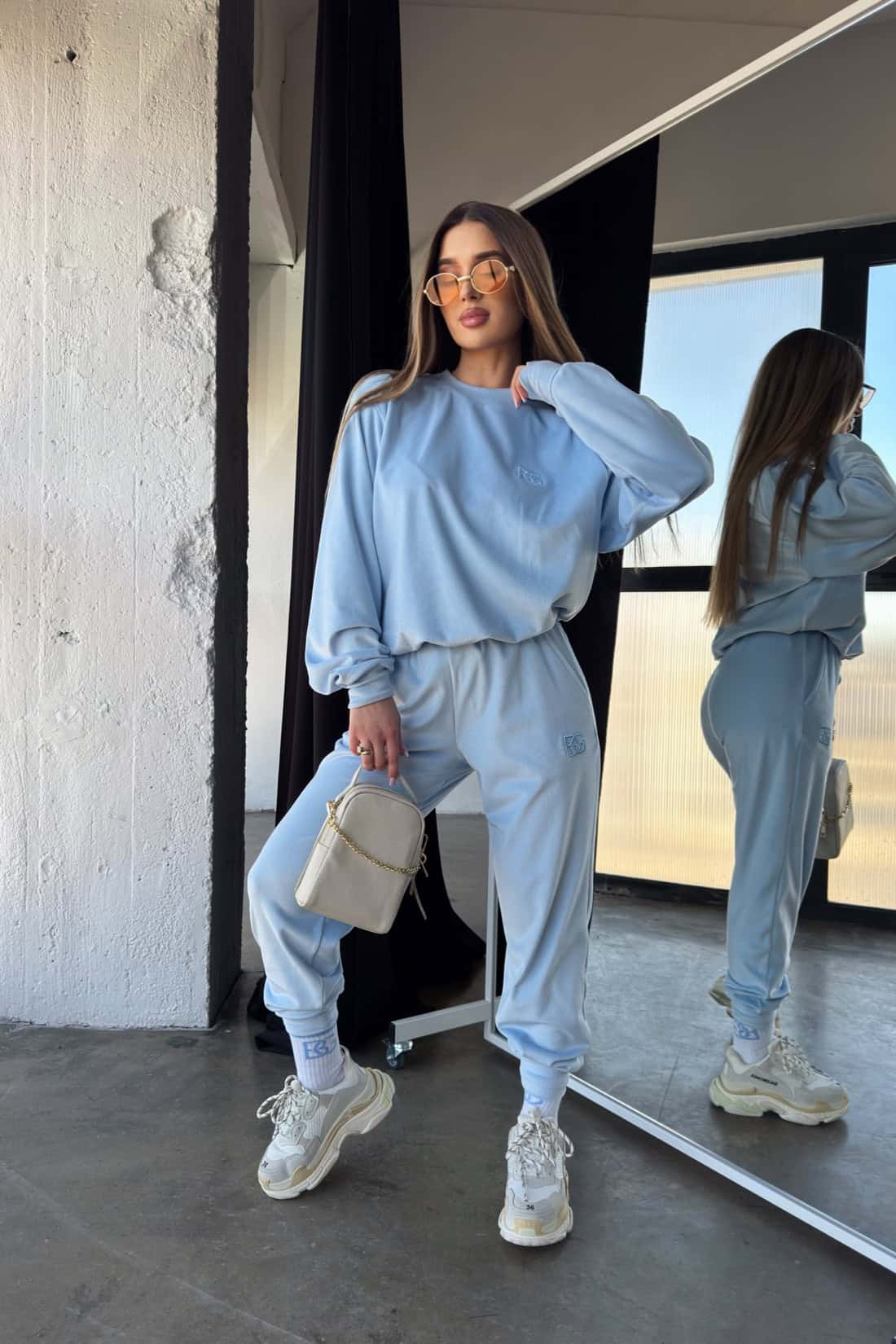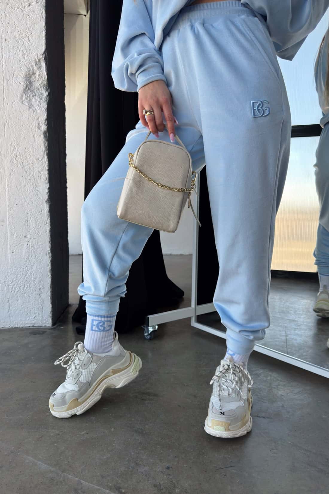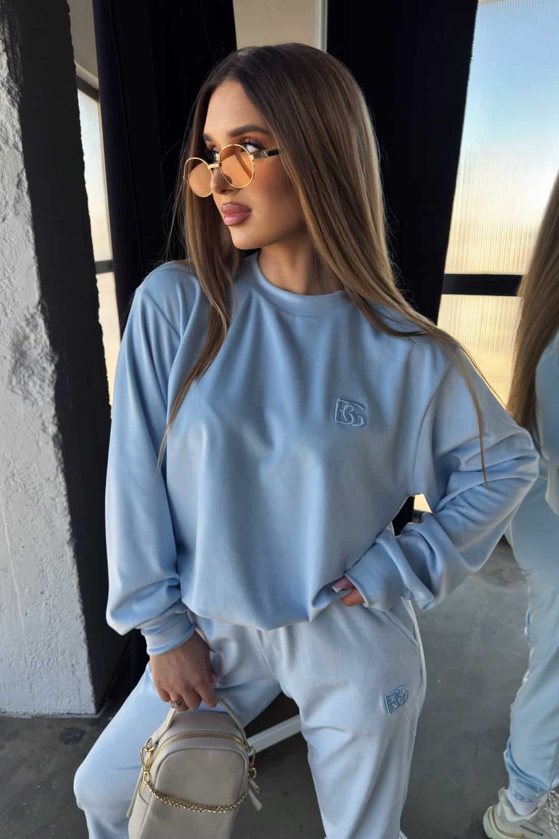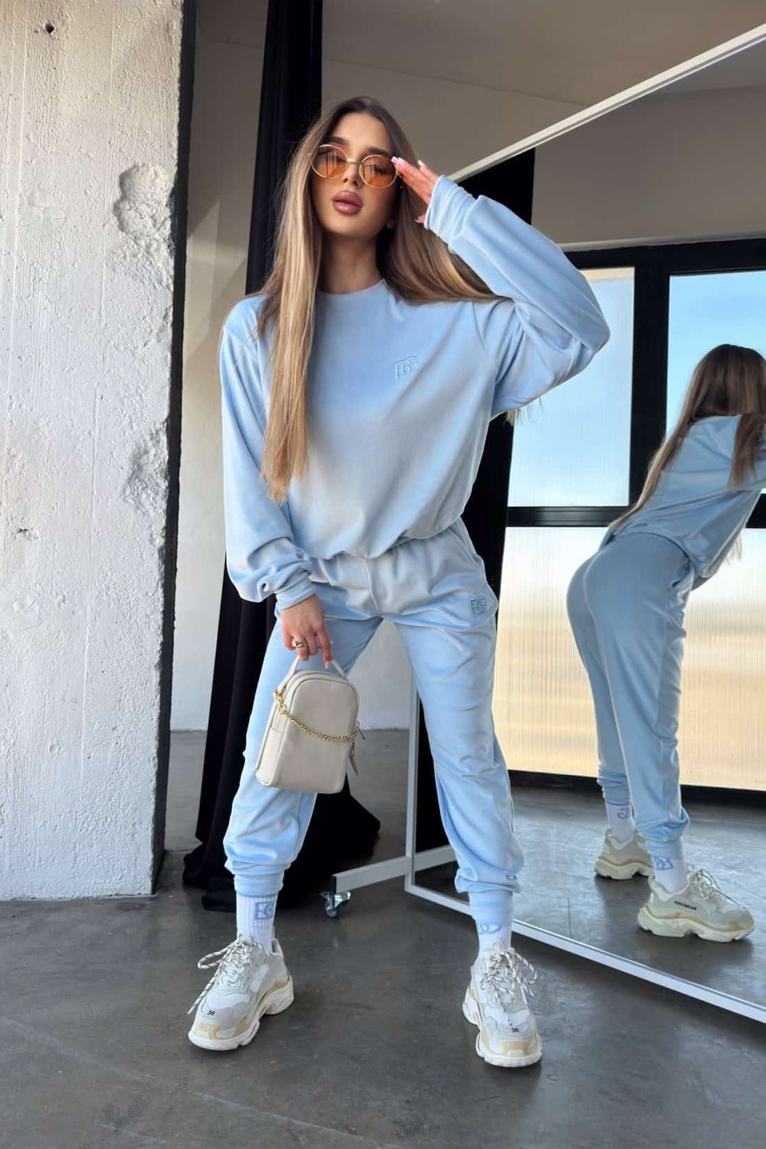 Opis produktu: Dres damski BG MIA z miękkiego weluru. Klasyczna bluza bez kaptura z logowaniem marki BG na piersi. Spodnie posiadają kieszenie, gumę oraz sznurek w pasie, wyhaftowane logo BG na nogawce.