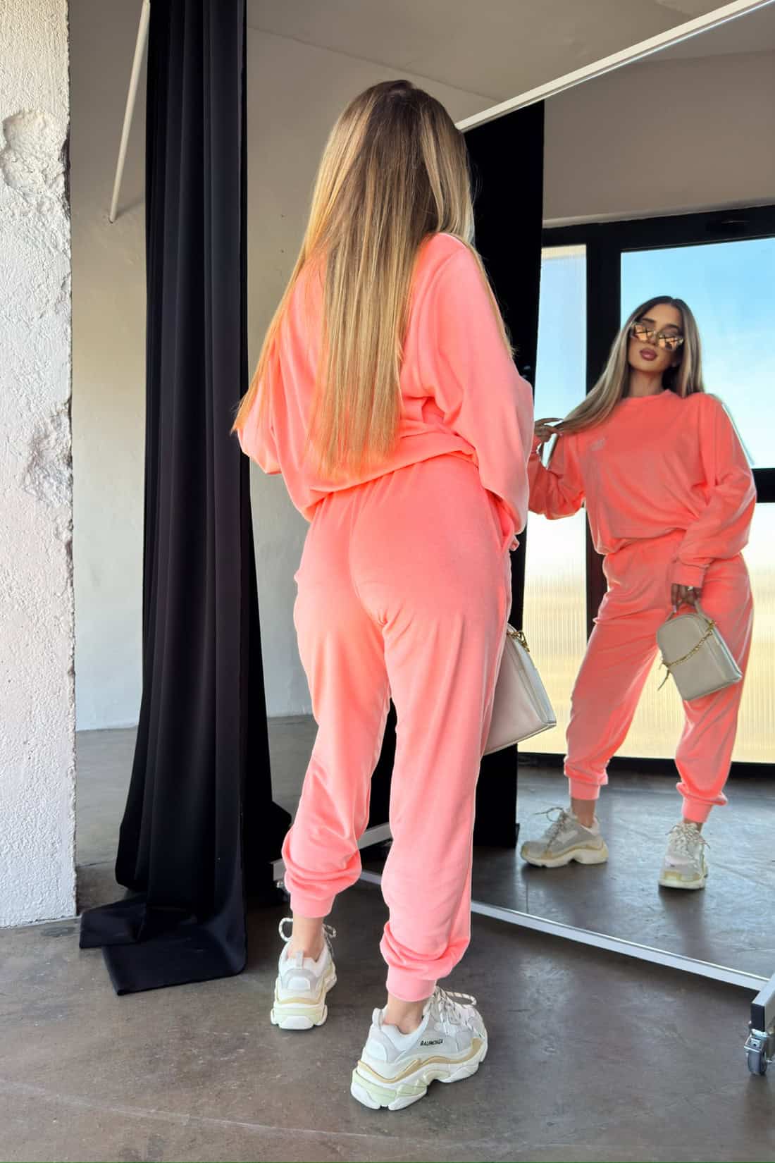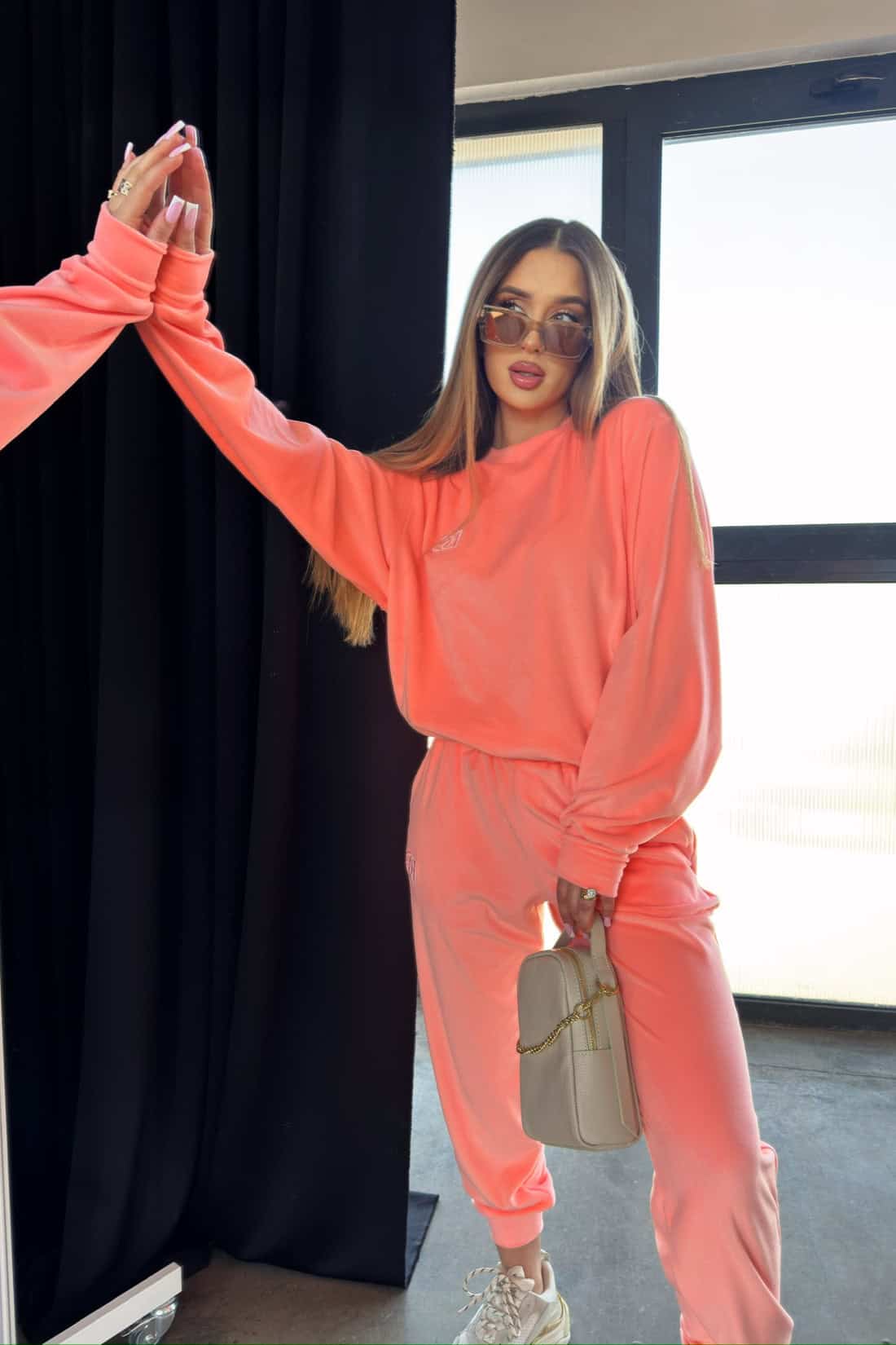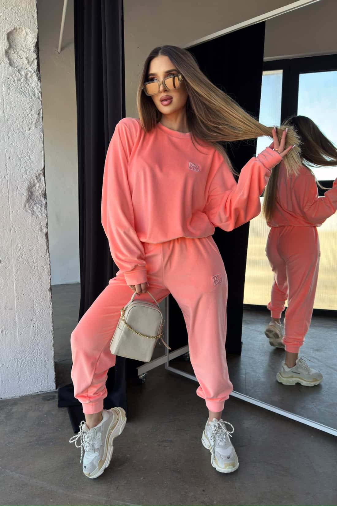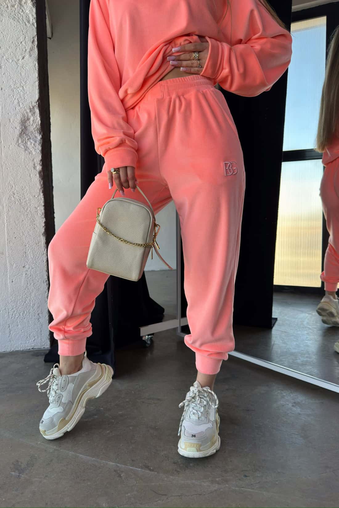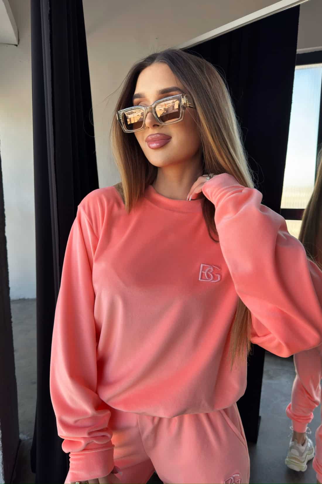 Opis produktu: Dres damski BG MIA z miękkiego weluru. Klasyczna bluza bez kaptura z logowaniem marki BG na piersi. Spodnie posiadają kieszenie, gumę oraz sznurek w pasie, wyhaftowane logo BG na nogawce.