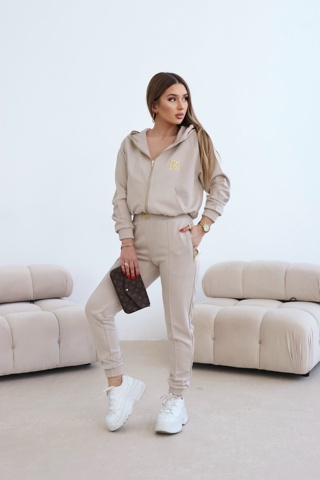 Opis produktu: Komplet zamszowy BG NEW ESSENTIAL w kolorze beżowym. Rozpinana bluza z kapturem ozdobiona złotym haftem BG na piersi oraz złotym haftem z logo marki na kapturze. Złoty, metalowy suwak wszyty również na kapturze dookoła głowy. Spodnie posiadają gumkę w pasie oraz złote, metalowe suwaki w kieszeniach. Na środku paska w spodniach haftowane logo marki BG. Spodnie oraz bluza posiadają ozdobne przeszycia. Spodnie modelujące sylwetkę.